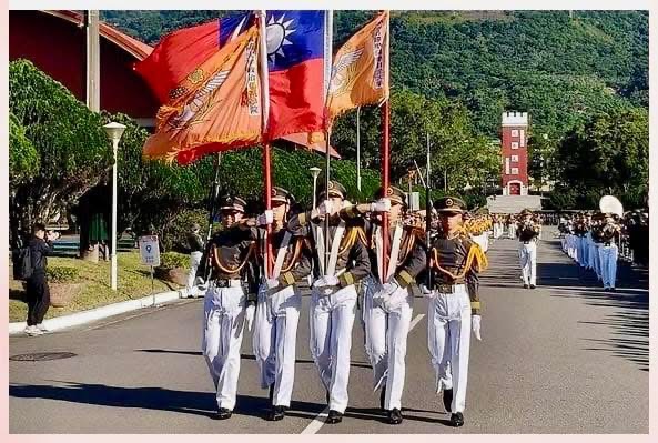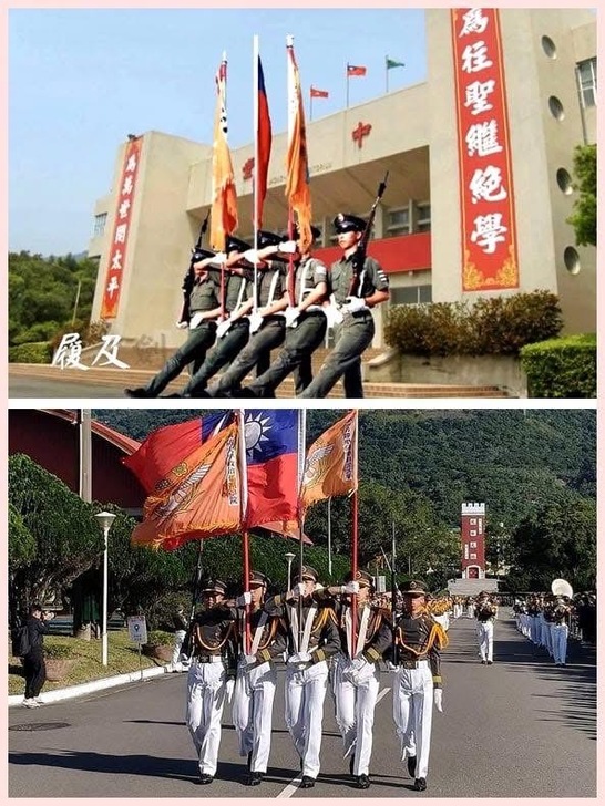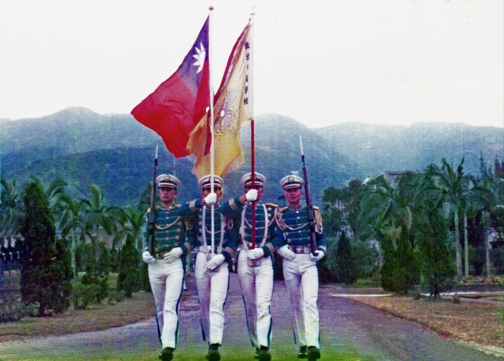 我想了下,當年儀隊隊員是由軍校二年級學生中遴選,三年級時再由儀隊隊員中選任護旗兵,四年級時由護旗兵晉升為掌旗官,其間都要經過嚴格集訓,而後找出當年的照片,回覆:依據我以前的經驗~軍校旗隊的左護旗兵是左手托槍,右護旗兵是右手托槍。現在看到國防大學政戰學院旗隊的左護旗兵改回「正常」的右手托槍。對此,我認為:以往「左護旗兵用左手托槍」應是考量對稱的美觀與避免槍尖勾到旗面。如今看國防大學政戰學院旗隊的左護旗兵改回「正常」的右手托槍,引發我們這些曾經親歷者的好奇~到底各種軍種旗隊與國際間的旗隊如何選擇?何者正確?結果是:沒有對錯,只是選擇的標的不同。
