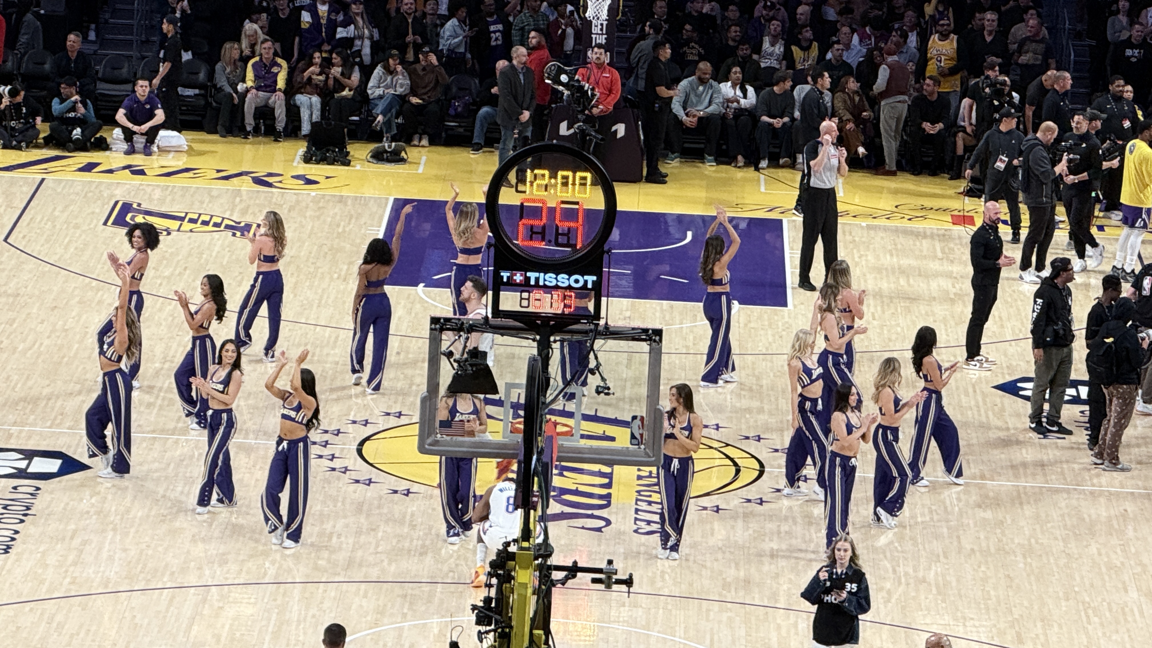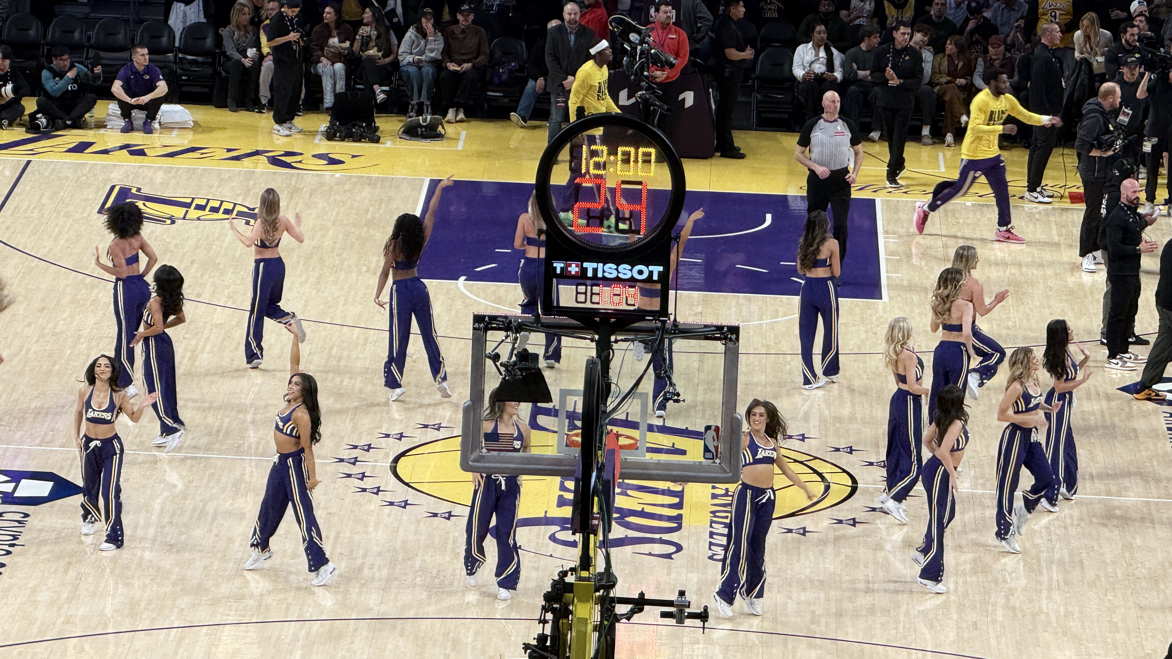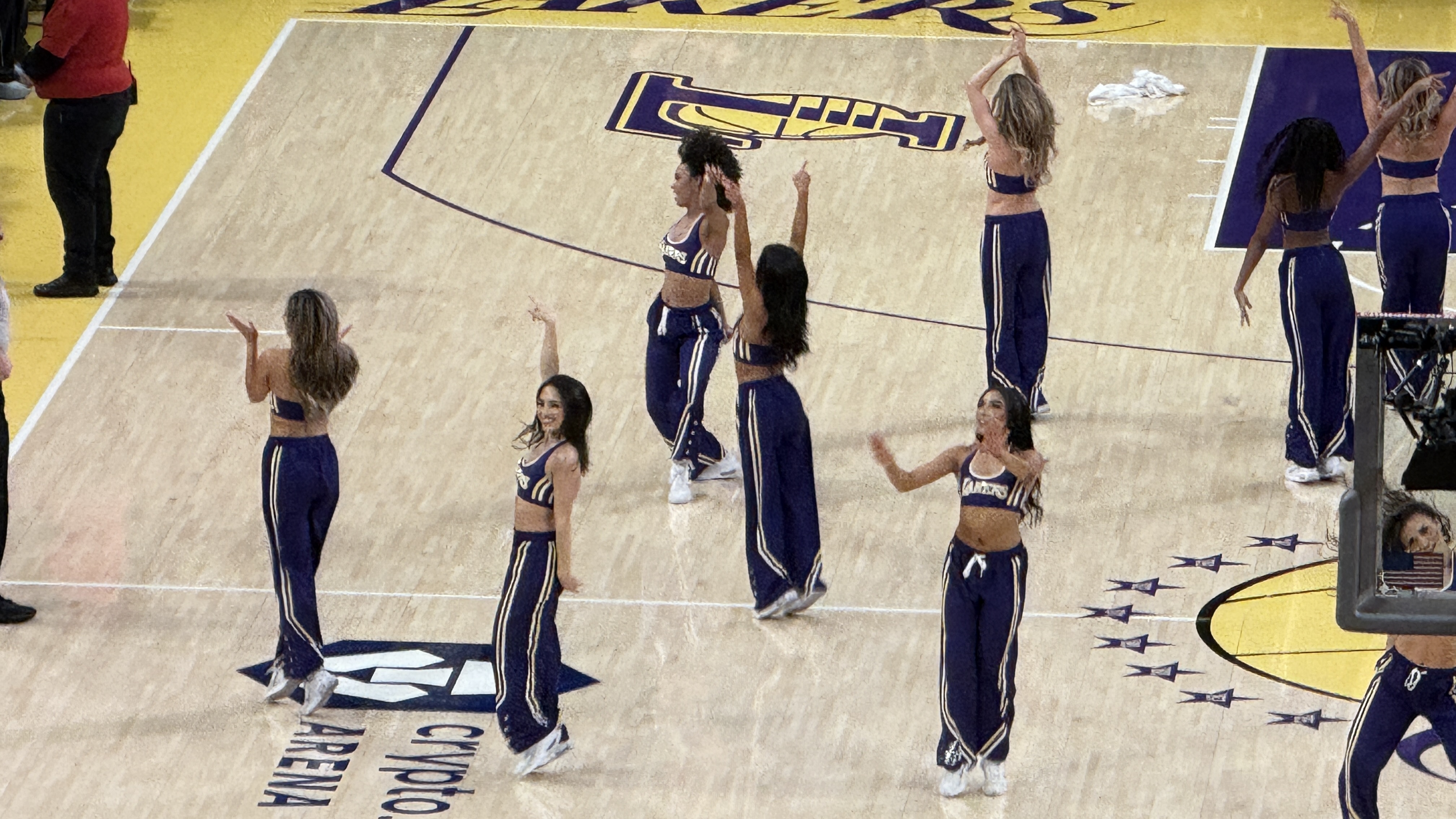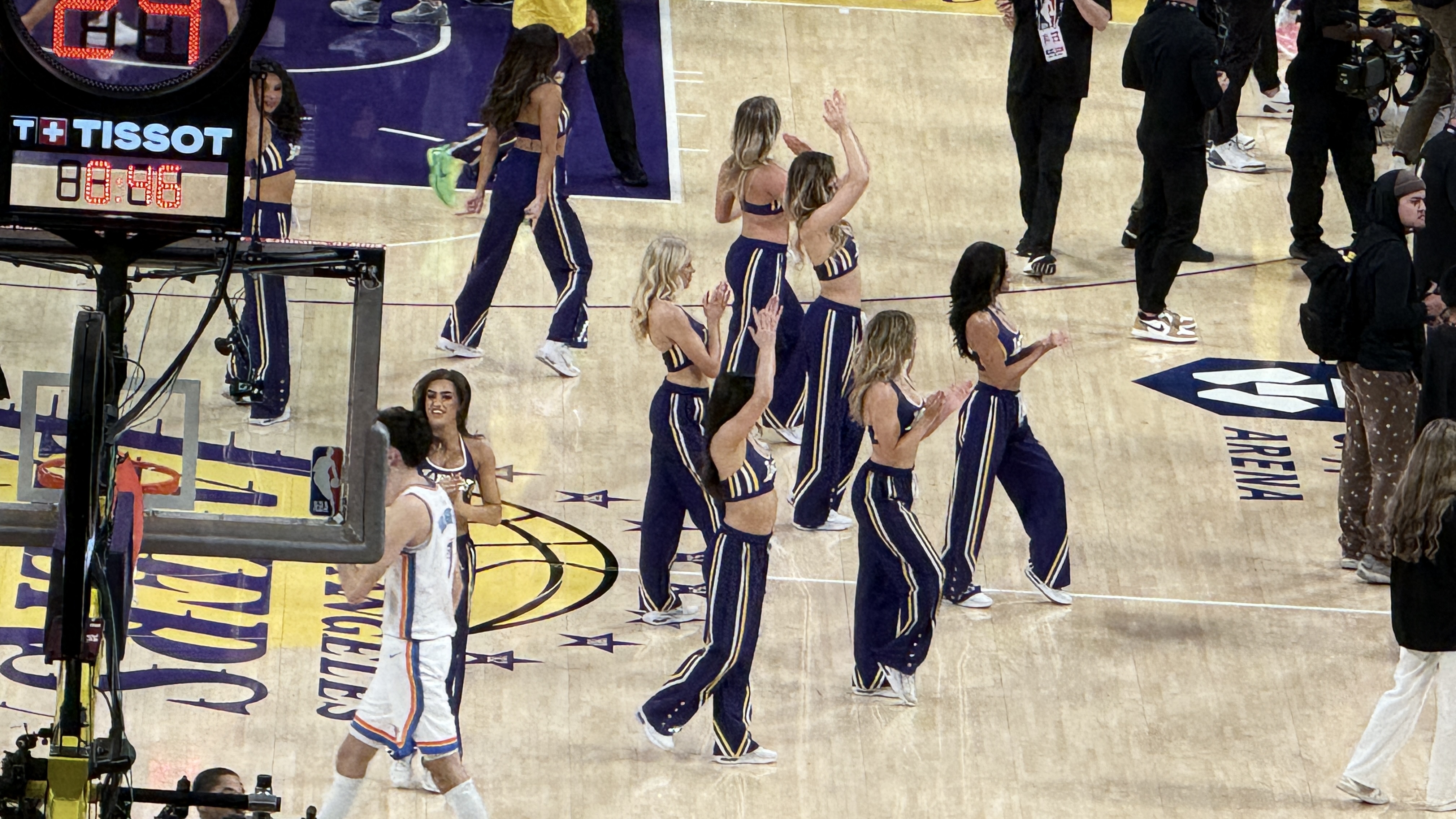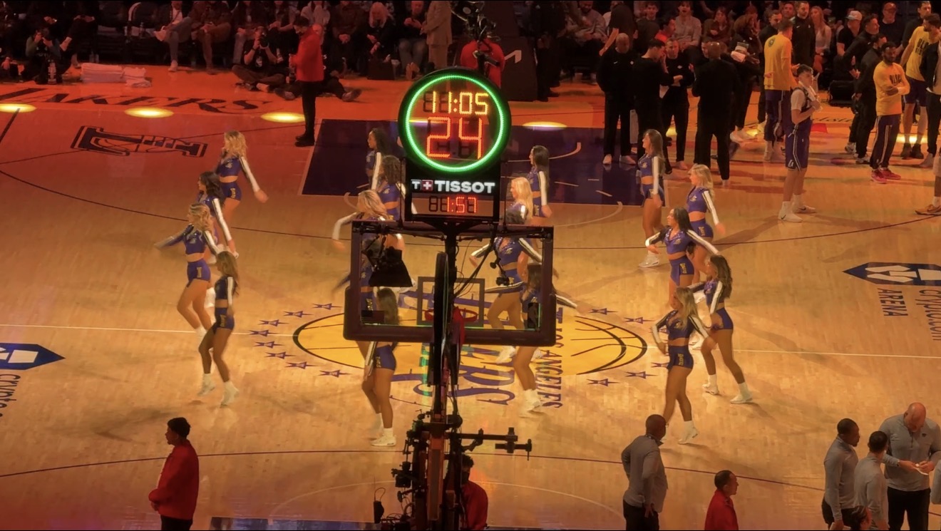 在2026年2月9日週一晚上7:00 PM(美國西岸時間)/台灣時間2月10日凌晨11:00 ,於加州洛杉磯市中心的Crypto.com Arena舉行的常規賽洛杉磯湖人(Lakers)對奧克拉荷馬雷霆(Thunder)比賽當中,有兩隊啦啦隊及舞蹈隊參與場邊表演: