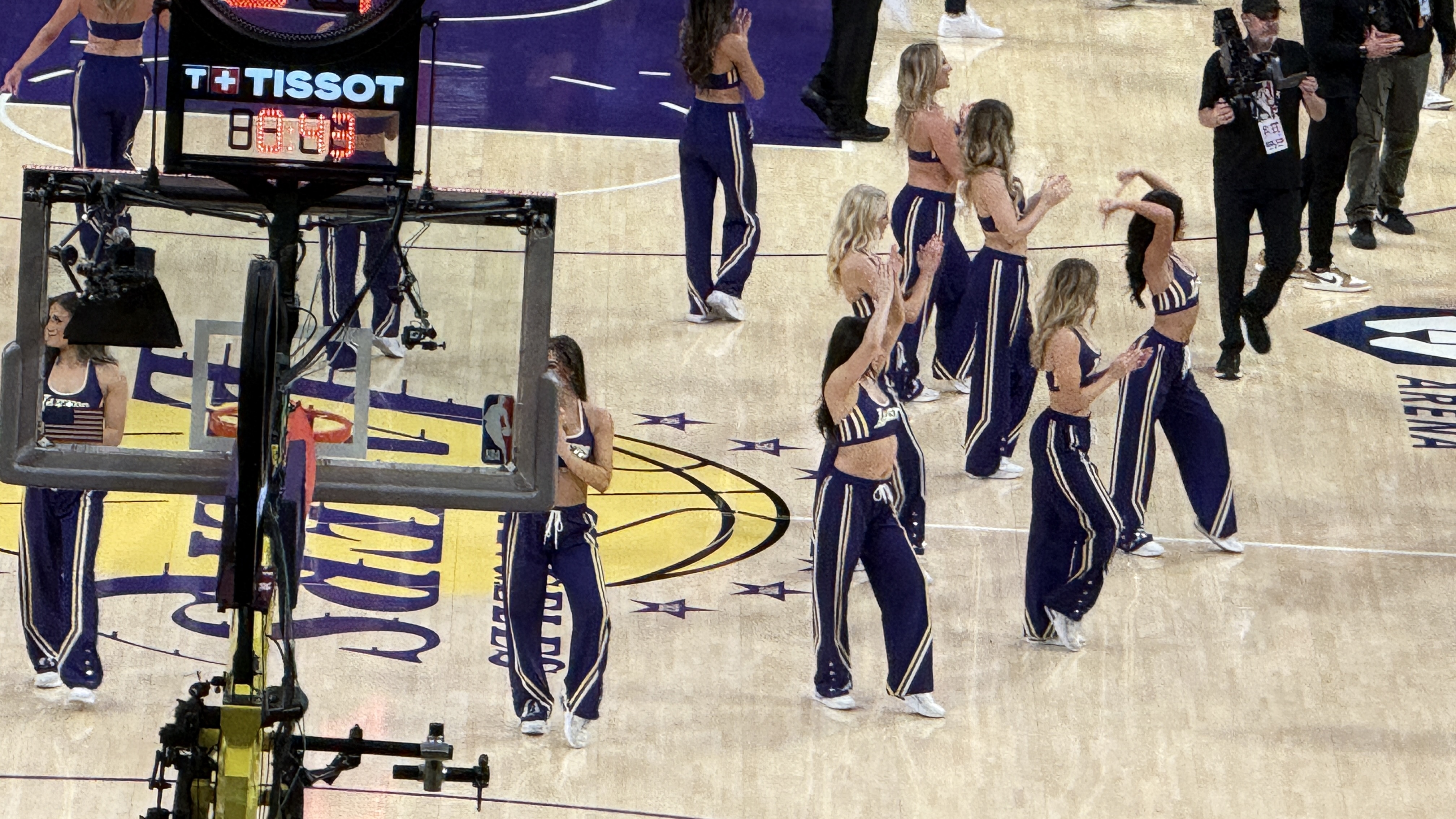 但是這場比賽中上場的的表演隊伍,都是屬於 Los Angeles Lakers 主場啦啦舞蹈隊(Laker Girls)。