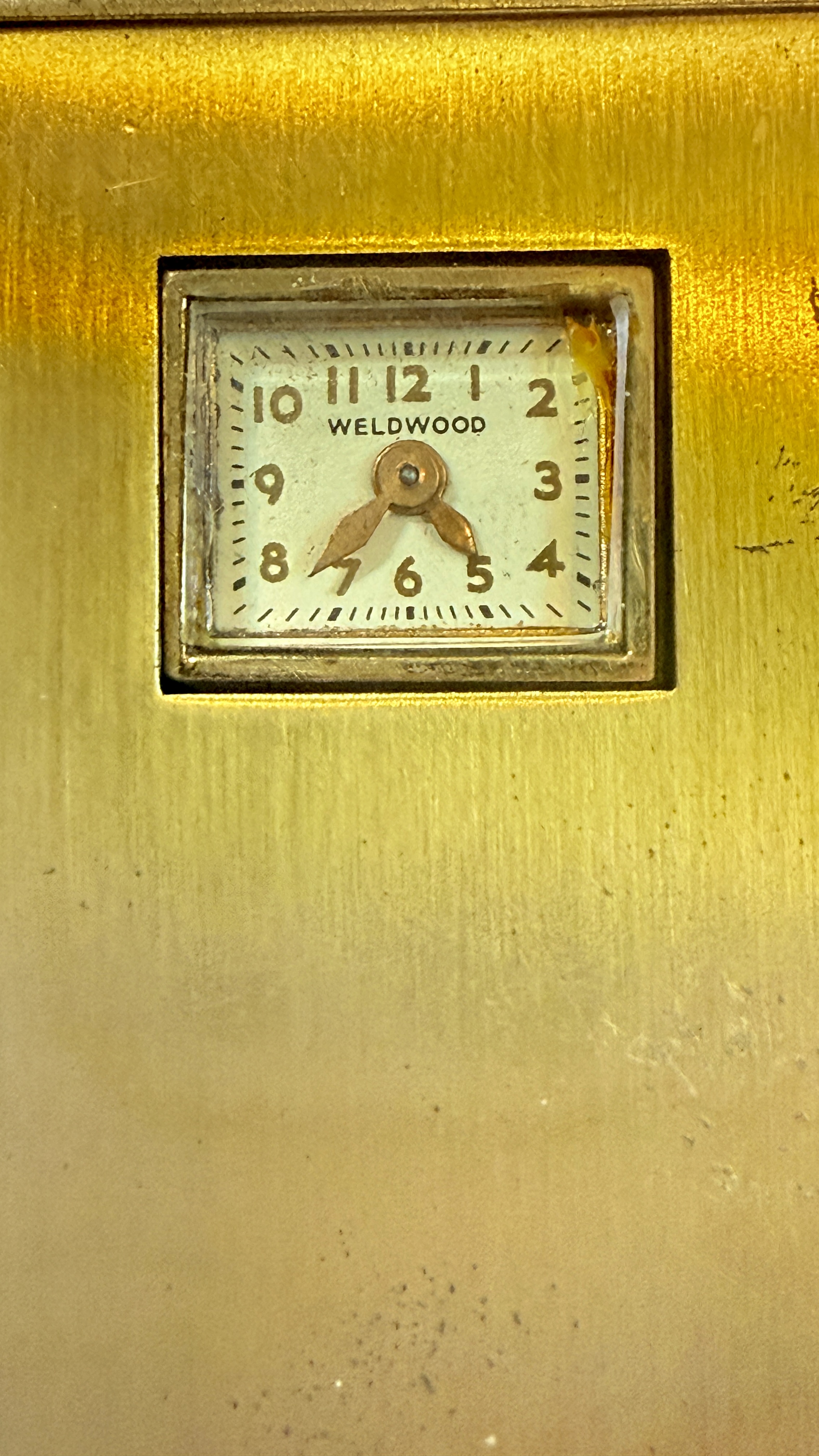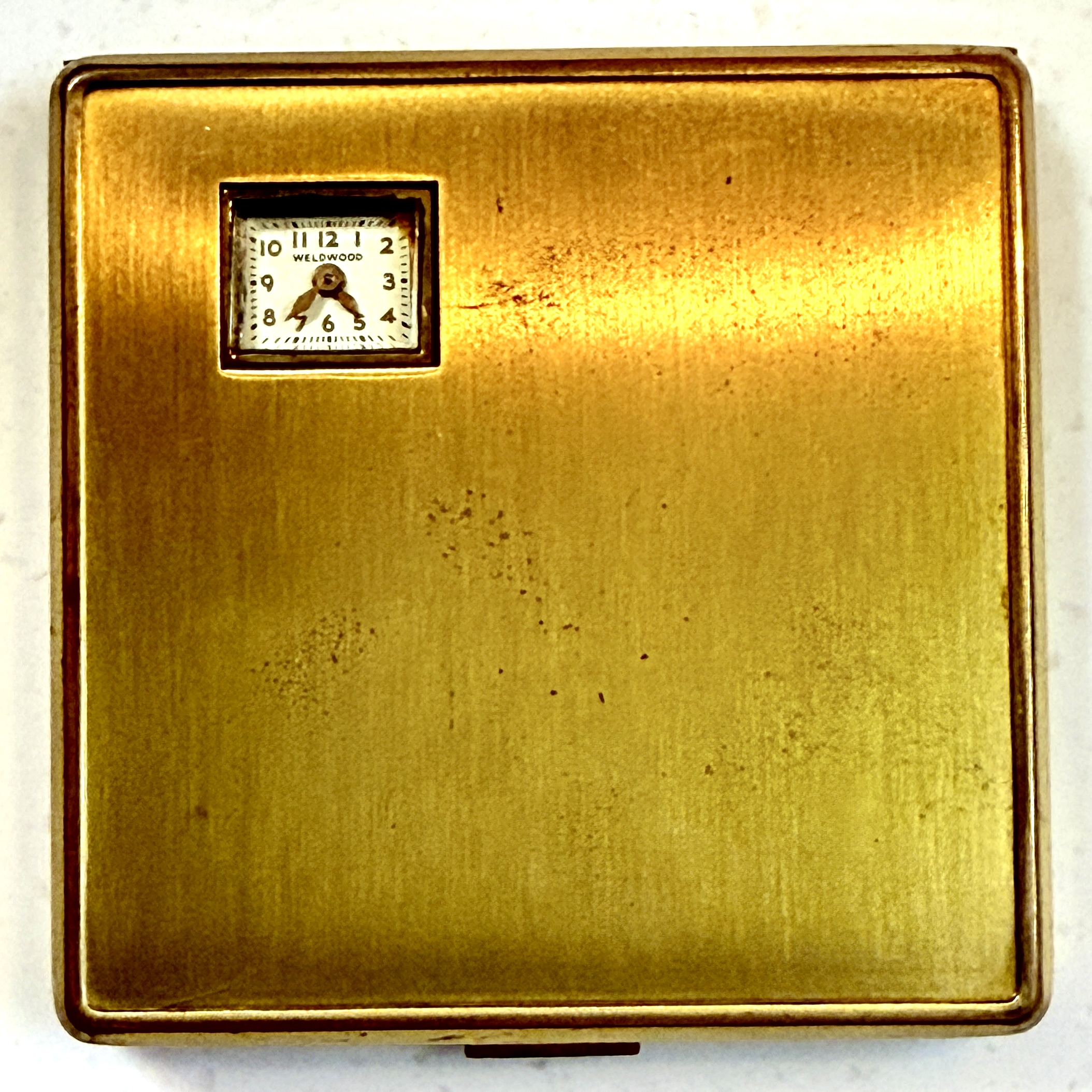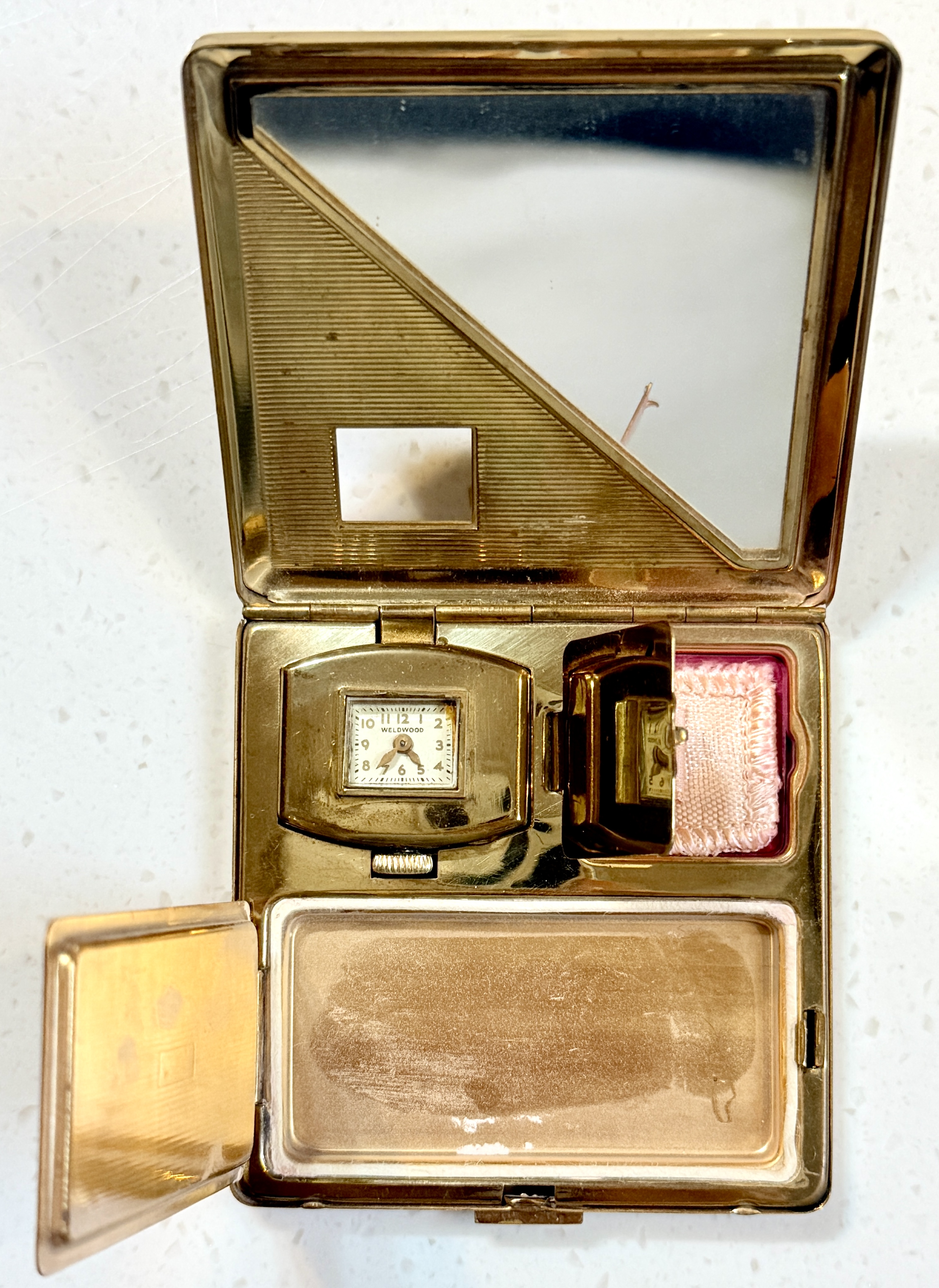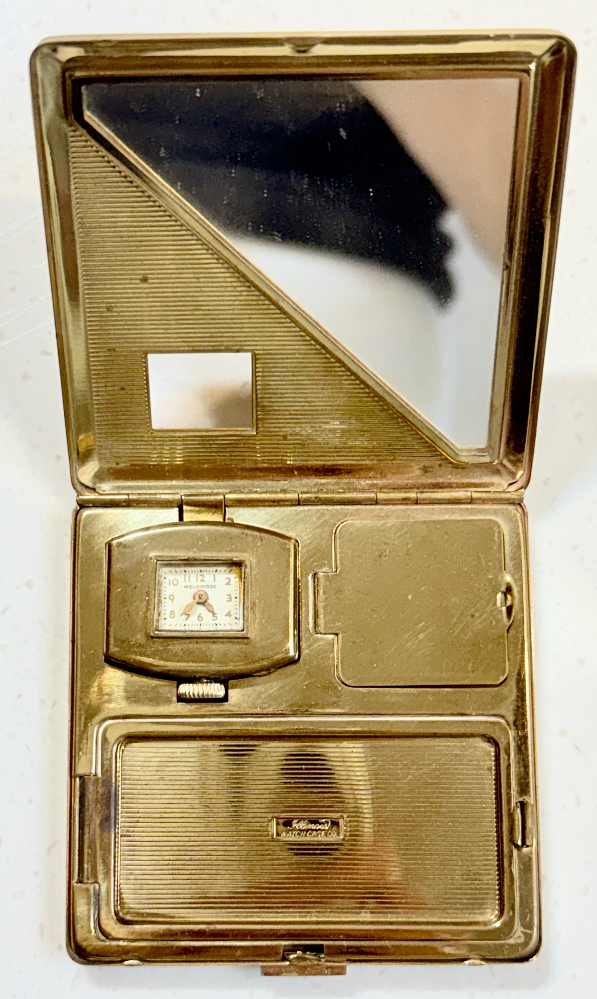 此為一件 1935–1945 年間,美國 Illinois Watch Case Co. 外殼、搭配貼牌 WELDWOOD 機芯的 Art Deco 女性粉盒錶。