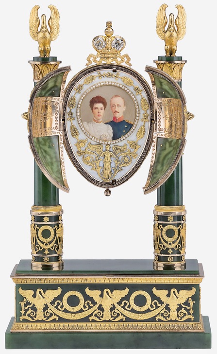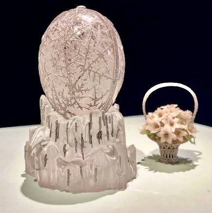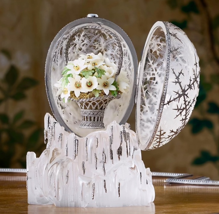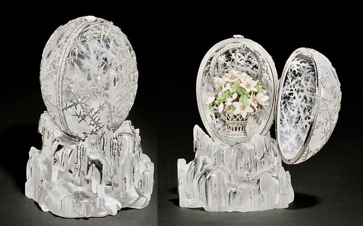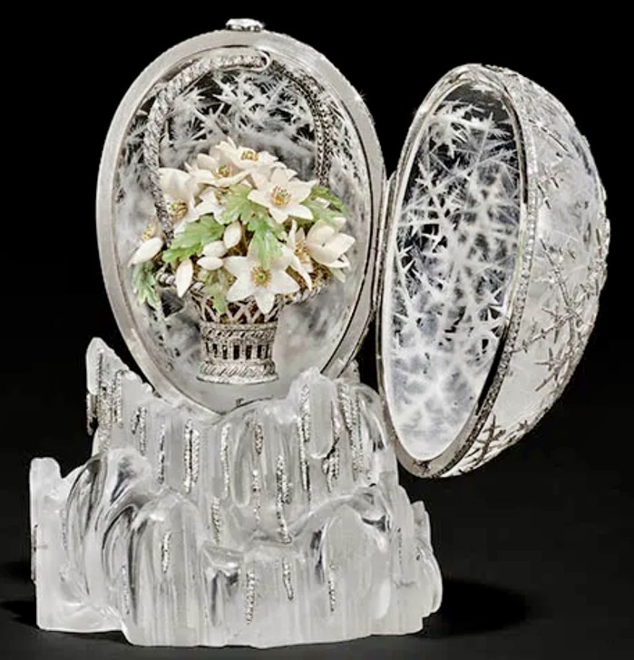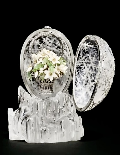 背景:這是 1913 年由沙皇尼古拉二世送給皇太后瑪麗亞·費奧多羅芙娜的復活節禮物。這枚蛋由岩水晶(冰雕質感)製成,鑲嵌大量鑽石。冬日彩蛋在1913年製成時,被視為工藝巔峰~冰晶雕刻+鉑金結構,價值2萬4600盧布,而當時莫斯科一般工人的月收入不過30盧布。俄國皇室被推翻後,藝術品也被出售,冬日彩蛋在1920年代被英國古董商人以450英鎊的價格買走,之後幾經易手,一度被認為遺失,直到1994年才現身於佳士得拍賣。1994年拍賣時,冬日彩蛋以逾700萬瑞士法郎(當時約1.76億元台幣)的價格拍出。2002年,冬日彩蛋再度現身於拍賣,以960萬美元(約3億元台幣)落槌。這已是它第三次在佳士得成交,此次再度刷新了法貝熱作品的最高拍賣紀錄。