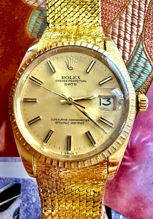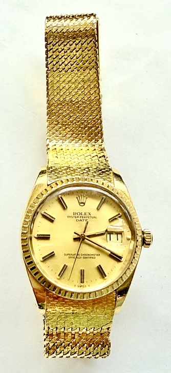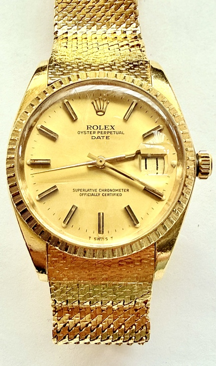 更精確地說:1514是一個Rolex Oyster Perpetual Date的參考編號(reference),不是「只屬於編織金錶帶」的特有型號。它確實常見於18K金款,而且市場上能看到配18K金mesh/woven(金網編織)錶帶的1514,甚至有許多1979、1980年的實例。但是這種金網編織錶帶是搭配形式,不是1514本身的專屬定義。