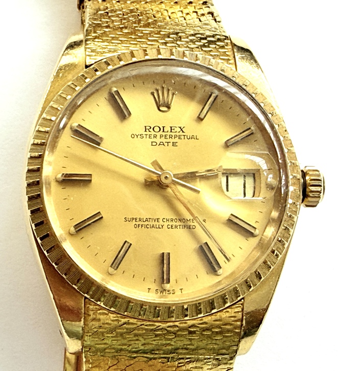 型號定位:這是Oyster Perpetual Date系列的一部分,屬於1500系列的變體。錶殼直徑約34mm,多為18K黃金材質,配備自動機芯(如Cal.1570,非快速調日期版本)。