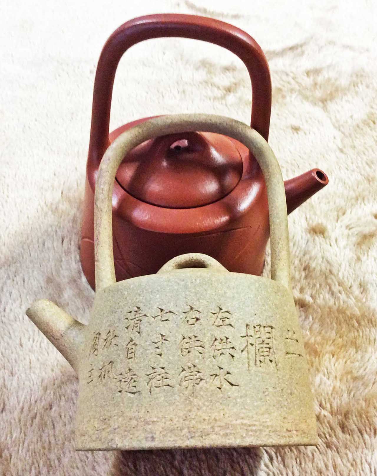 兩把段泥與朱泥的井欄提樑壺,是在十多年前陸續收到的,與戒指作比較,可知壺容量小,應屬文房類的水滴,不論段泥與朱泥,從工、土上判斷,我以爲是文革前到民國初年的作品,因為1958年宜興廠建廠後,私營、自營戶都消失了,加上幾個政治運動下來,沒人「敢」作這樣文人氣的壺,尤其段泥應屬民初帶紅顆粒的泥料,上面刻有如下字畫: