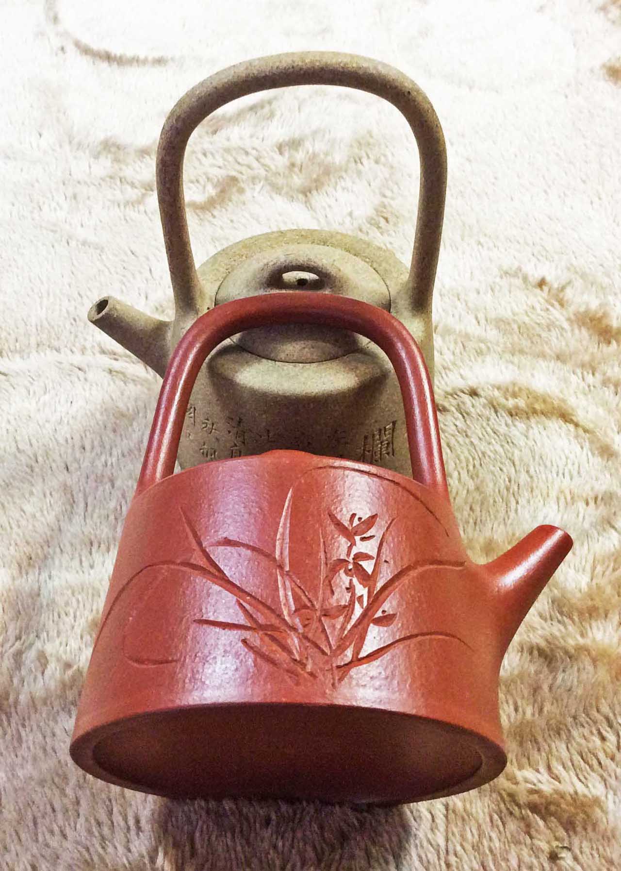 朱泥的井欄提樑壺,底款為一帆風順、帆船圖的順記,壺身刻款為知秋翁題("知秋翁"的號,只見到劉永濟【1887一1966】用過。劉永濟字弘度、宏度、號誦帚,晚年號知秋翁,室名易簡齋,晚年更名微睇室、誦帚庵,湖南省新寧縣人。1911年就讀於清華大學。1916年畢業于清華大學語文系。歷任長沙中學教師,瀋陽東北大學教授,武昌武漢大學教授兼文學院院長,浙江大學、湖南大學及武漢大學語文系教授、文學史教研組主任。湖南文聯副主席,中國作家協會武漢分會理事。),一面壺壁刻有:一眼泉,四時流,百年伴,千年福。另一面刻一株蘭花。