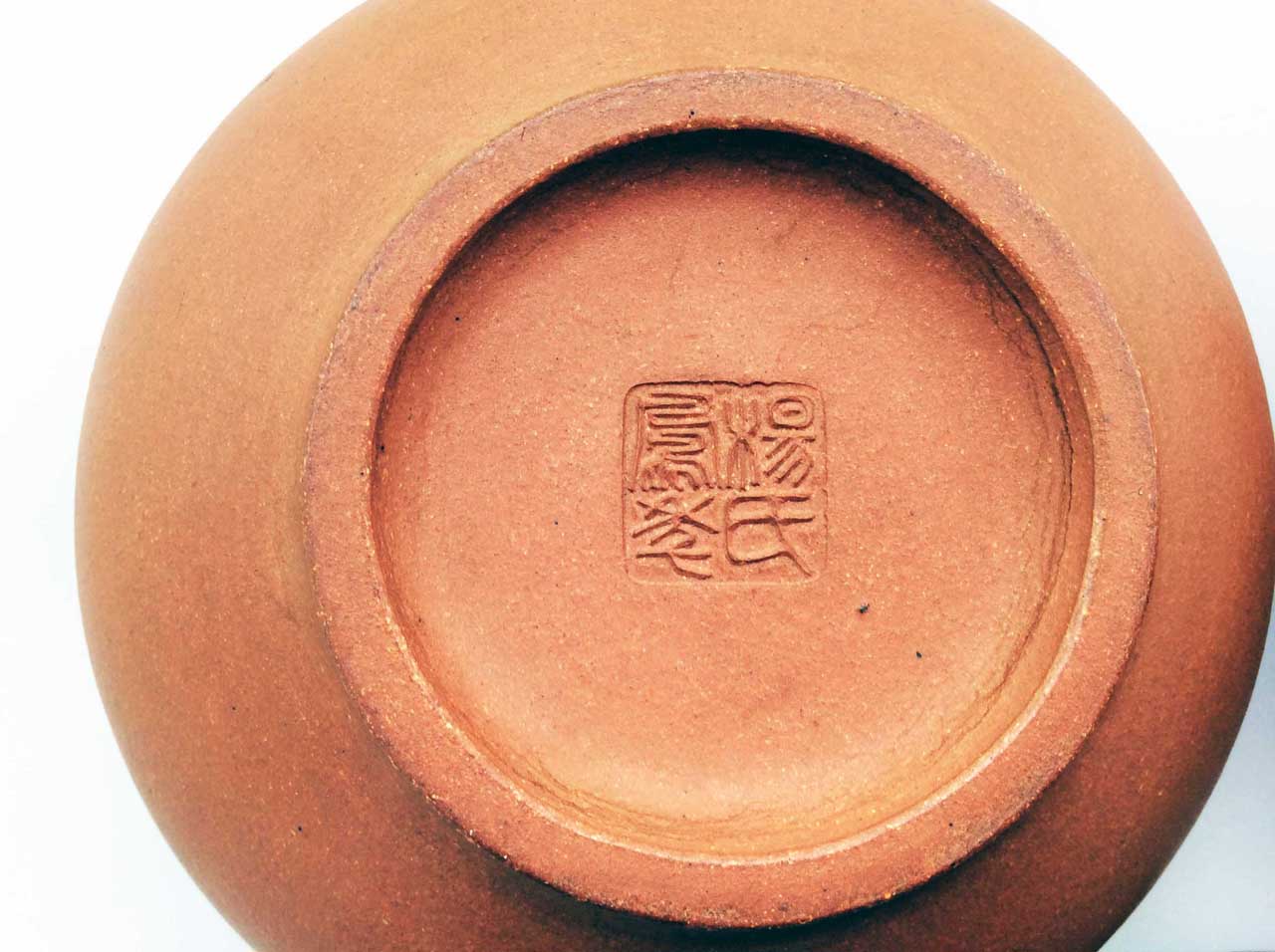 此壺紫砂質為嘉慶年間特有的淡肝色紫砂(見宜興陶器圖譜p199),底款為「楊氏鳳年」,楊鳳年為清乾隆~咸豐年間製陶最著名的女藝人(約1774~1855),字玉禽,是楊彭年、楊葆年之妹。由女性製壺藝人來詮釋這把女象之壺,除了令人更感覺到她的圓潤,另外,這極可能也是存世唯一的「女性製壺藝人楊鳳年製作的乳釘壺」。