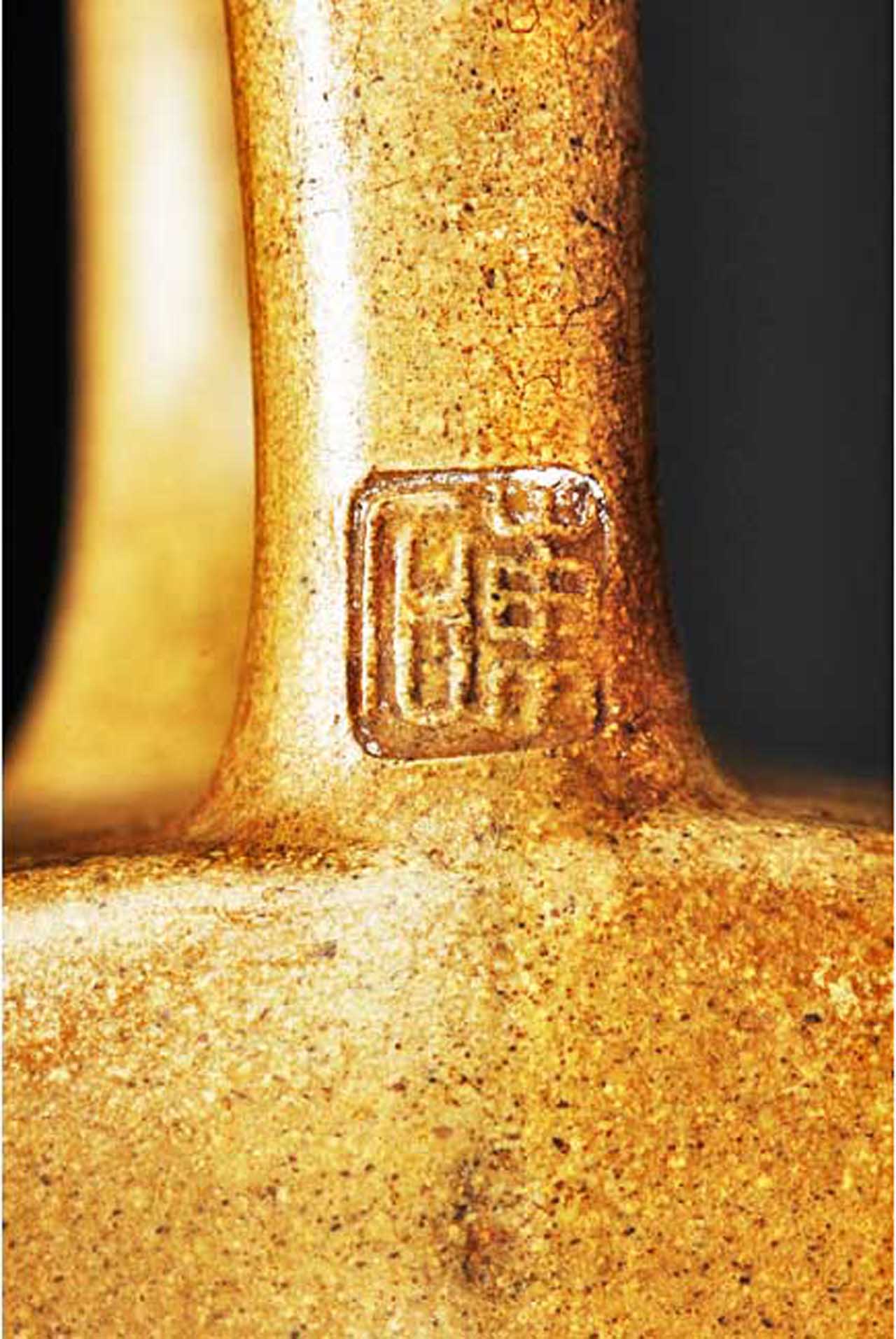 3、清「陽羨王東石製」底款段泥刻詩文扁石壺,其蓋旁壺身上刻大篆金文「東石作壺其永寶用」,2013.11.24 Bonhams邦瀚斯公司在香港金鐘拍出價HK$ 4,120,000。16.3厘米寬