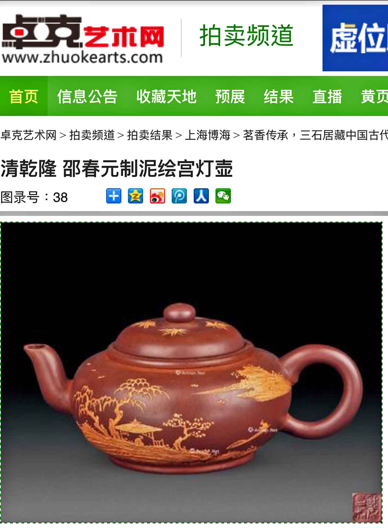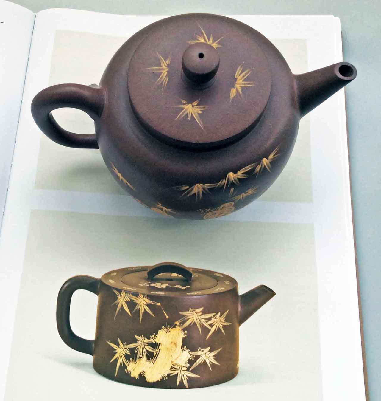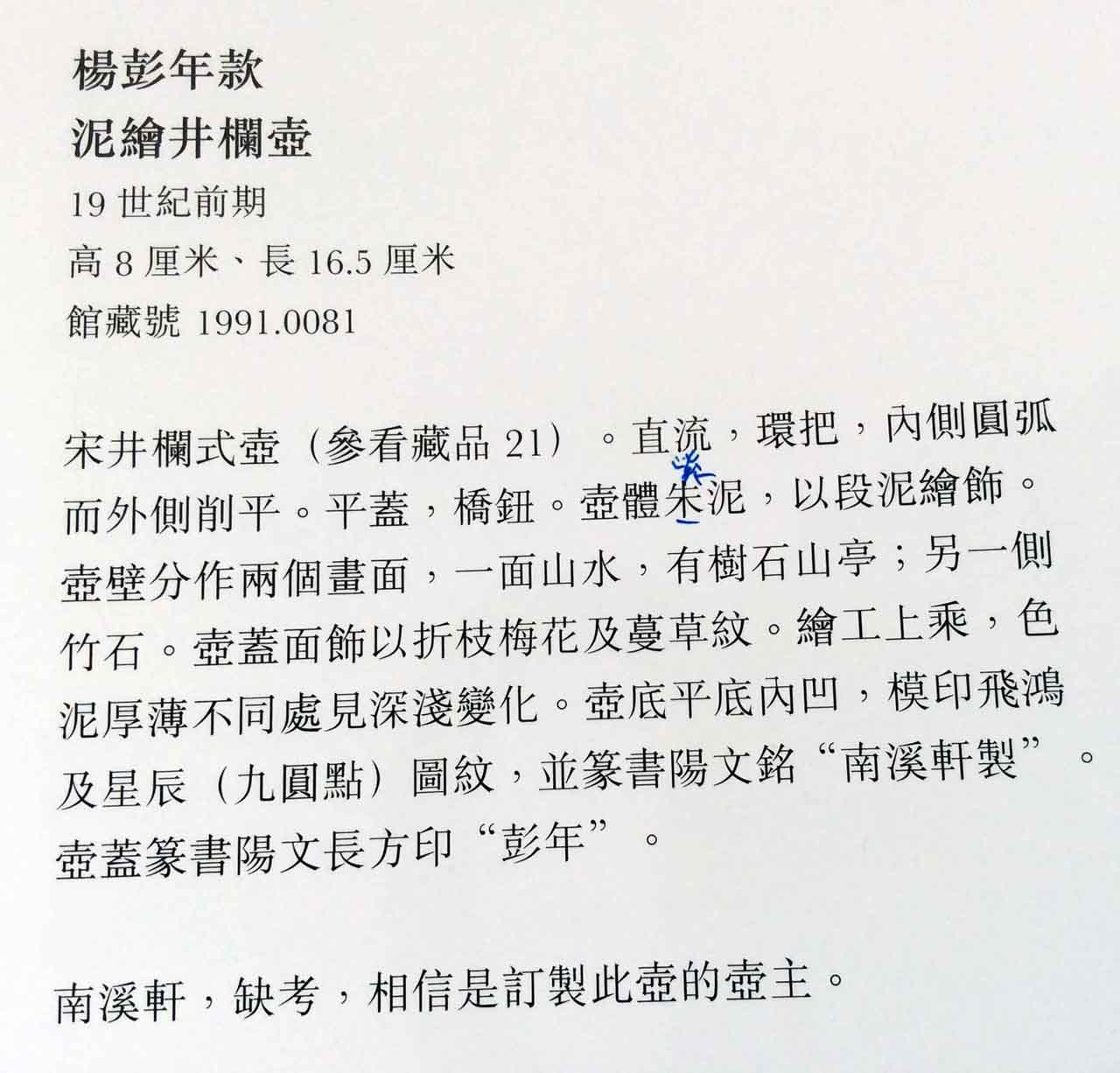 9月19日讀書,碰巧看到香港中文大學文物館出版的「竹山汲古」宜興紫砂ㄧ書裡,有把楊彭年款泥繪紫砂壺,紫泥質與竹石圖相似,壺的長度同為16.5公分,但是我的高度9.5公分高於書上的8公分。書上評斷這把彭年泥繪壺為19世紀前期,與我的這把壺年齡相當,算是伯仲兄弟壺。