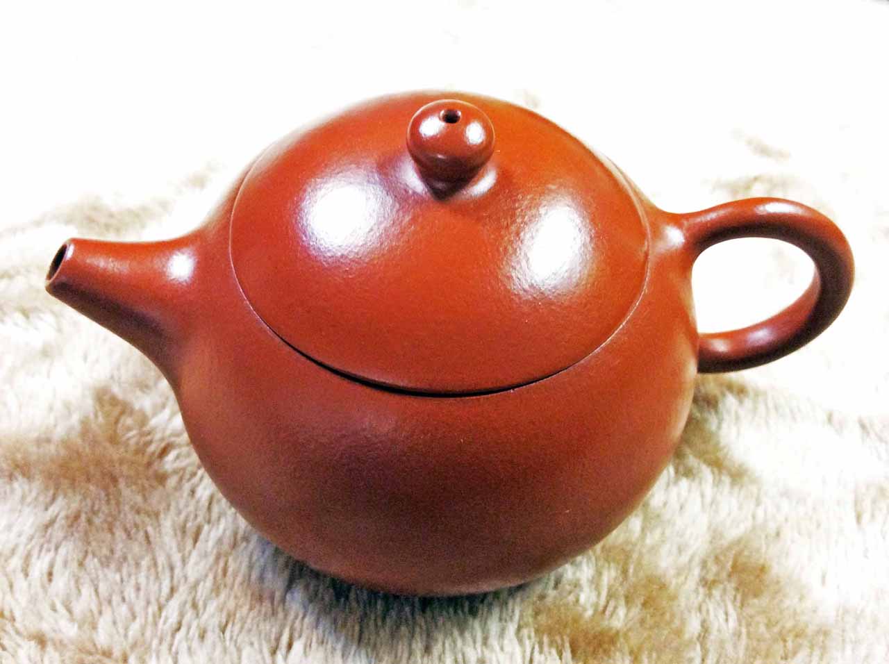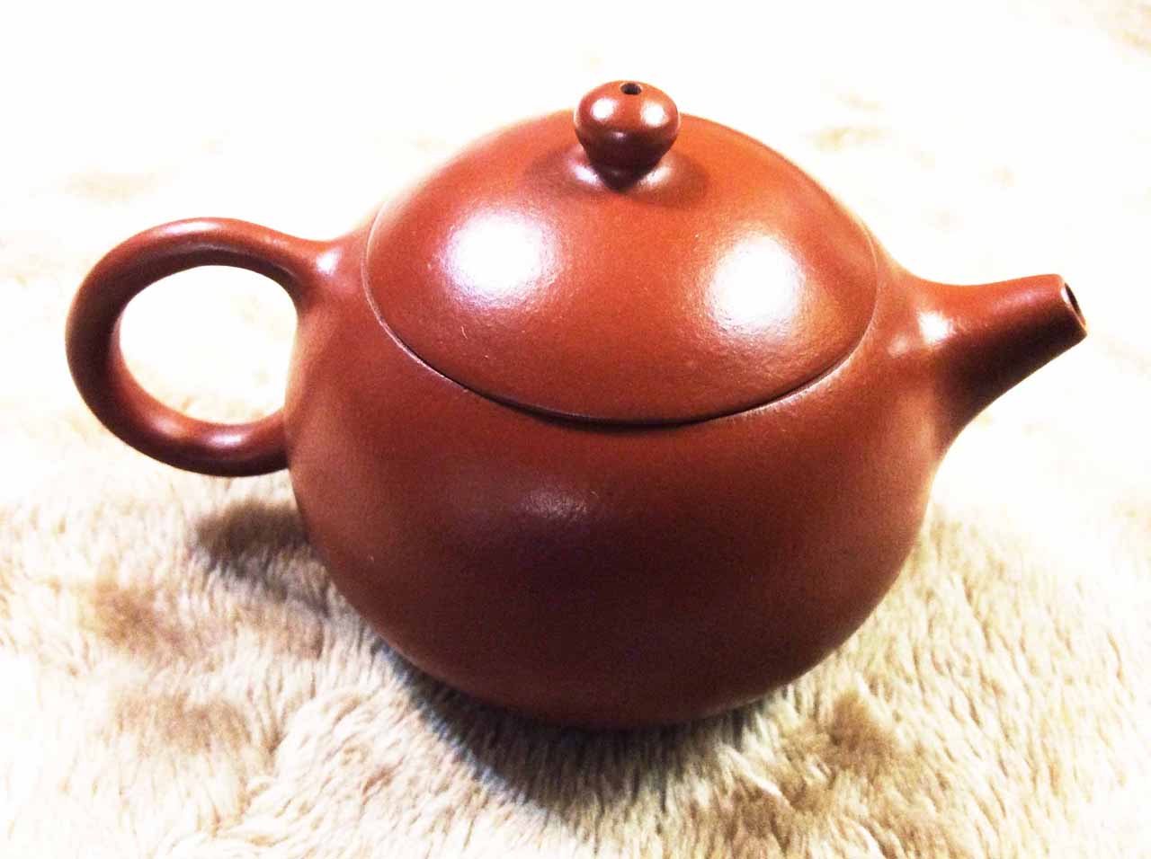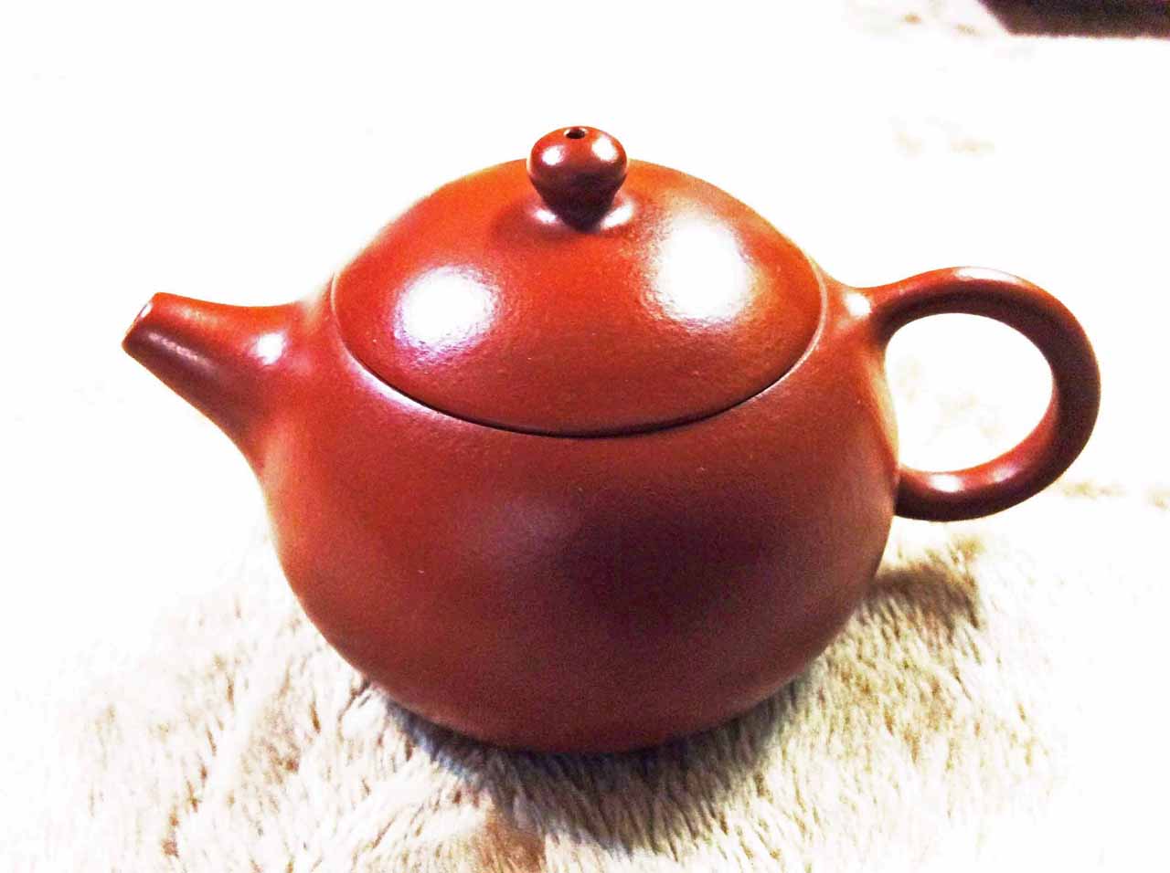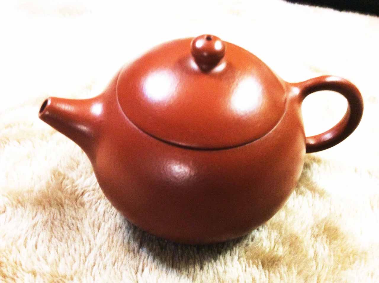 2015年10月24日下午品嚐同學送的黃山毛峰綠茶時,找出ㄧ把早年收的「宜興松亭自造」的倒把西施朱泥壺。