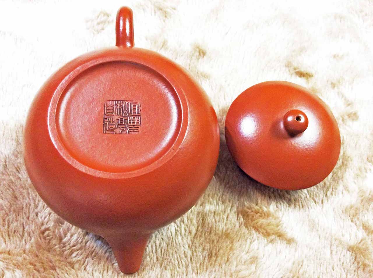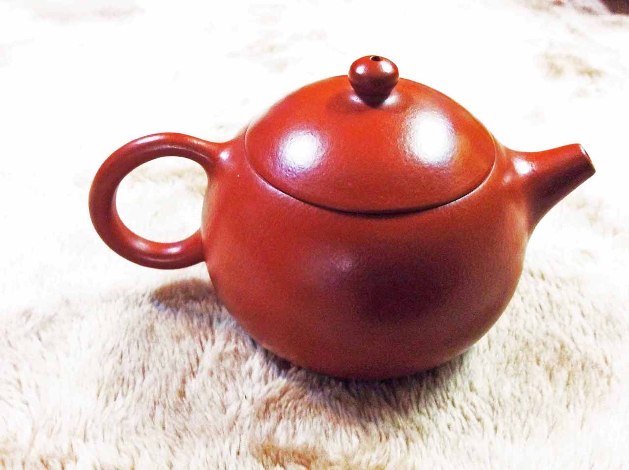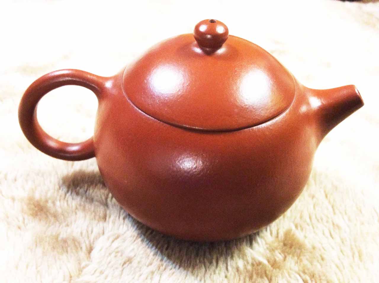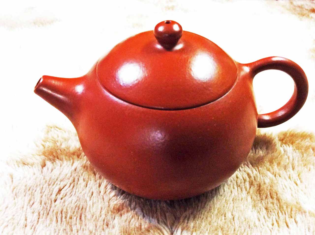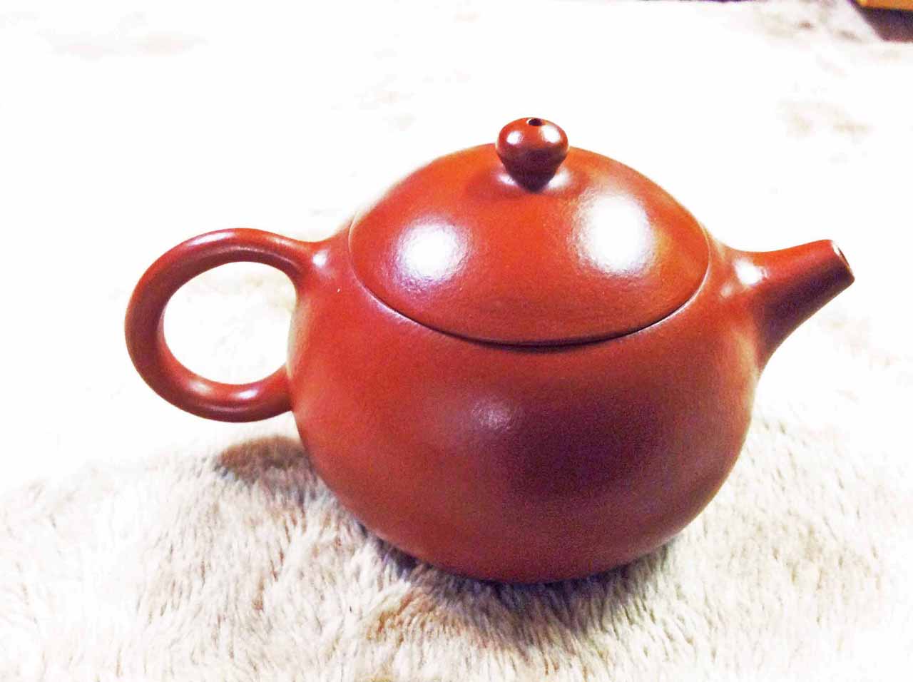 2015年10月24日下午品嚐同學送的黃山毛峰綠茶時,找出ㄧ把早年收的「宜興松亭自造」的倒把西施朱泥壺。