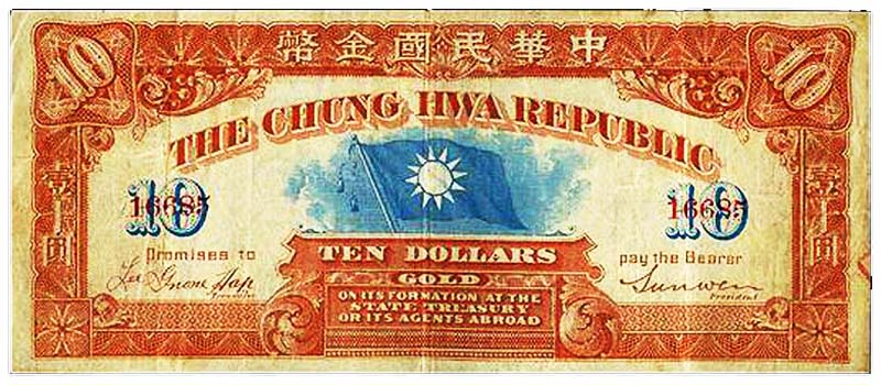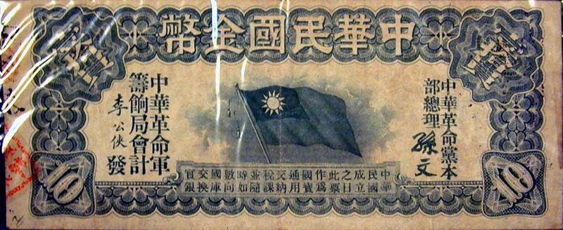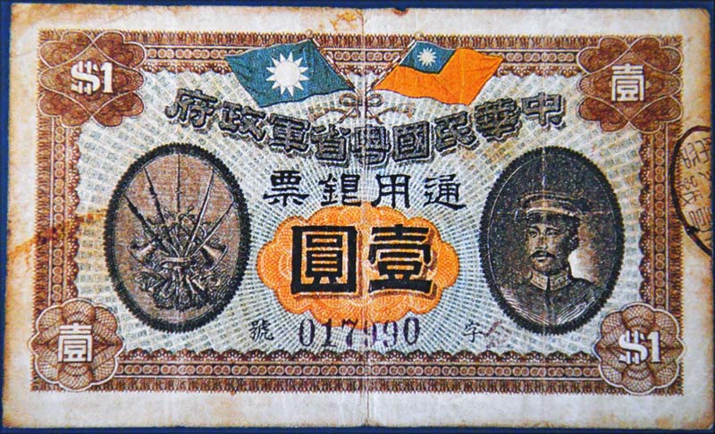 *民國元年發行之中華民國粵省軍政府通用銀票壹圓.上有黨旗與國旗.澈底貫徹了孫中山先生的主張.著戎裝者為陳炯明.