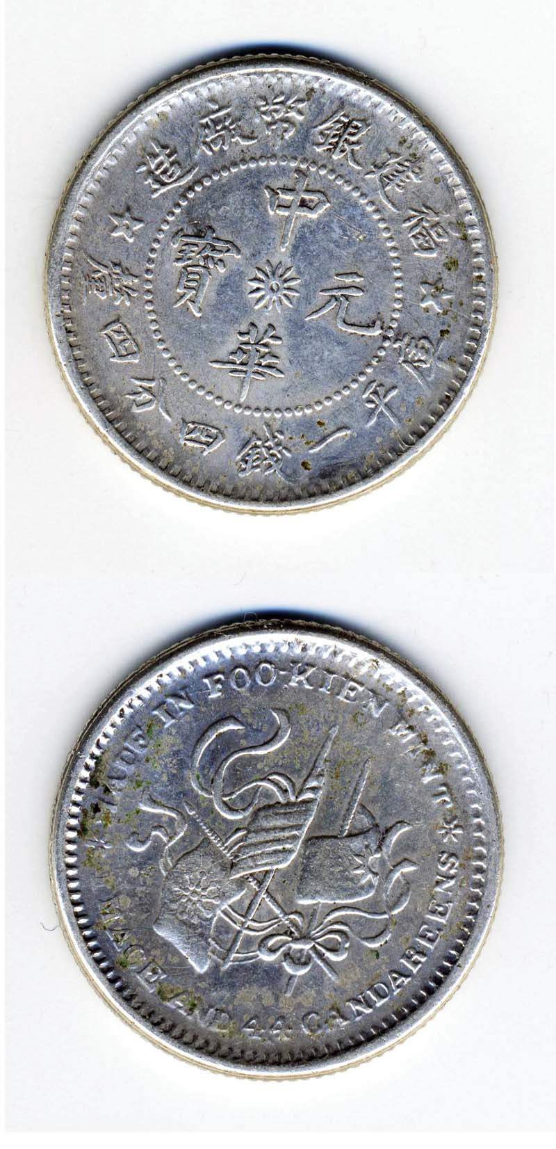 *民國元年發行之中華元寶福建銀幣廠造庫平一錢四分四釐.上為十八星旗.五色旗.青天白日旗.