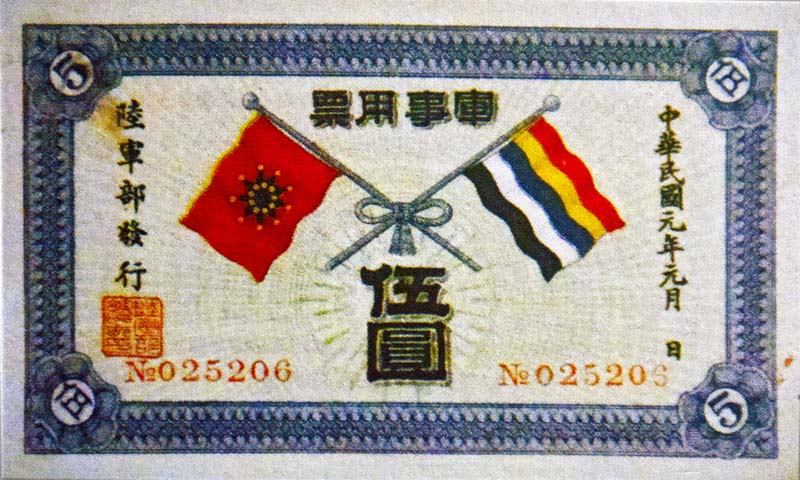 當此同時,粵省軍政府在民國前一年十一月十二日成立,胡漢民任都督,陳炯明任副都督,為了解決財務,發行了「中華民國粵省軍政府通用銀票」,計分伍毫、壹圓、貳圓、伍圓四種面額,發行額共一千九百萬圓。通用銀票由上海商務印書館以石版印刷,票面正中央,印有青天白日滿地紅國旗(右)與青天白日黨旗(左)的交叉圖案,右側為橢圓形陳炯明戎裝頭像,左側為軍號、步槍、指揮刀組成的橢圓形圖案,這是「青天白日滿地紅國旗」與「青天白日黨旗」第一次出現在中華民國境內的鈔票上。