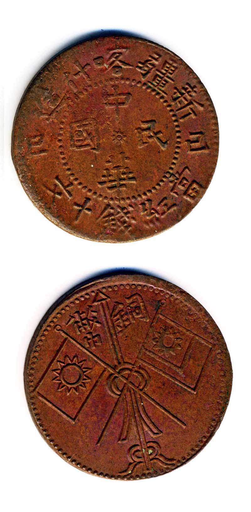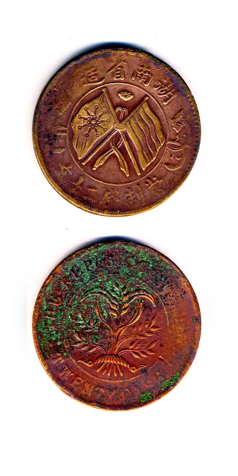 *民國元年發行之湖南省造當制錢二十文.上為五色旗與鐵血十八星旗.