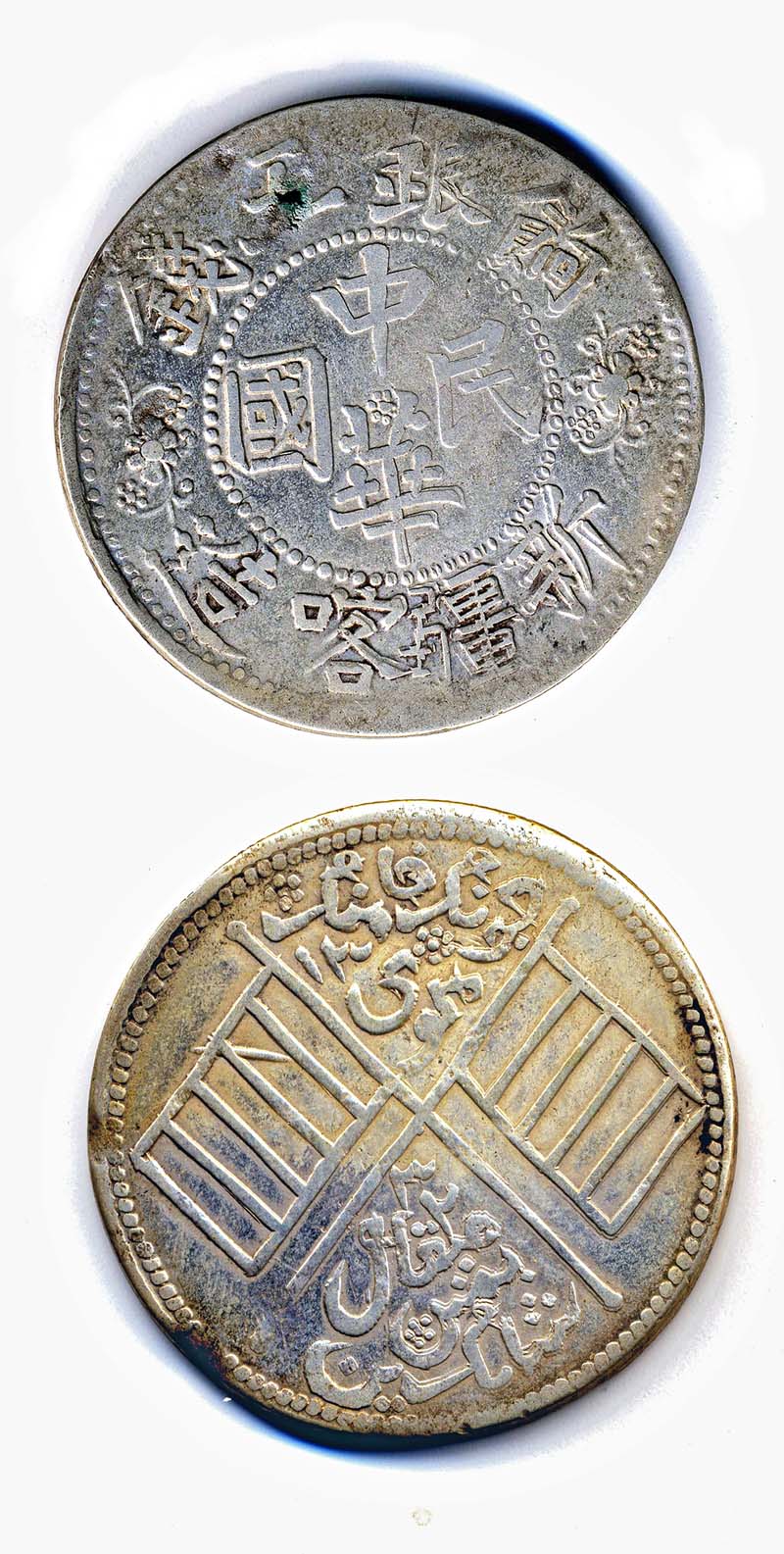 *民國三年發行之中華民國餉銀五錢.新疆喀造.上為五色旗