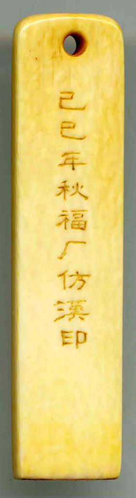 這枚印文刻「平安」兩字的象牙章,很小,並狹長,6.3*1.4*0.6公分,邊款刻的是「已巳年(1929年)秋福厂仿漢印」,因為是撰寫中華民國國璽印面的王福厂所刻,加上小巧可愛,所以毫不猶豫的收藏下來。
