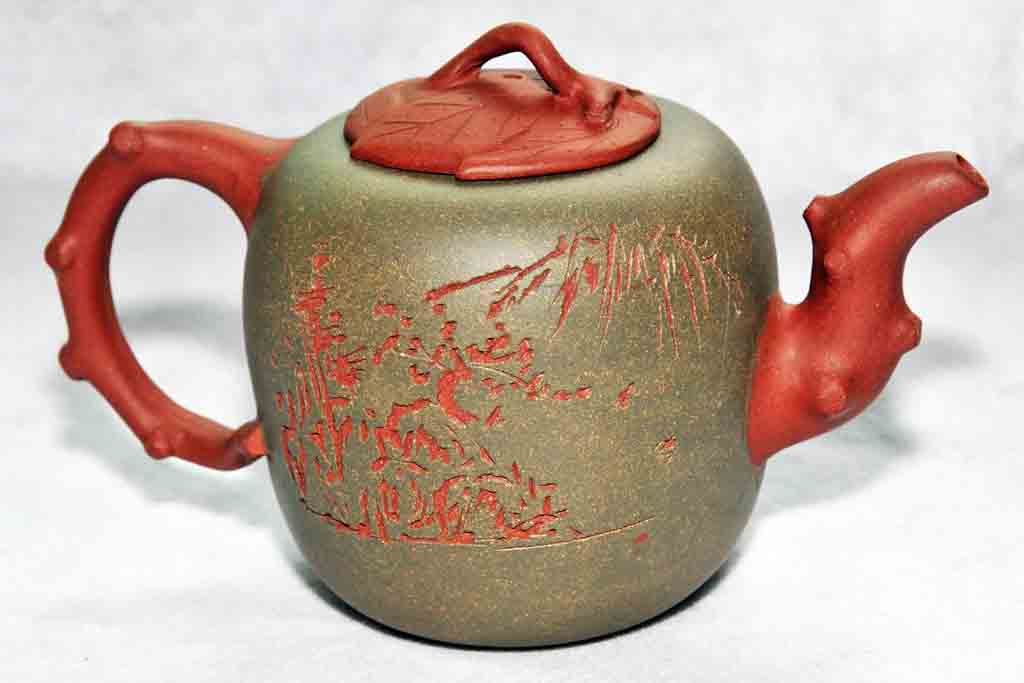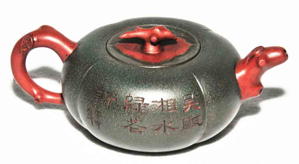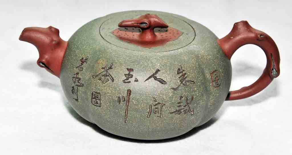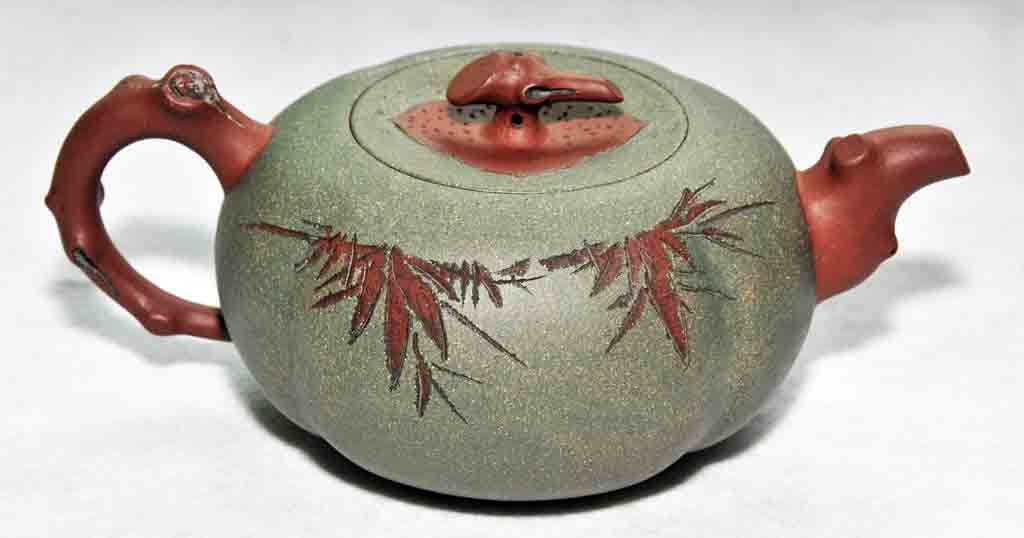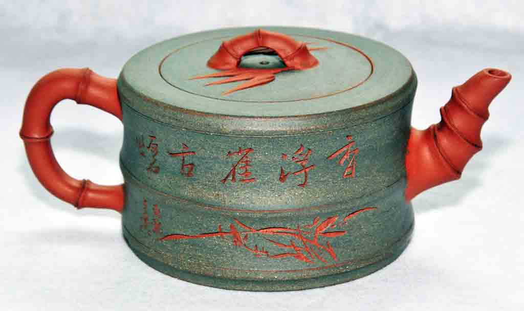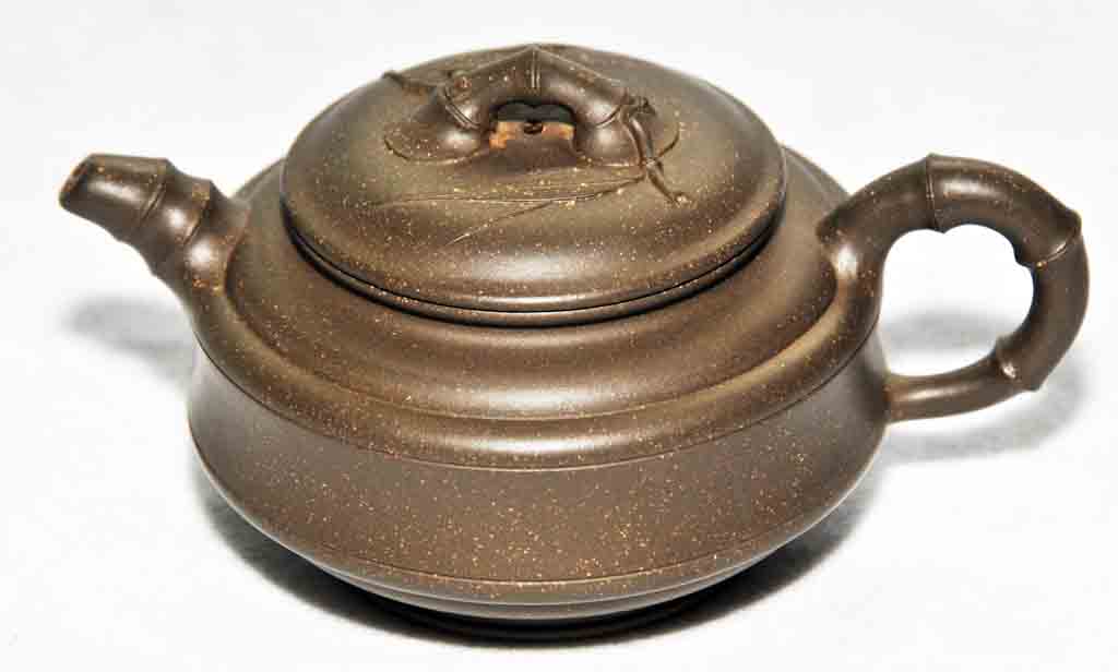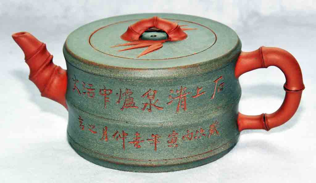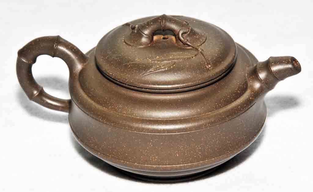宜興蜀山陶業生產合作社出品(1955-1958),可心(蓋,朱可心),雲石(諸葛勳,1897-1957)刻,竹節壺。