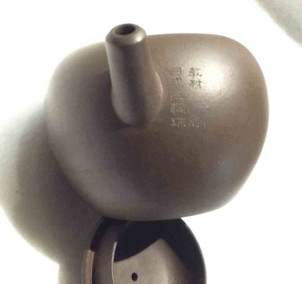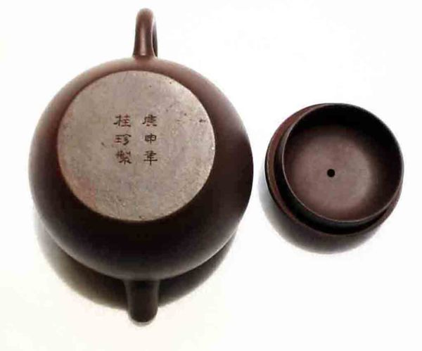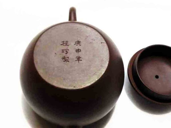 兩年後,又收到第二把"桂珍製底款、日式巨輪珠、教材NO1."壺。先是收着,近三年拿出來泡茶。1月27日老友余讓堯來家聊普洱茶,發現兩把"周桂珍日式巨輪珠教材壺",雖然都是周桂珍大師在庚申(1980)年製作的示範教材壺,但是在落款上卻有不同,一把在蓋,一把在壺底。