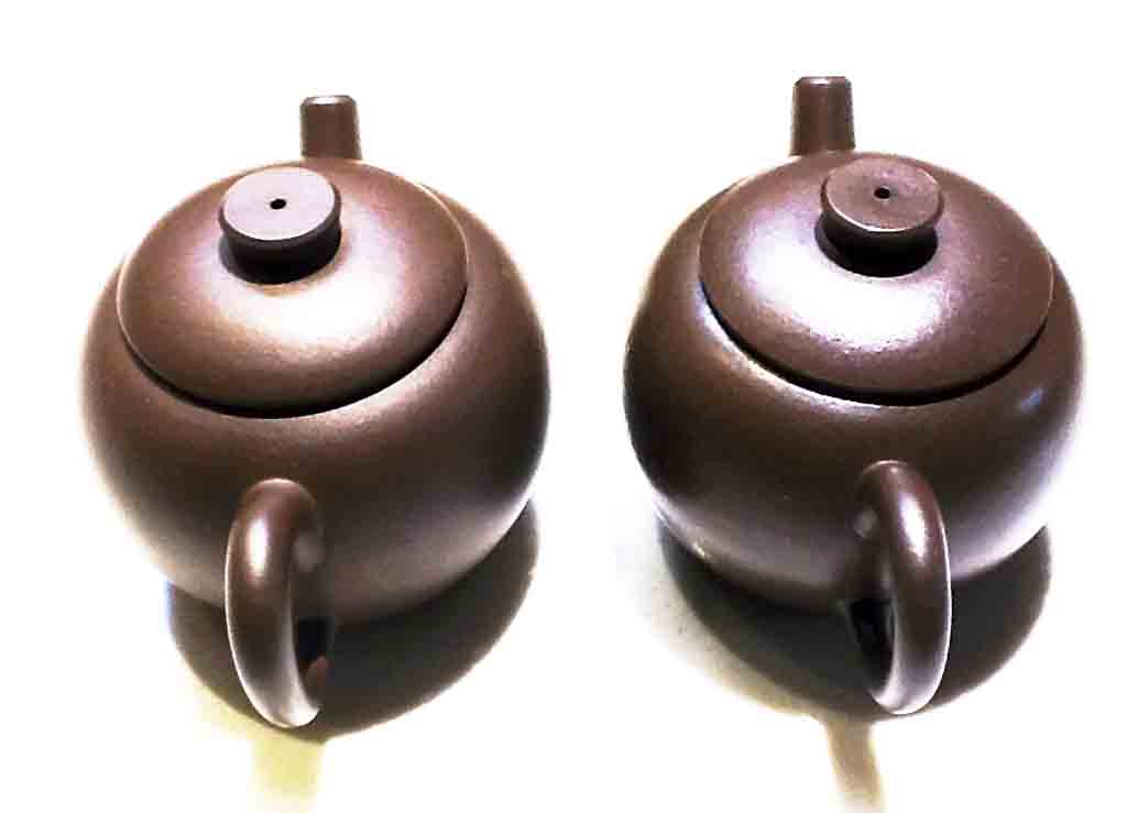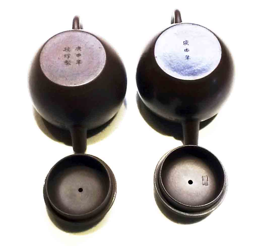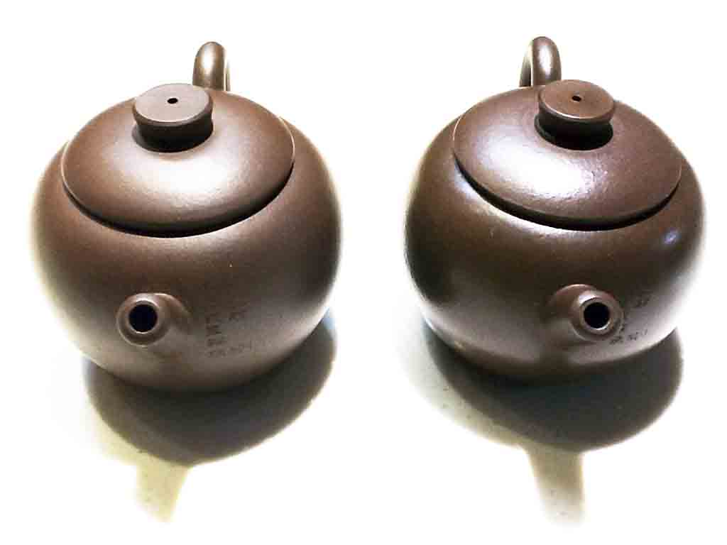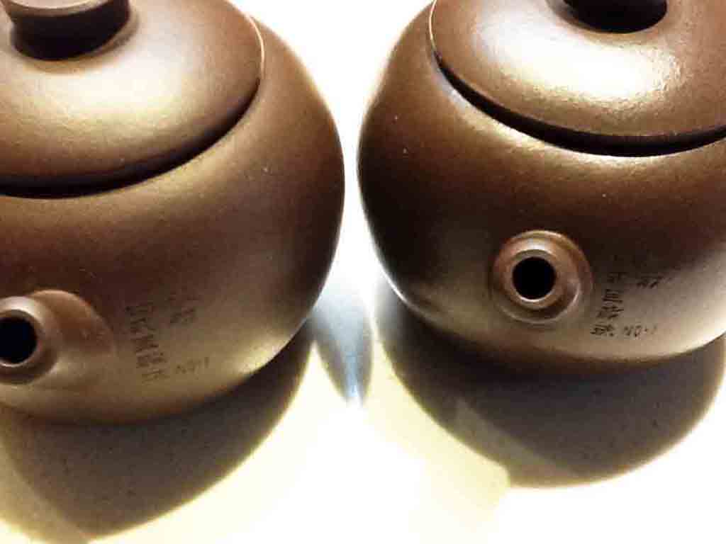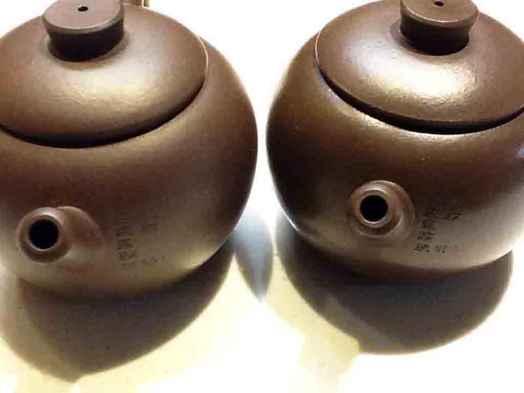 晚上將兩把壺擺在一起,除了養的久的這把特別光亮,壺蓋的大小也有差異,因此無法互換。雖然這兩把壺都是我蒐購的,但是,陰錯陽差的分開了,直到今天兩把壺才第一次聚會,因此撰此文記之。