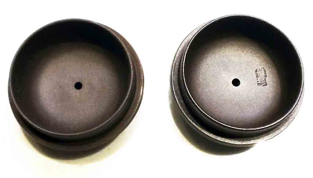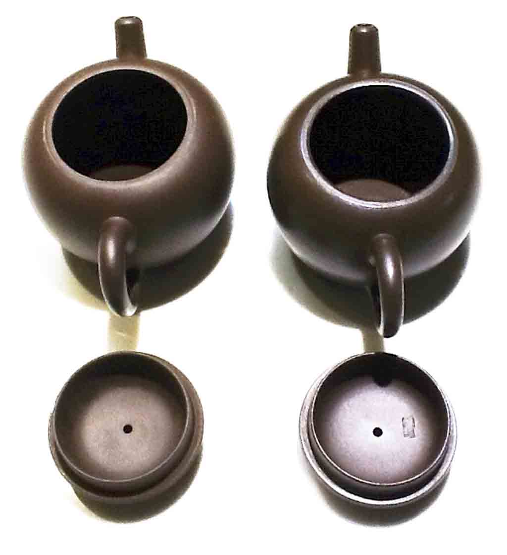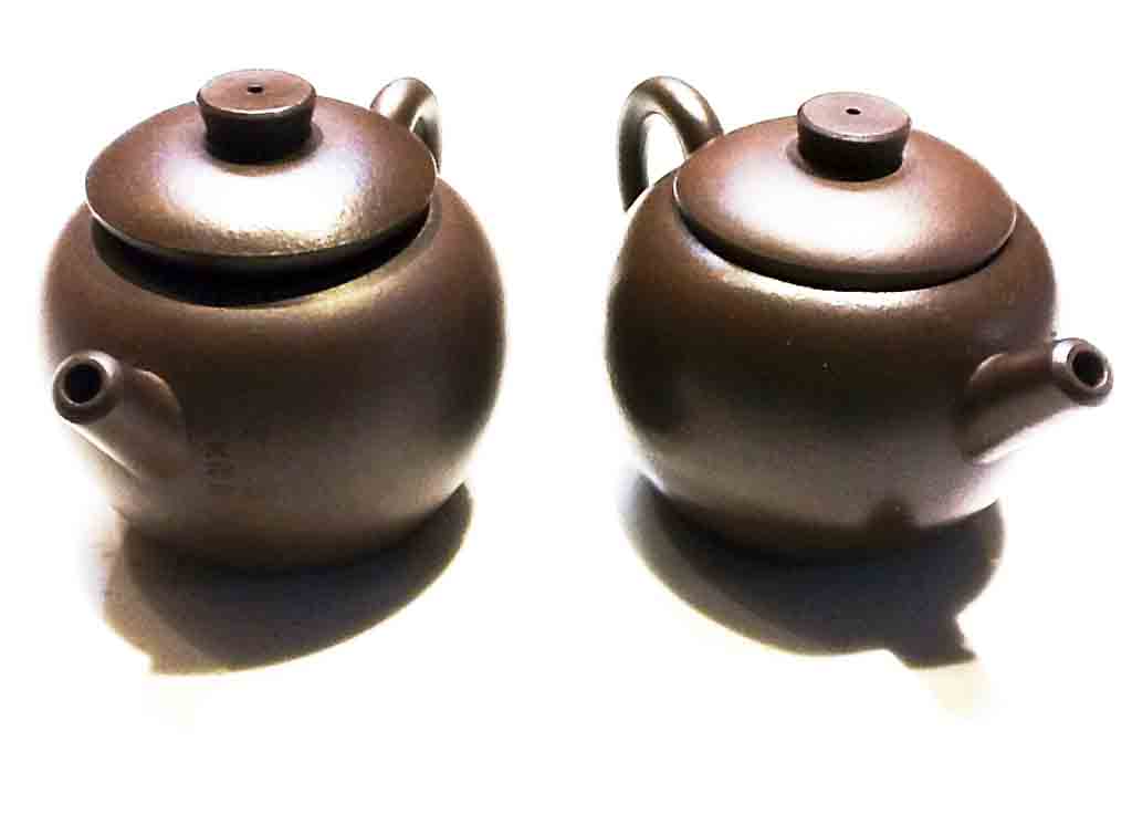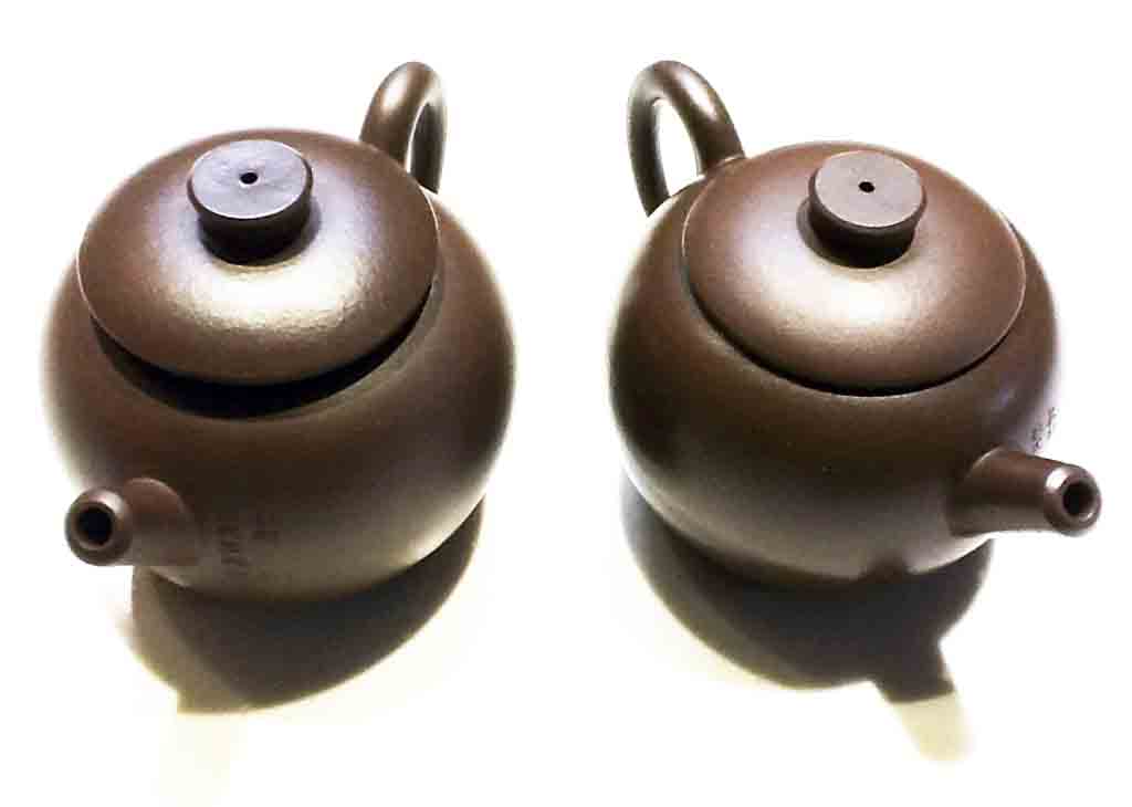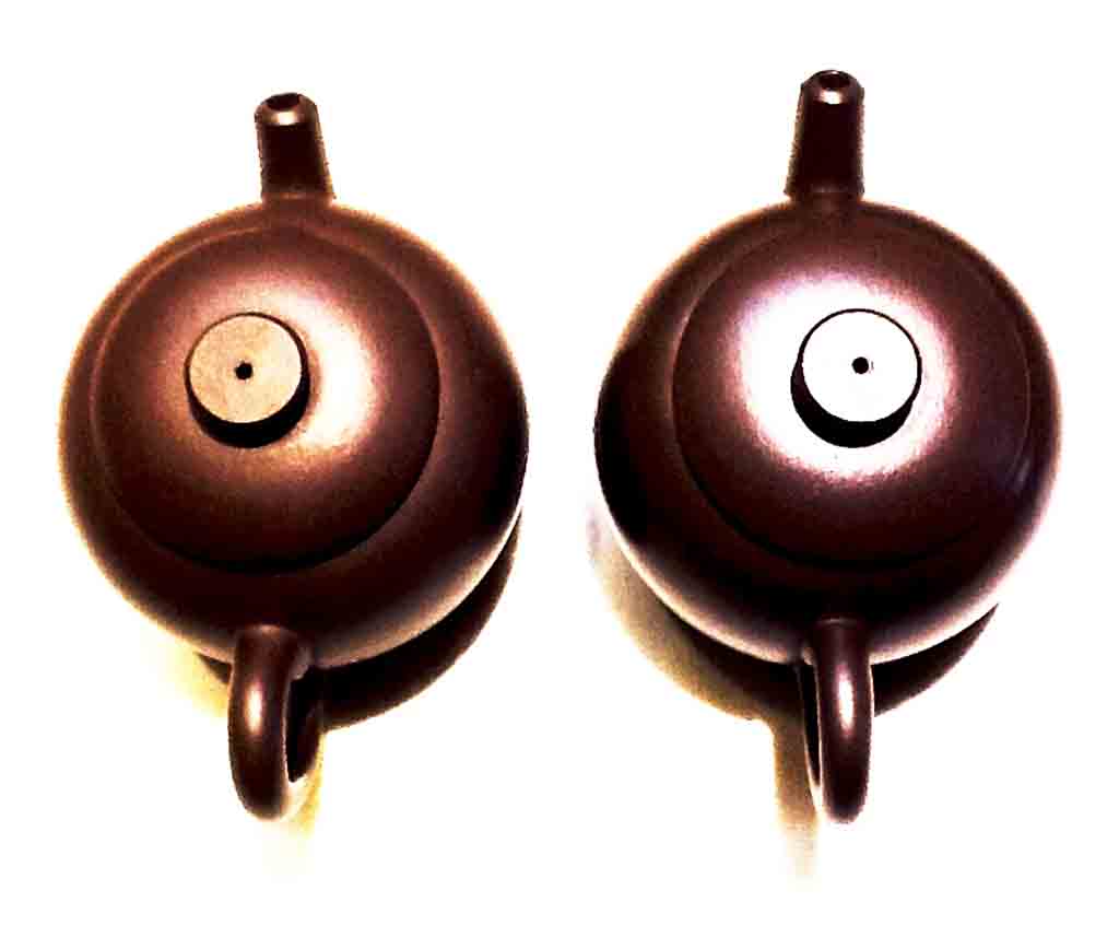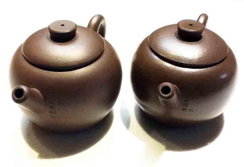 晚上將兩把壺擺在一起,除了養的久的這把特別光亮,壺蓋的大小也有差異,因此無法互換。雖然這兩把壺都是我蒐購的,但是,陰錯陽差的分開了,直到今天兩把壺才第一次聚會,因此撰此文記之。