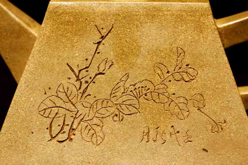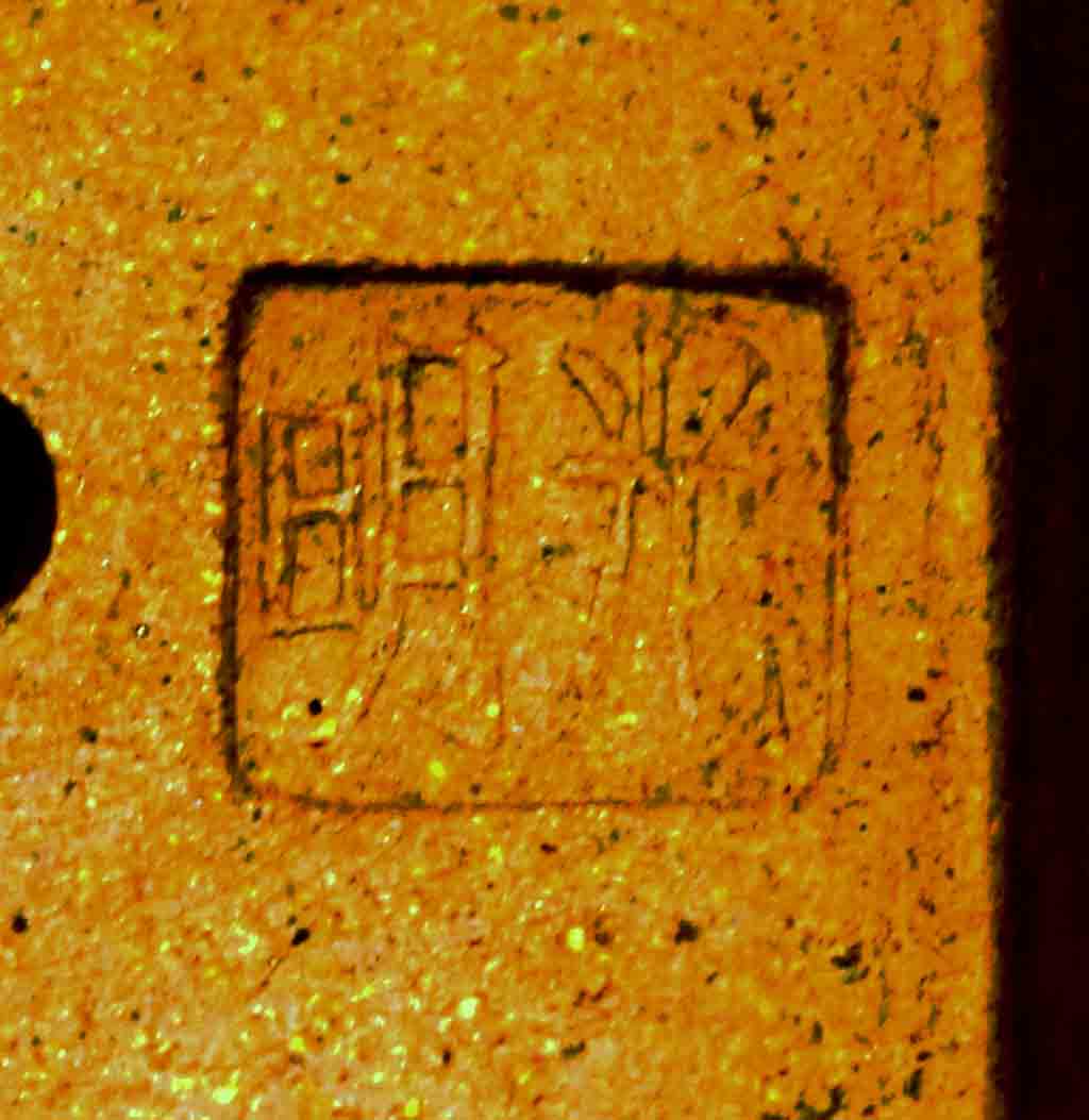 陳光明,字潤寶,清咸豐九年(1859)~民國十九年(1930)年間人。原籍金陵,自幼僑寓宜興蜀山,善作紫砂玩器及果品,如扁豆、核桃、菱、栗子、柿、橘、靈芝等,細巧玲瓏,色形逼真,美妙絕倫(見《宜興陶器概要》)。而所制壺器至今流傳甚少,可見印款,壺底一陳光明章,蓋[光明]小印。