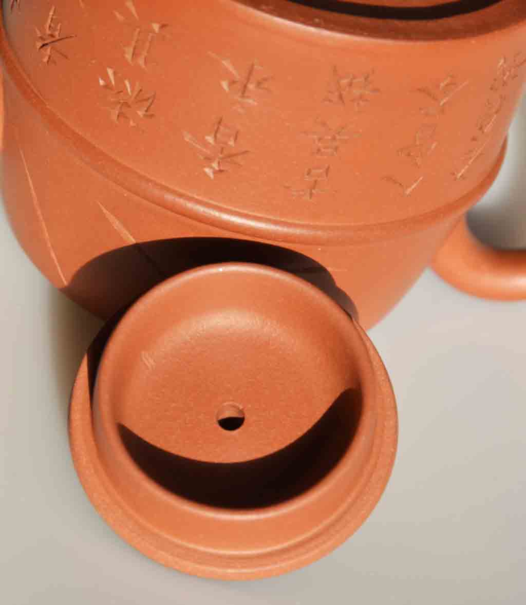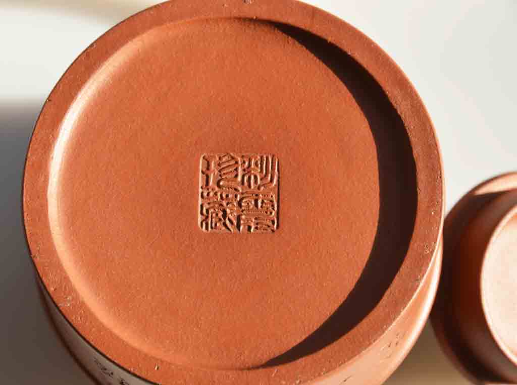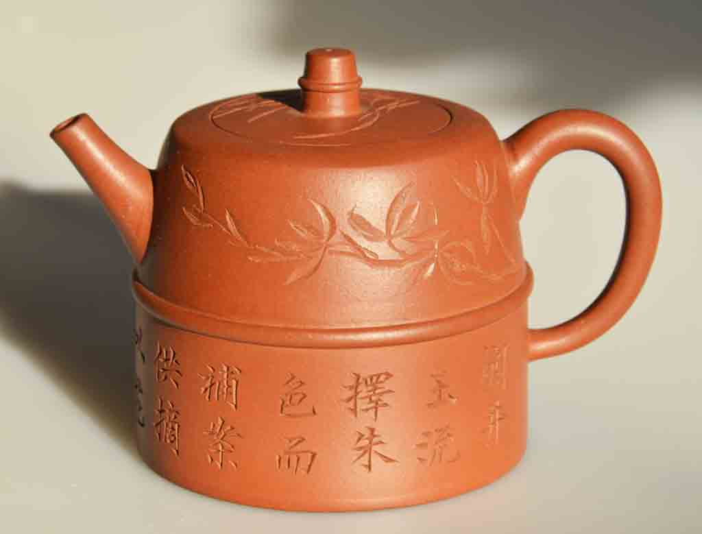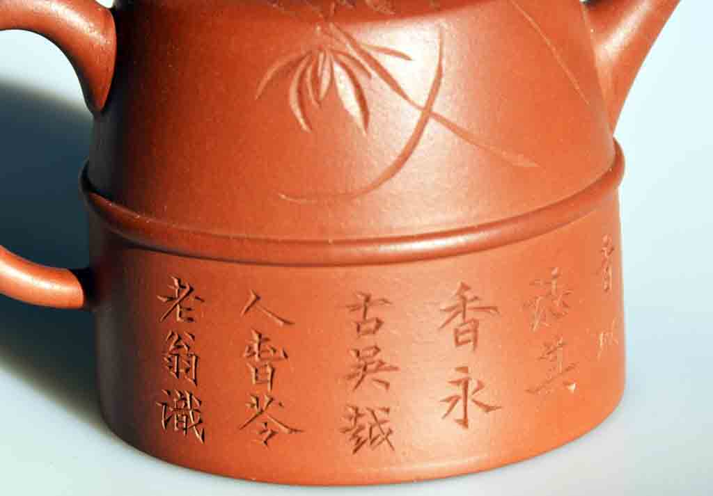 另有一種說法,因為使用在地的廣東紅泥製壺,受限於泥料與工藝技術,無法以宜興傳統的打身筒成形,而是以手拉坯成形法,亦在壺身施以裝飾泥釉,其功之精,外表酷似宜興紫砂壺,然掀起壺蓋,則可見真章。其大部份作品印款盡可能的模仿宜興款識,落款方式一般為鈐印章款,印款以陽文楷字為主;篆字為次;亦間用草書,徒做;多用方款“彩霞監製”。
