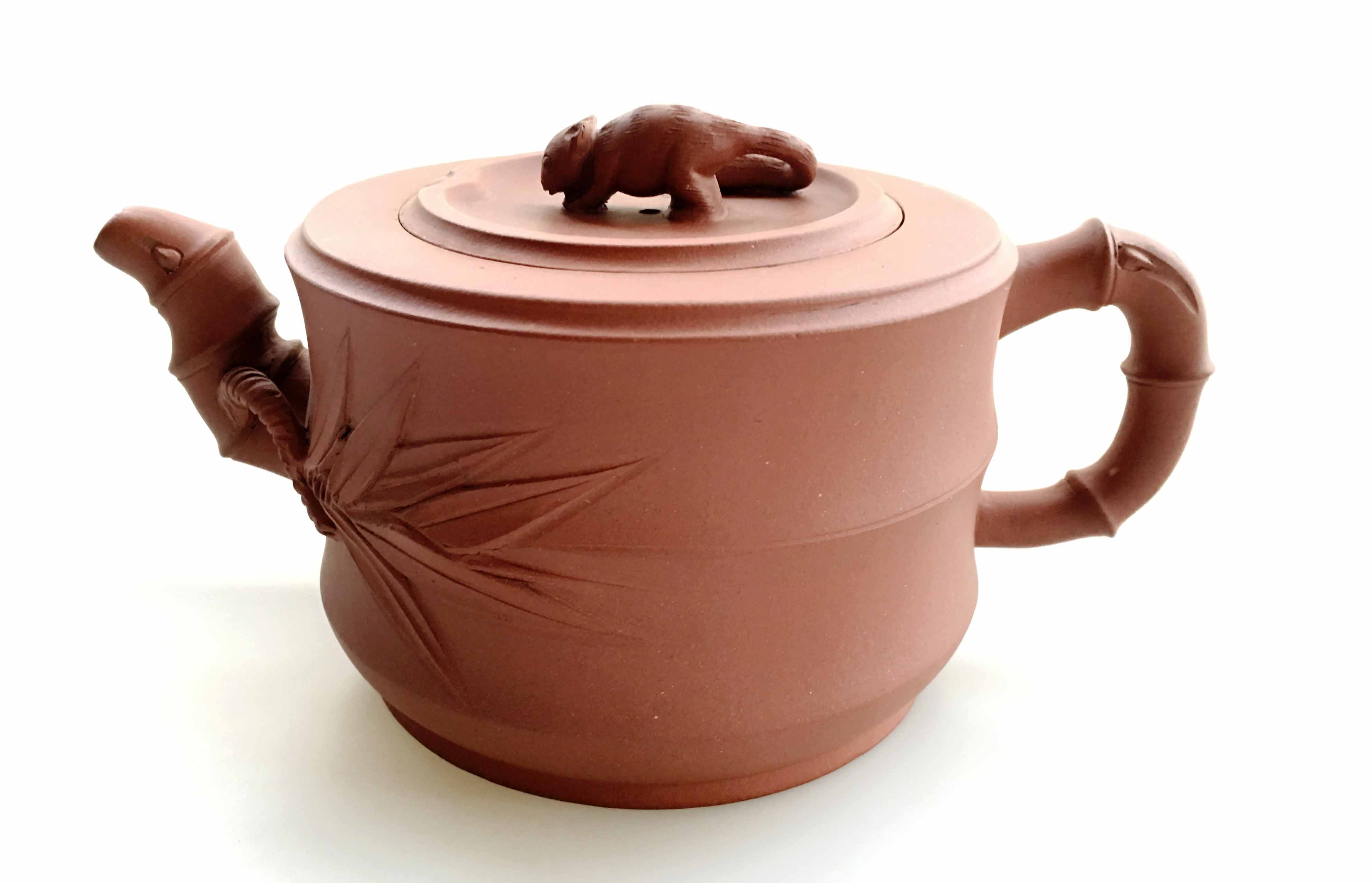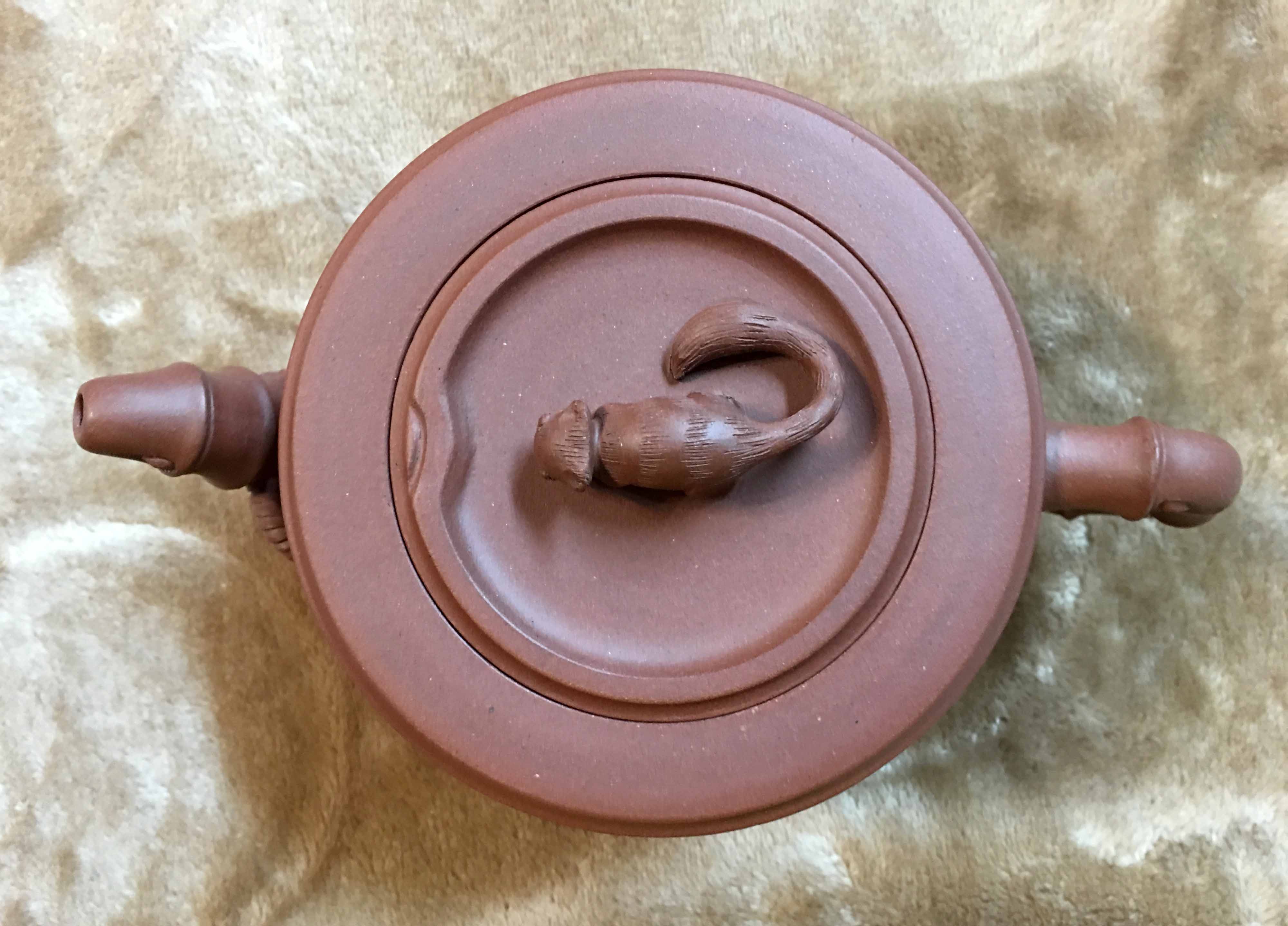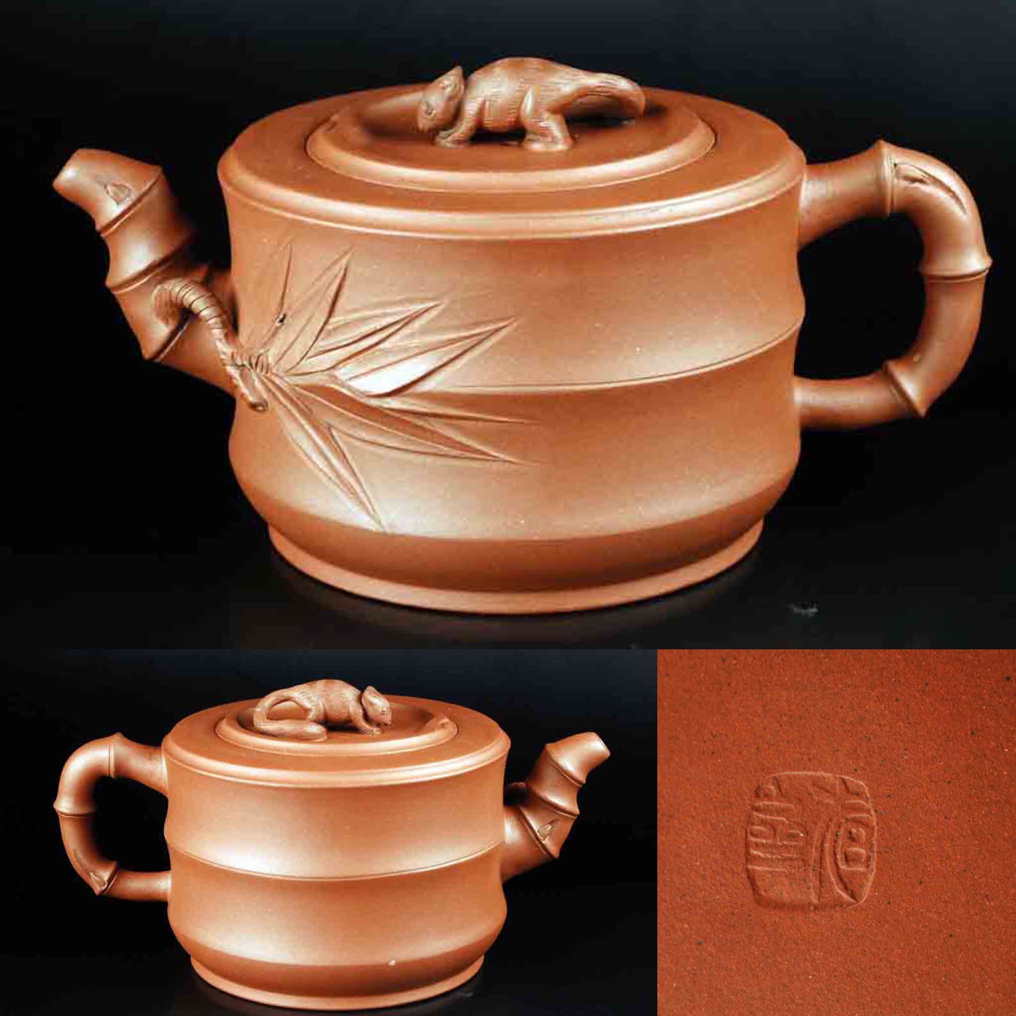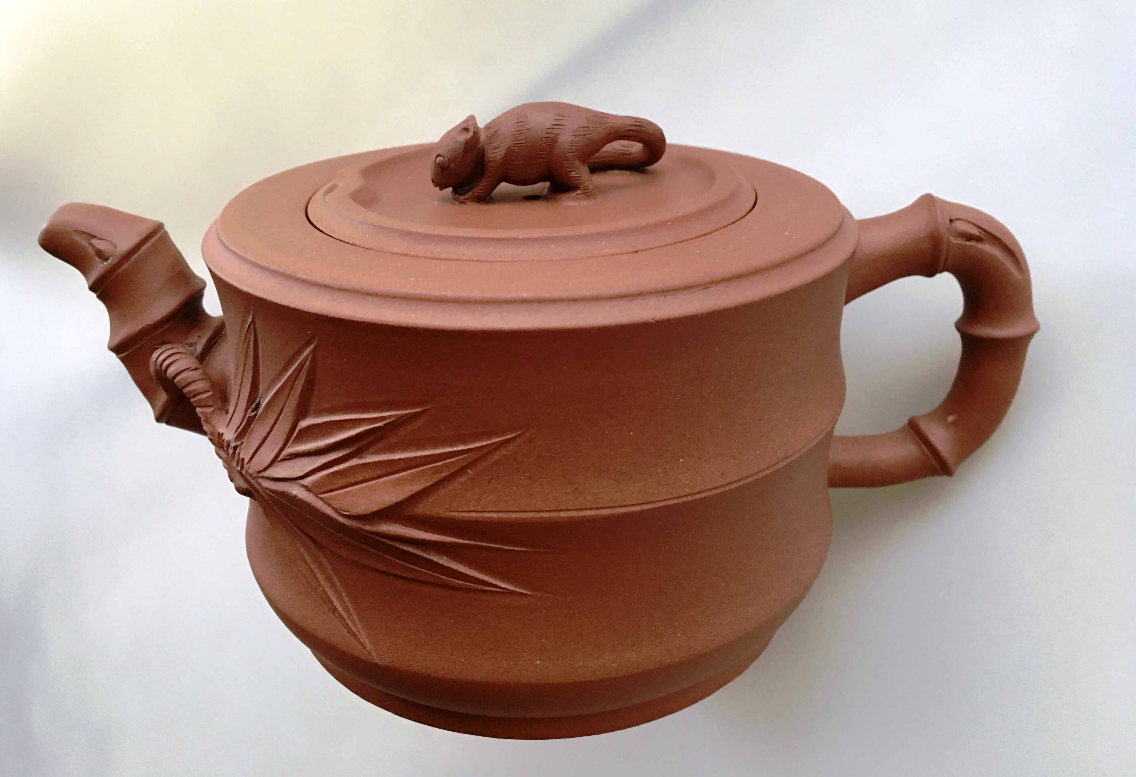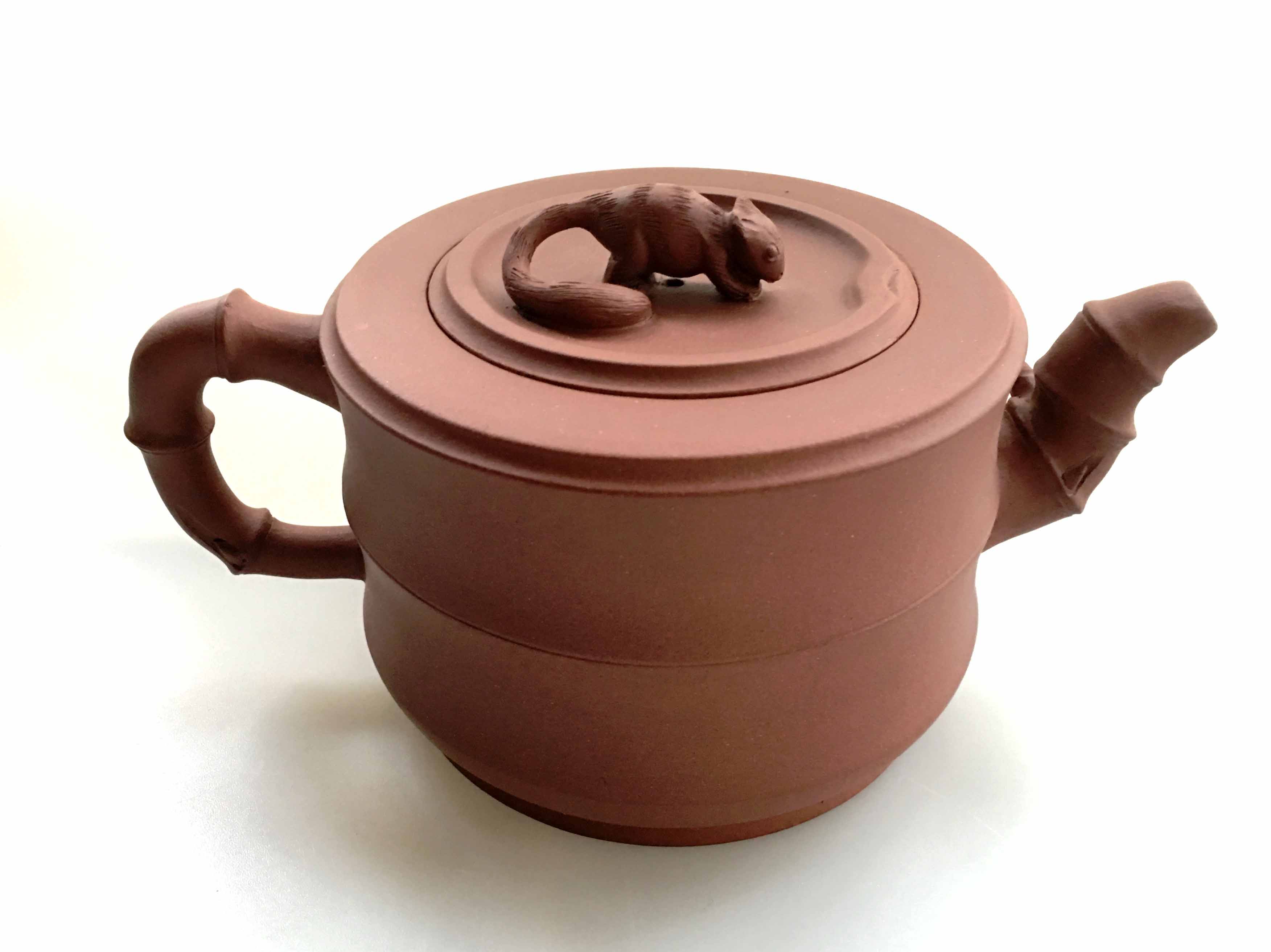 2016年9月17日下午,找出這把他的同門師兄汪寶根作的「松鼠竹節壺」,兩相比較,汪壺的松鼠尾較長,稜角較有力,竹葉稍小較適中,竹枝呈螺旋狀有些不合理,嘴14孔,用的清水泥的土質稍偏紅。記憶中「松鼠竹節壺」是由汪寶根首創的。結論是兩把都是好壺,存世的「松鼠竹節壺」也甚少!