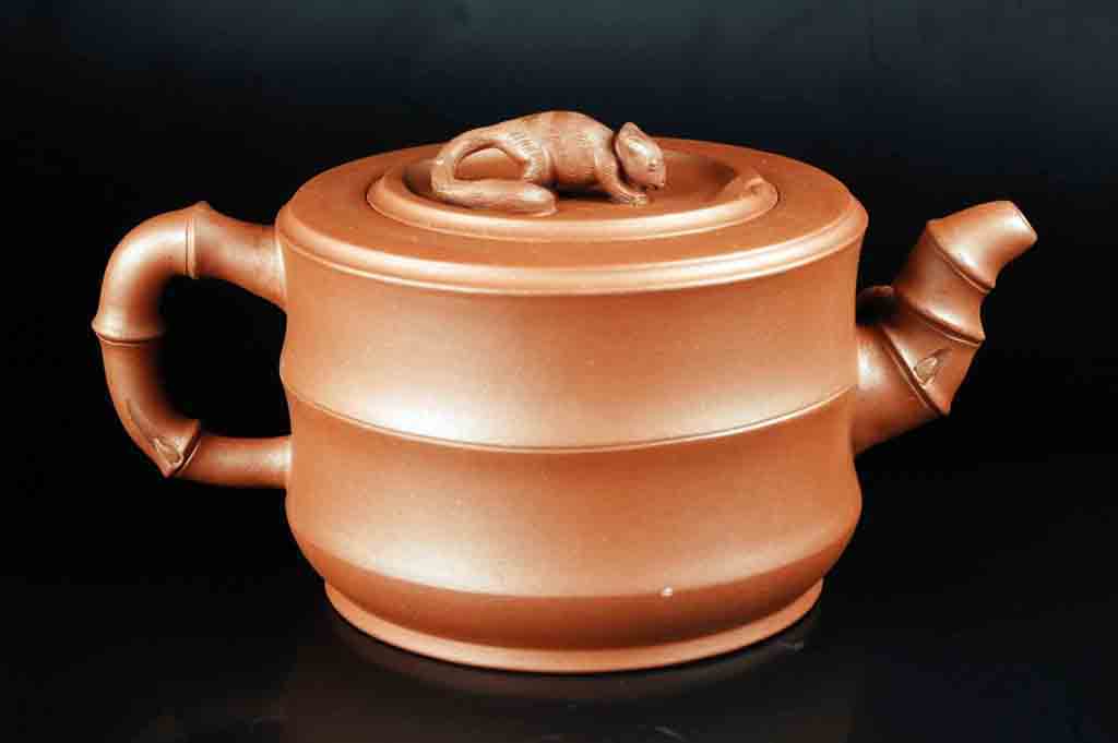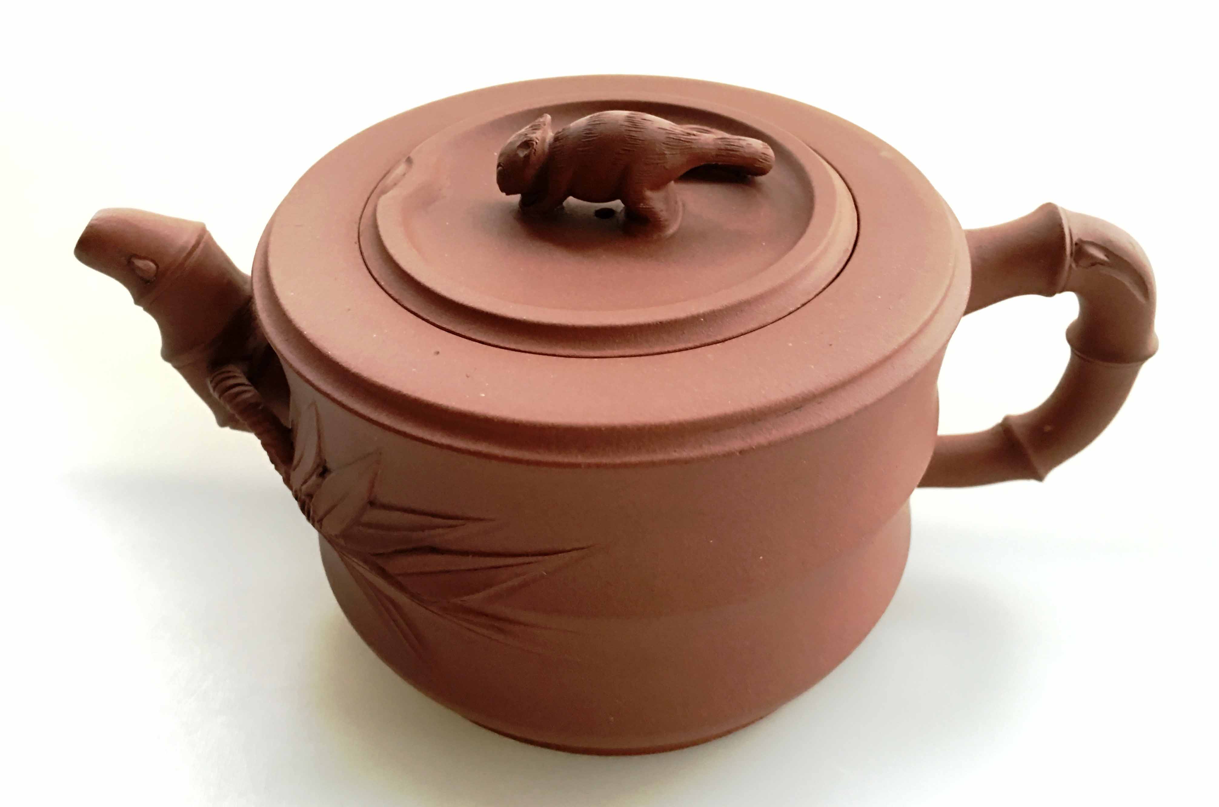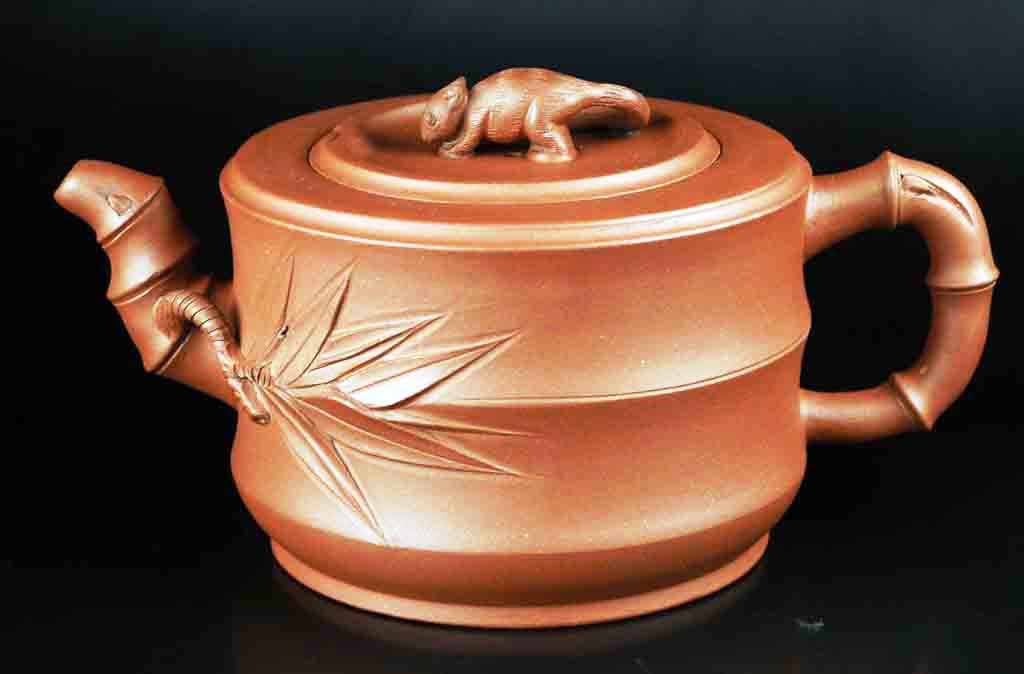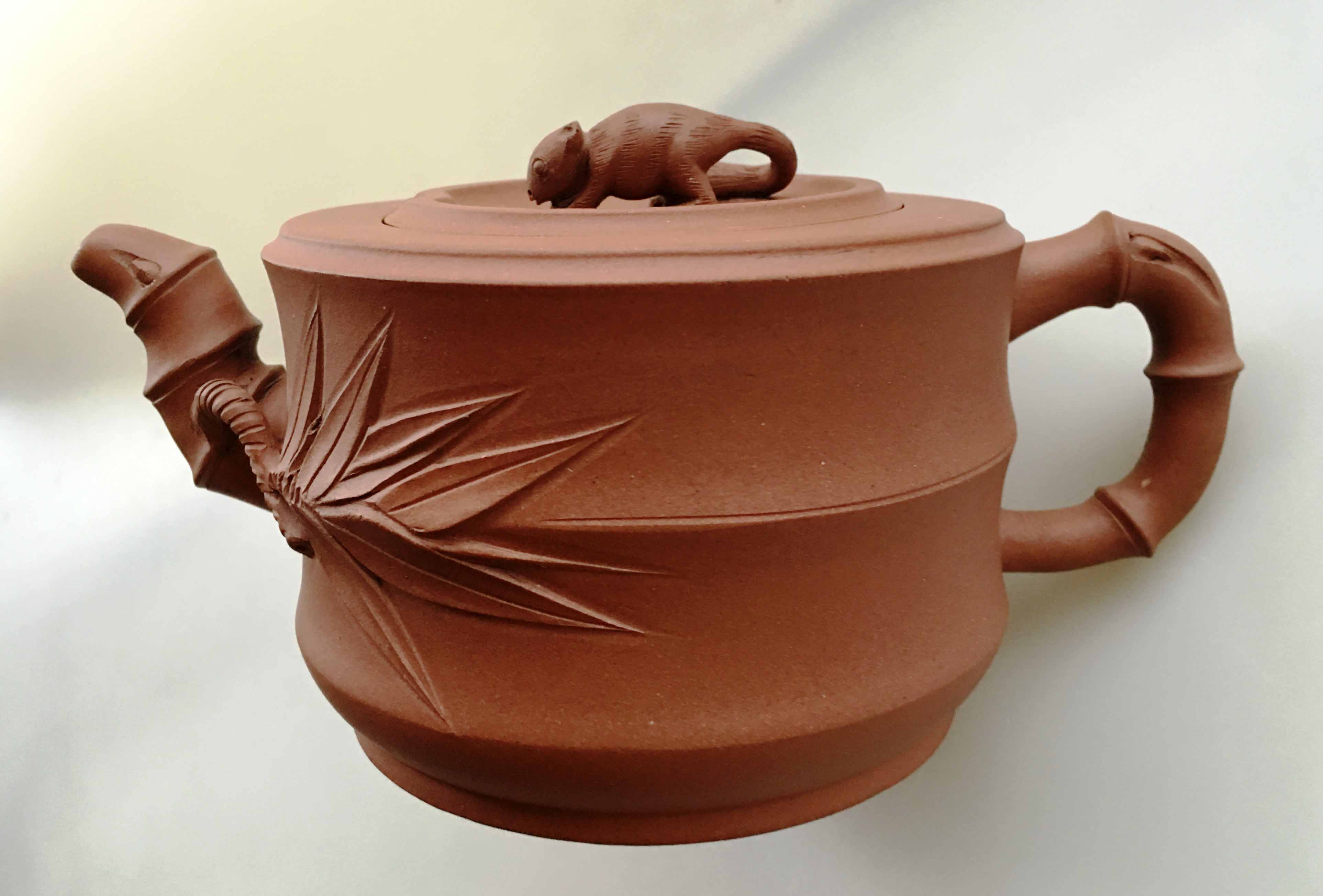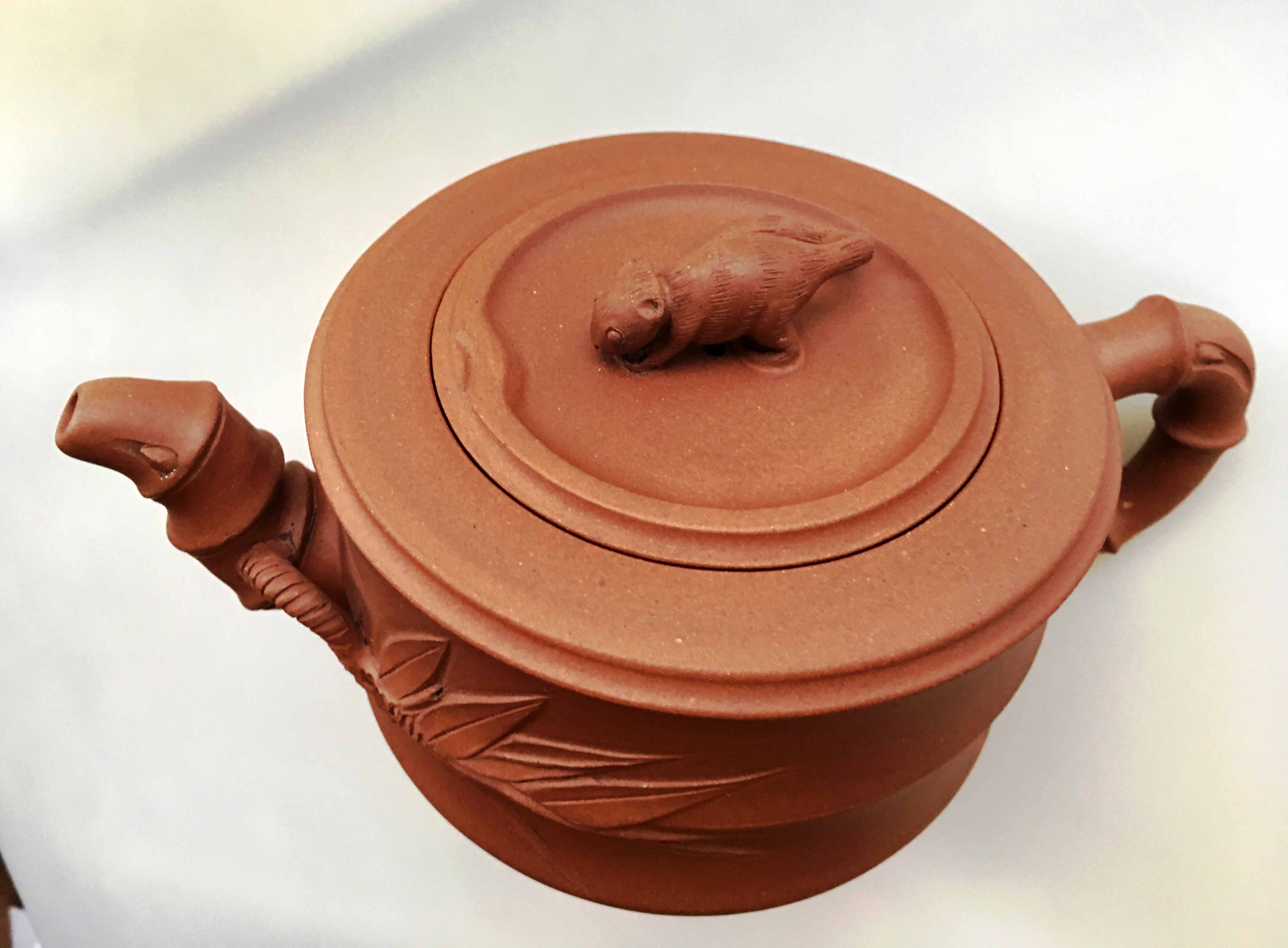 2016年9月17日下午,找出這把他的同門師兄汪寶根作的「松鼠竹節壺」,兩相比較,汪壺的松鼠尾較長,稜角較有力,竹葉稍小較適中,竹枝呈螺旋狀有些不合理,嘴14孔,用的清水泥的土質稍偏紅。記憶中「松鼠竹節壺」是由汪寶根首創的。結論是兩把都是好壺,存世的「松鼠竹節壺」也甚少!