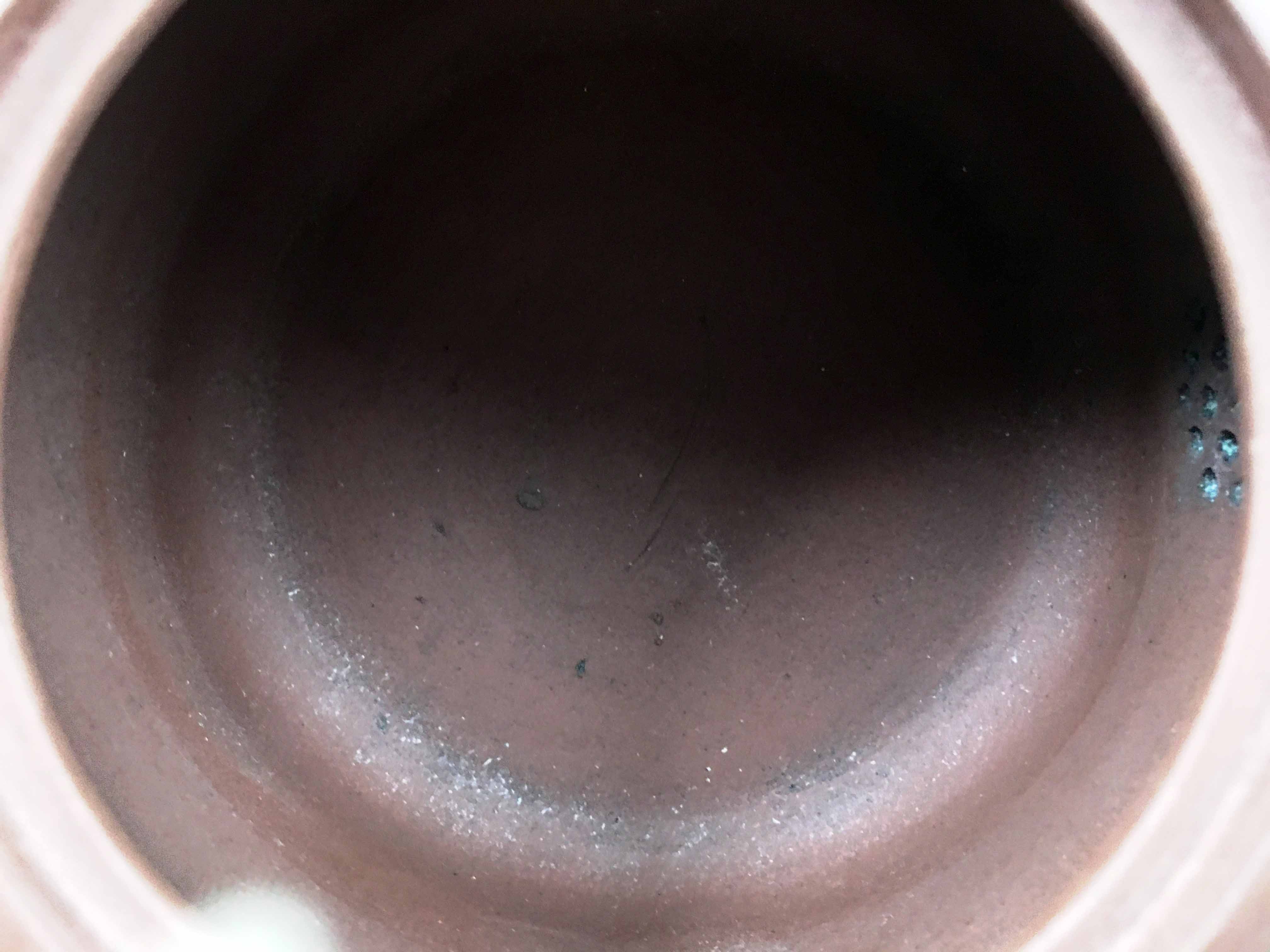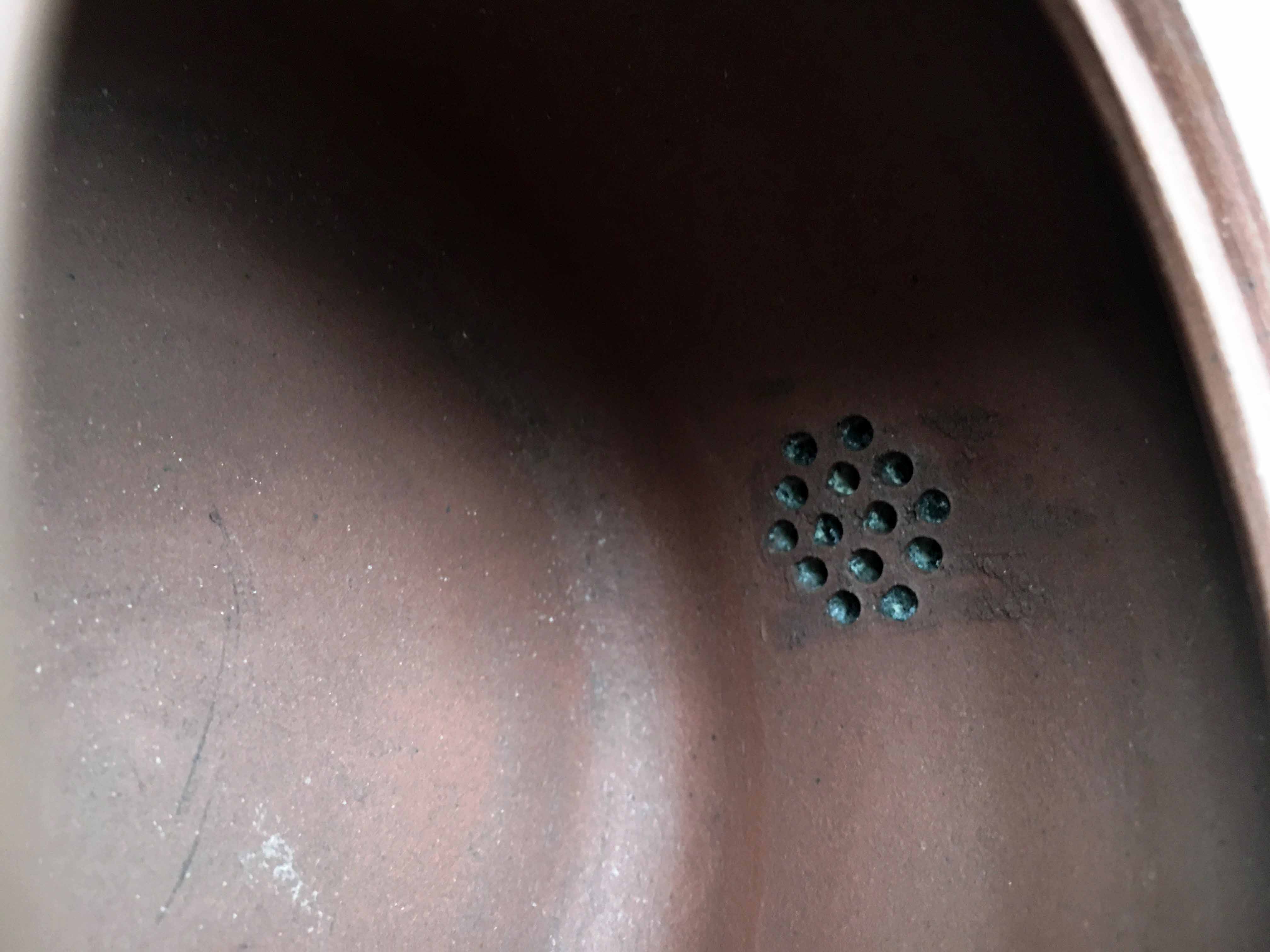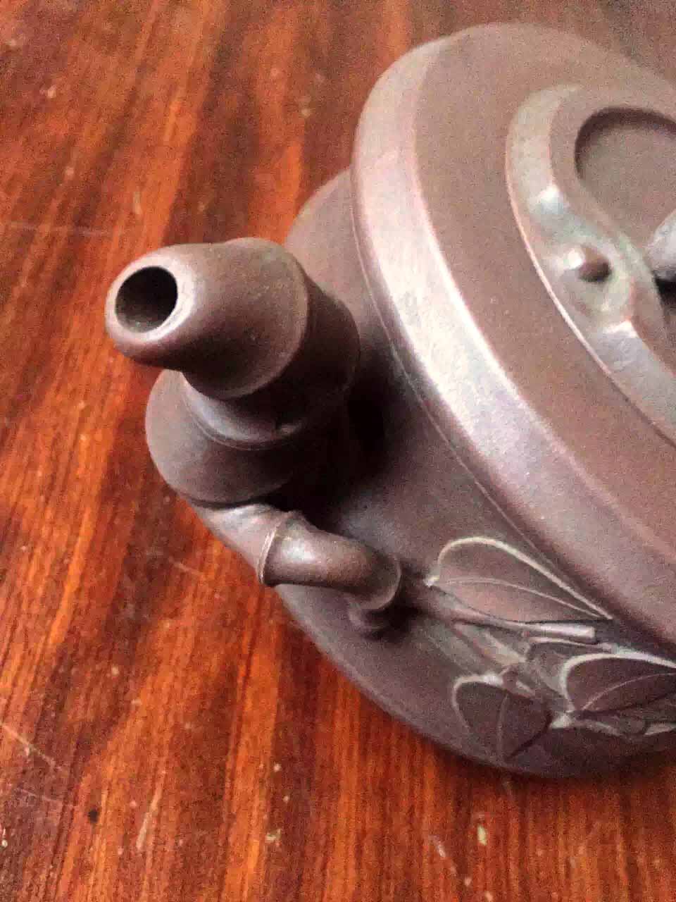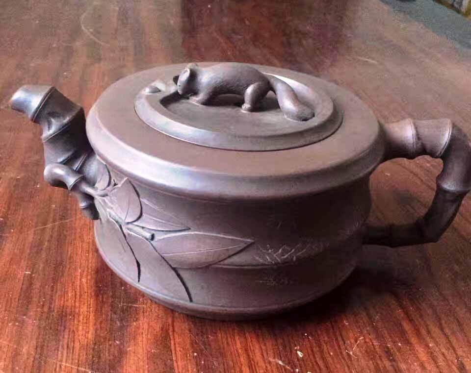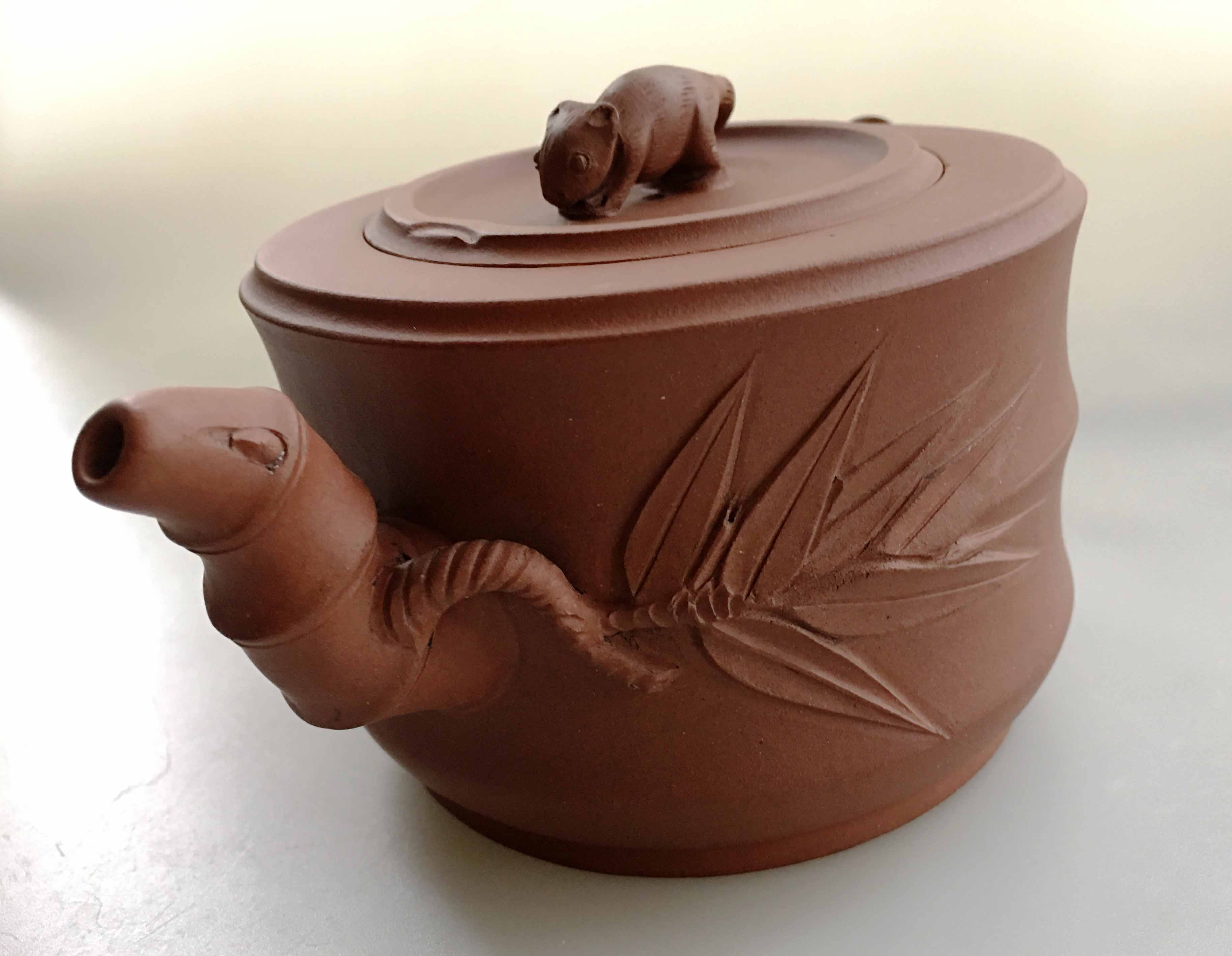 2016年9月17日下午,找出這把他的同門師兄汪寶根作的「松鼠竹節壺」,兩相比較,汪壺的松鼠尾較長,稜角較有力,竹葉稍小較適中,竹枝呈螺旋狀有些不合理,嘴14孔,用的清水泥的土質稍偏紅。記憶中「松鼠竹節壺」是由汪寶根首創的。結論是兩把都是好壺,存世的「松鼠竹節壺」也甚少!