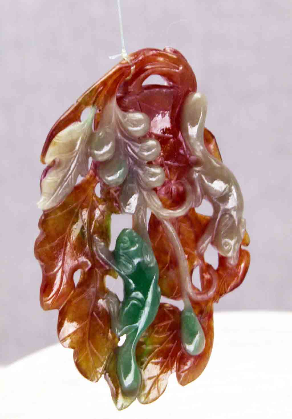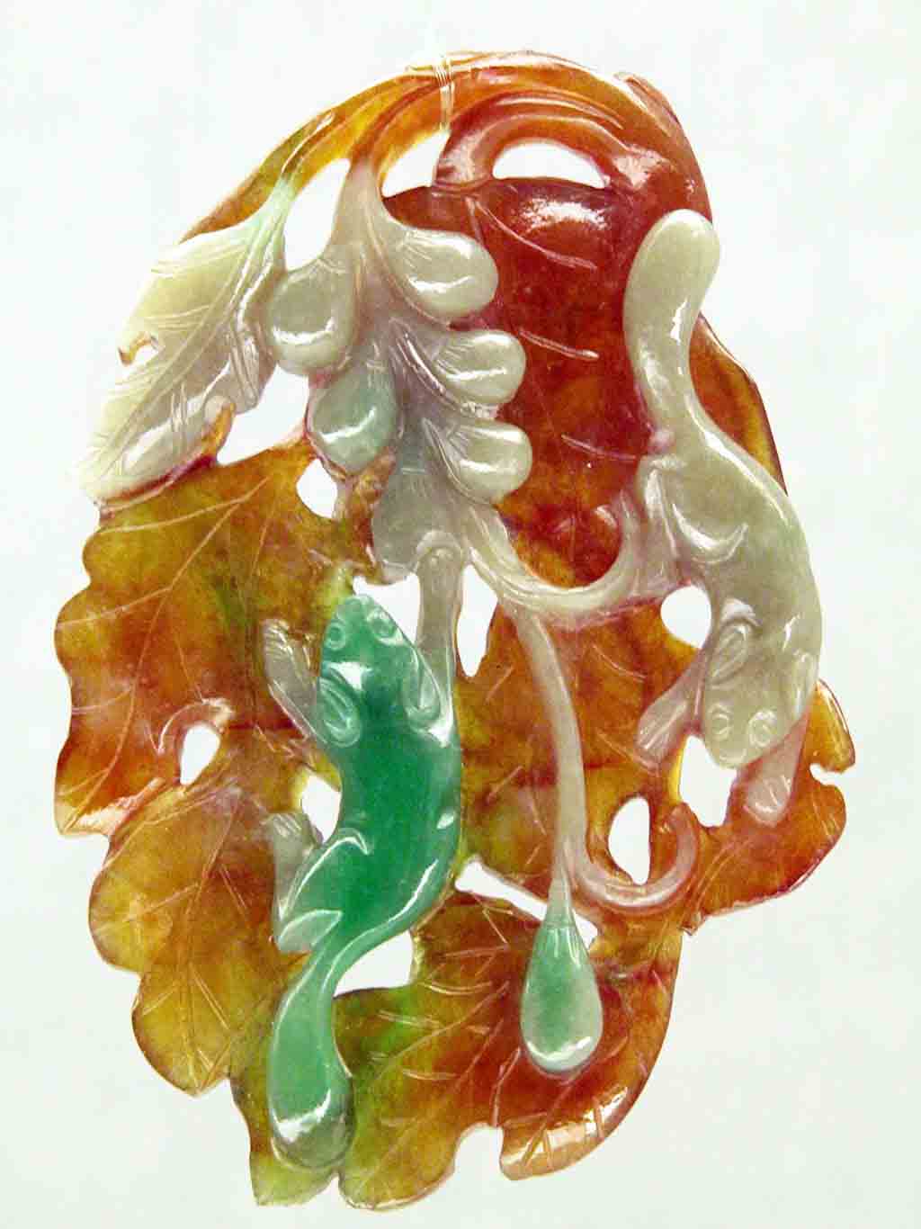 這件松鼠葡萄三彩翡翠珮,屬緬甸出產的硬玉類,因包括紅翡、翠綠、灰白三種色調,因此稱為三彩翡翠,其實若是依照它的玉質來評斷,它只屬於中上等級而已,若按最好的翠玉才能被稱為「翡翠」來定名,它還不夠被稱為「翡翠」,只能被稱為「三彩翠玉」或「三彩硬玉」。
