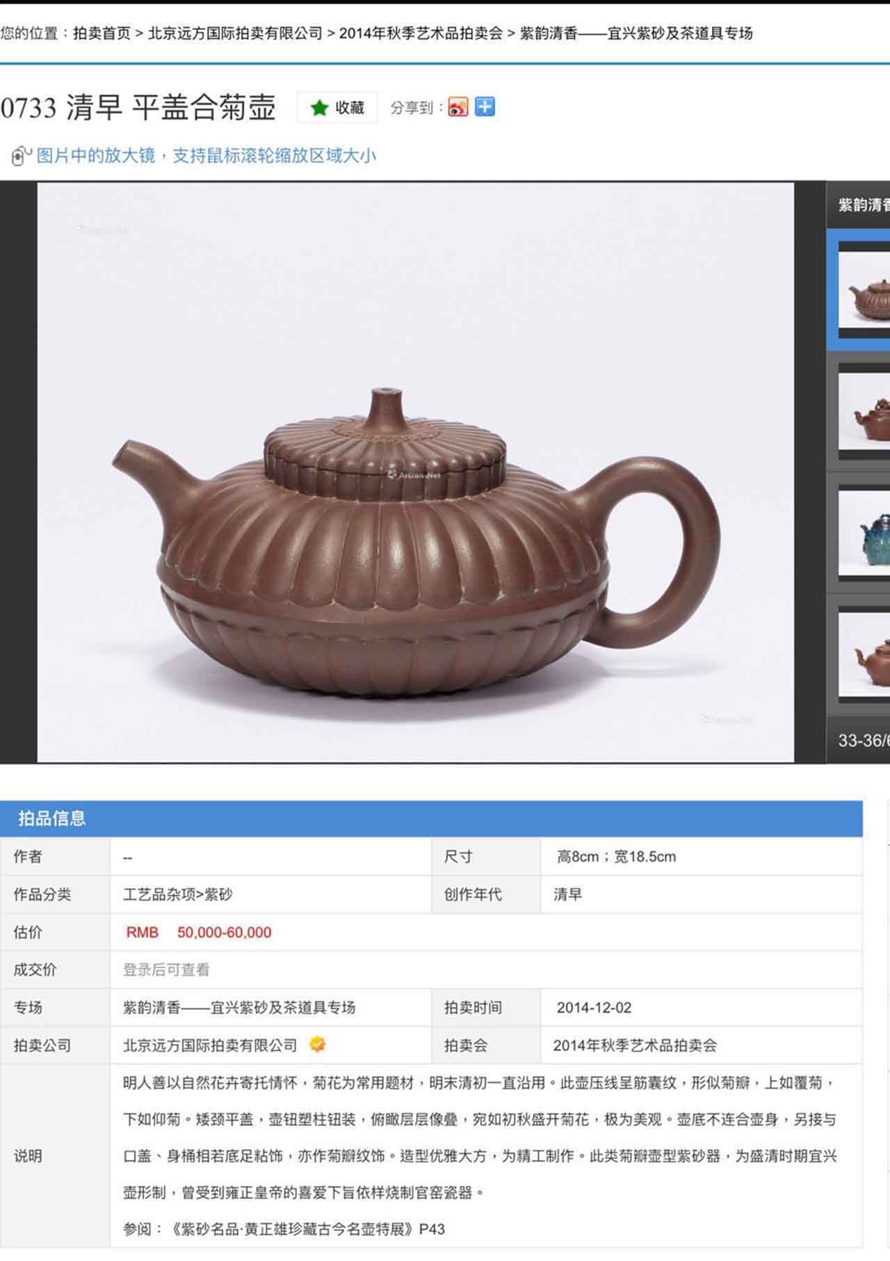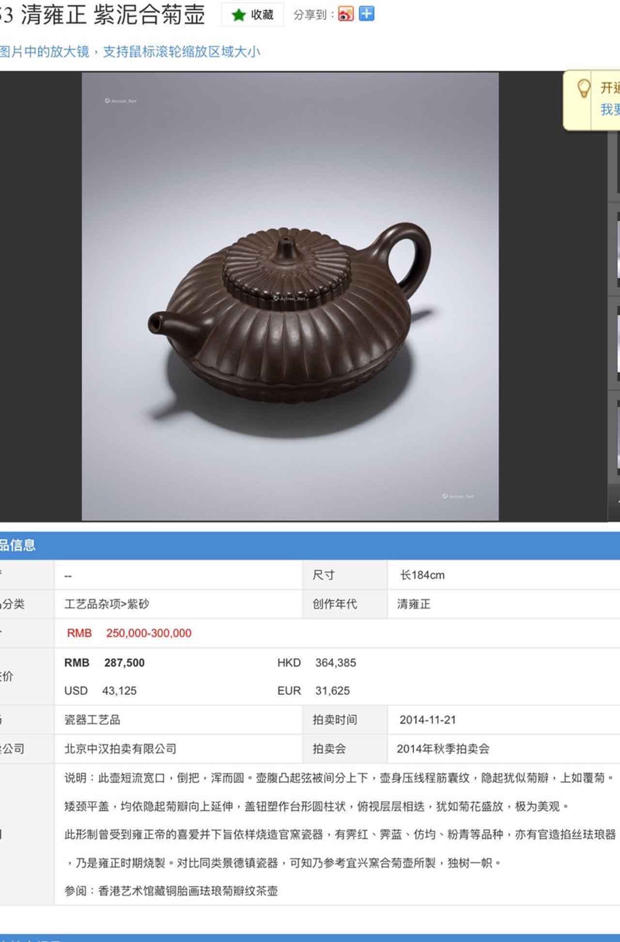 2014年11月21日北京中漢拍賣拍賣有限公司的工藝品雜項秋拍中,有一把長18.4公分「清雍正紫泥合菊壺」。