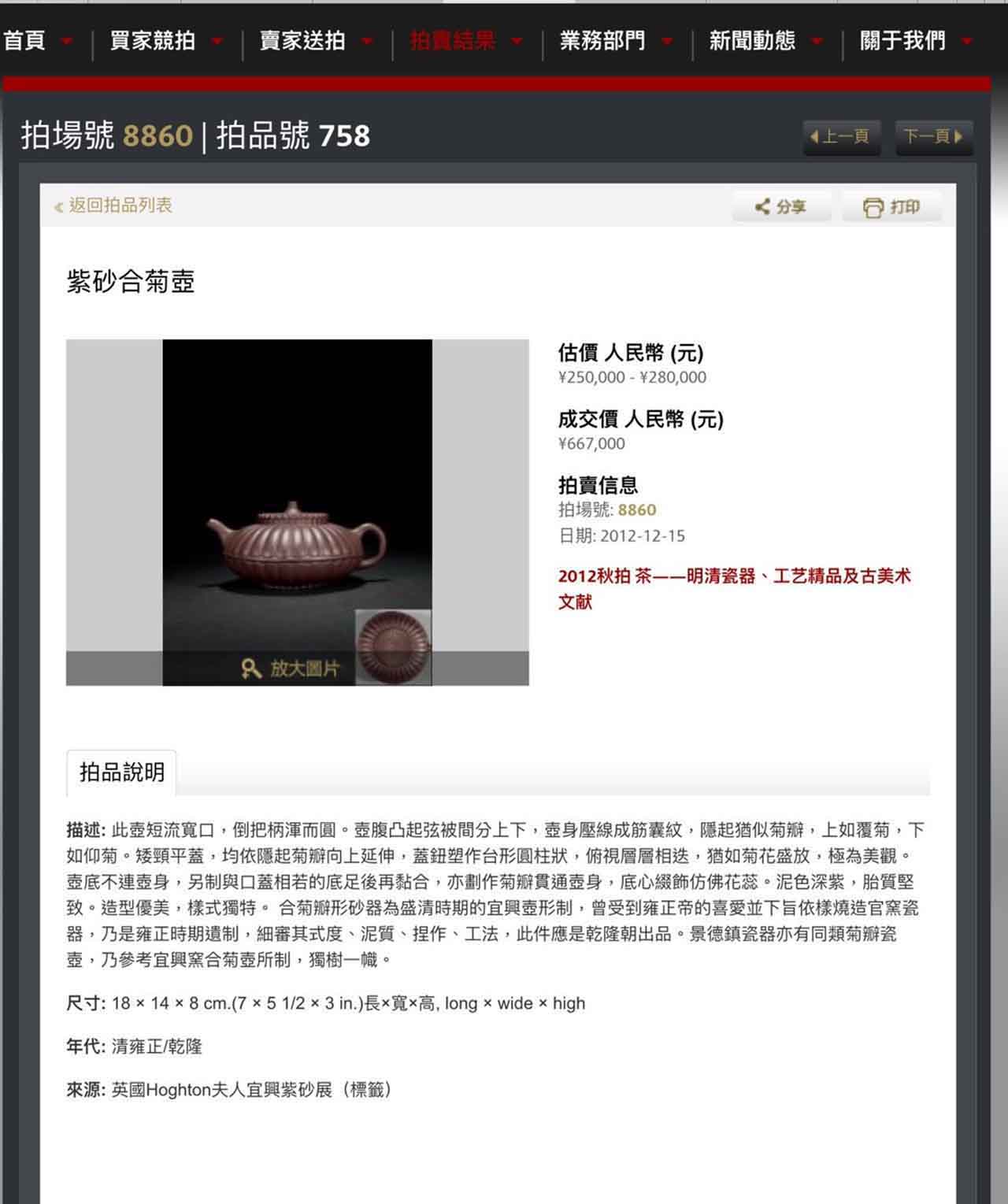2012年12月15日秋拍「明清瓷器、工藝精品及古美術文獻」中,一把清雍正~乾隆紫砂合菊壺,長18公分*寬14公分*高8公分,以667,000元人民幣拍出。