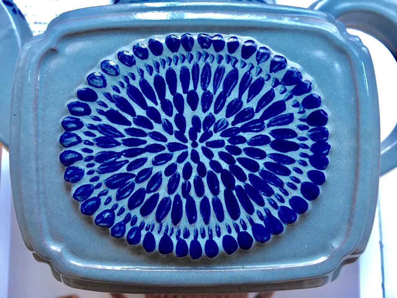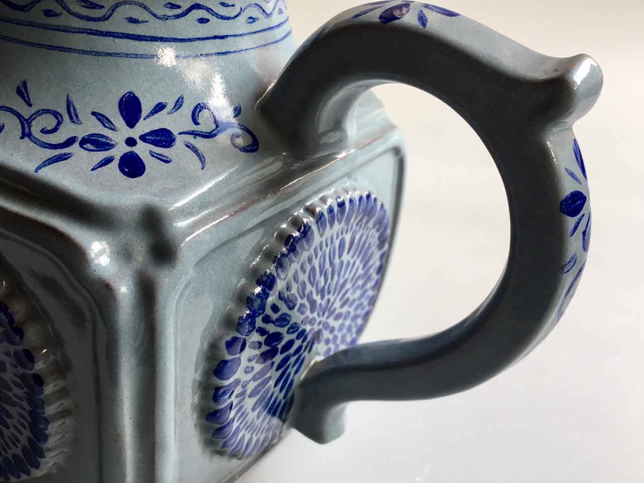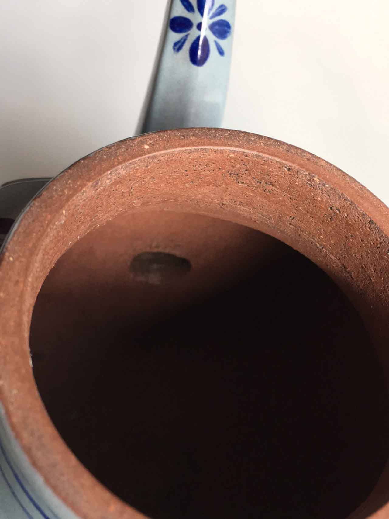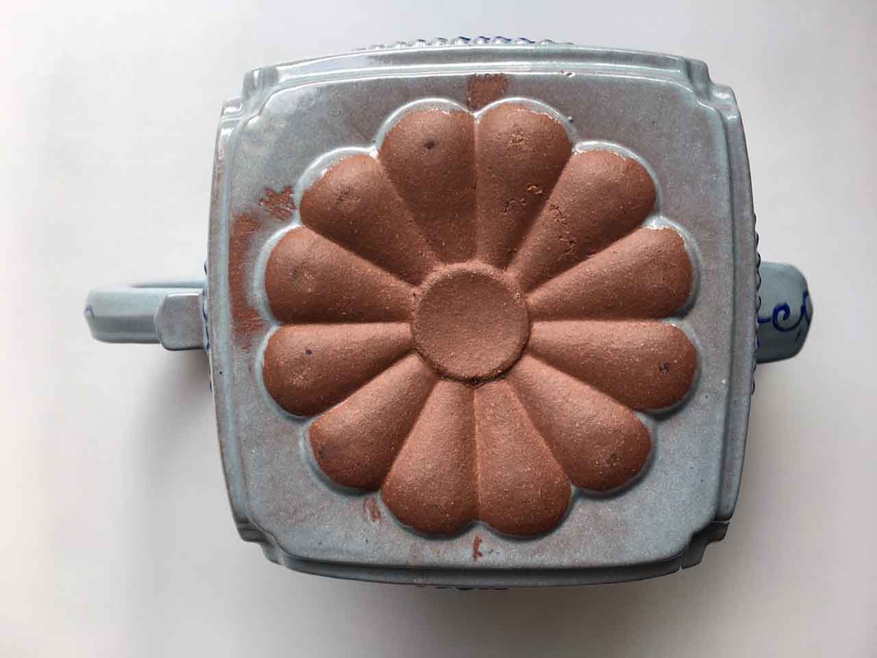此壺十多年前從跑兩岸的壺商手上收到,當時只是驚嘆這壺的作工繁複,老紫砂、飛扣把、六角流、盔蓋、高柱鈕、四方折角、開光、滿爐鈞釉、點菊瓣藍彩,這樣的工藝不是傳統的個人工作室所能完成的,一定要是群組以上的工作坊才能完成,雖然一定是清代的產物,但是斷代到何時還需要考證。