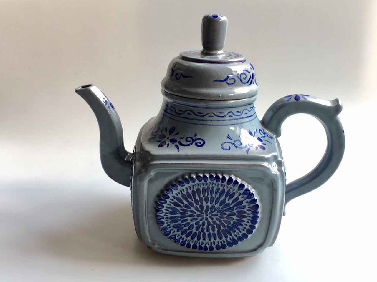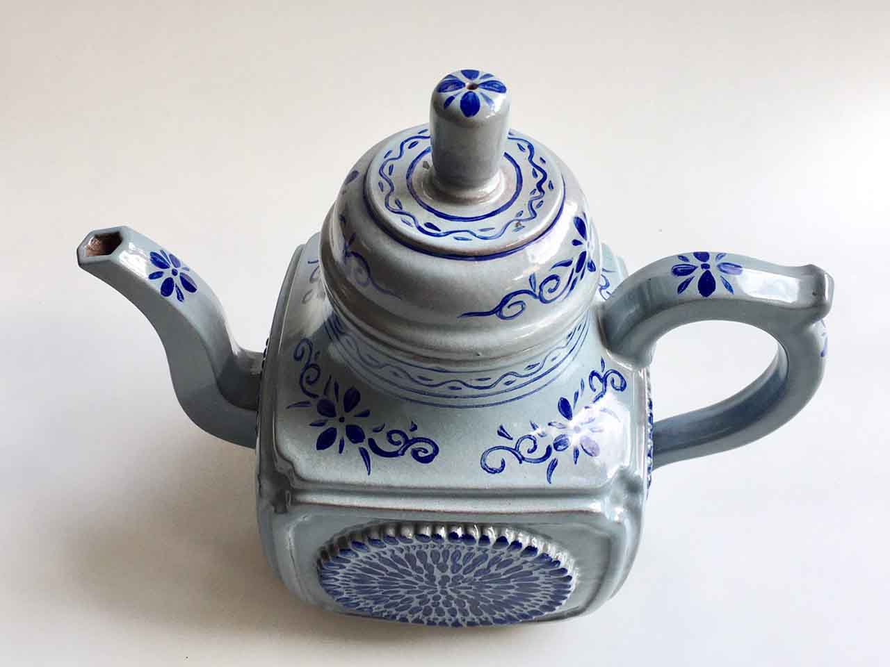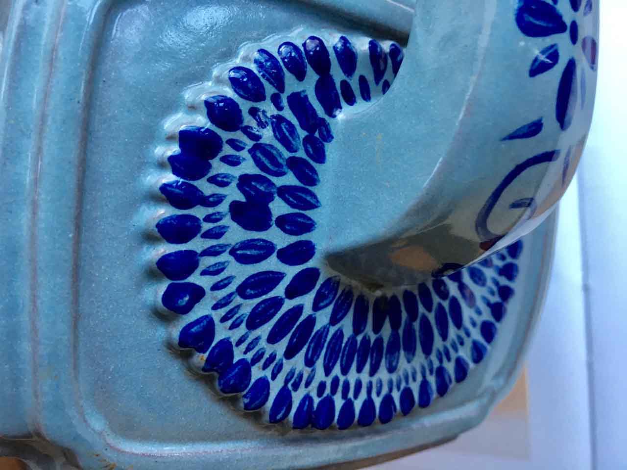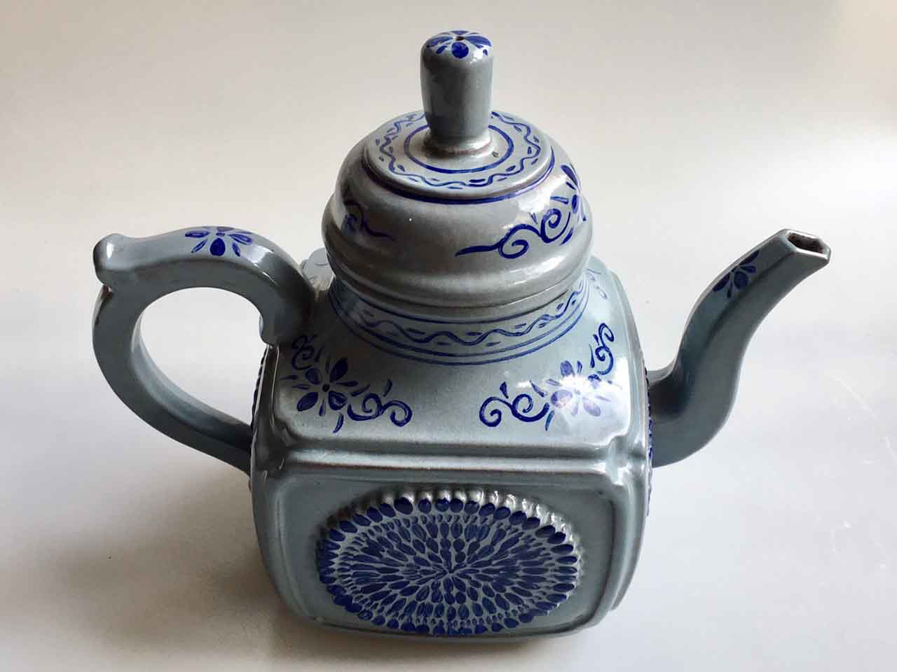 此壺十多年前從跑兩岸的壺商手上收到,當時只是驚嘆這壺的作工繁複,老紫砂、飛扣把、六角流、盔蓋、高柱鈕、四方折角、開光、滿爐鈞釉、點菊瓣藍彩,這樣的工藝不是傳統的個人工作室所能完成的,一定要是群組以上的工作坊才能完成,雖然一定是清代的產物,但是斷代到何時還需要考證。