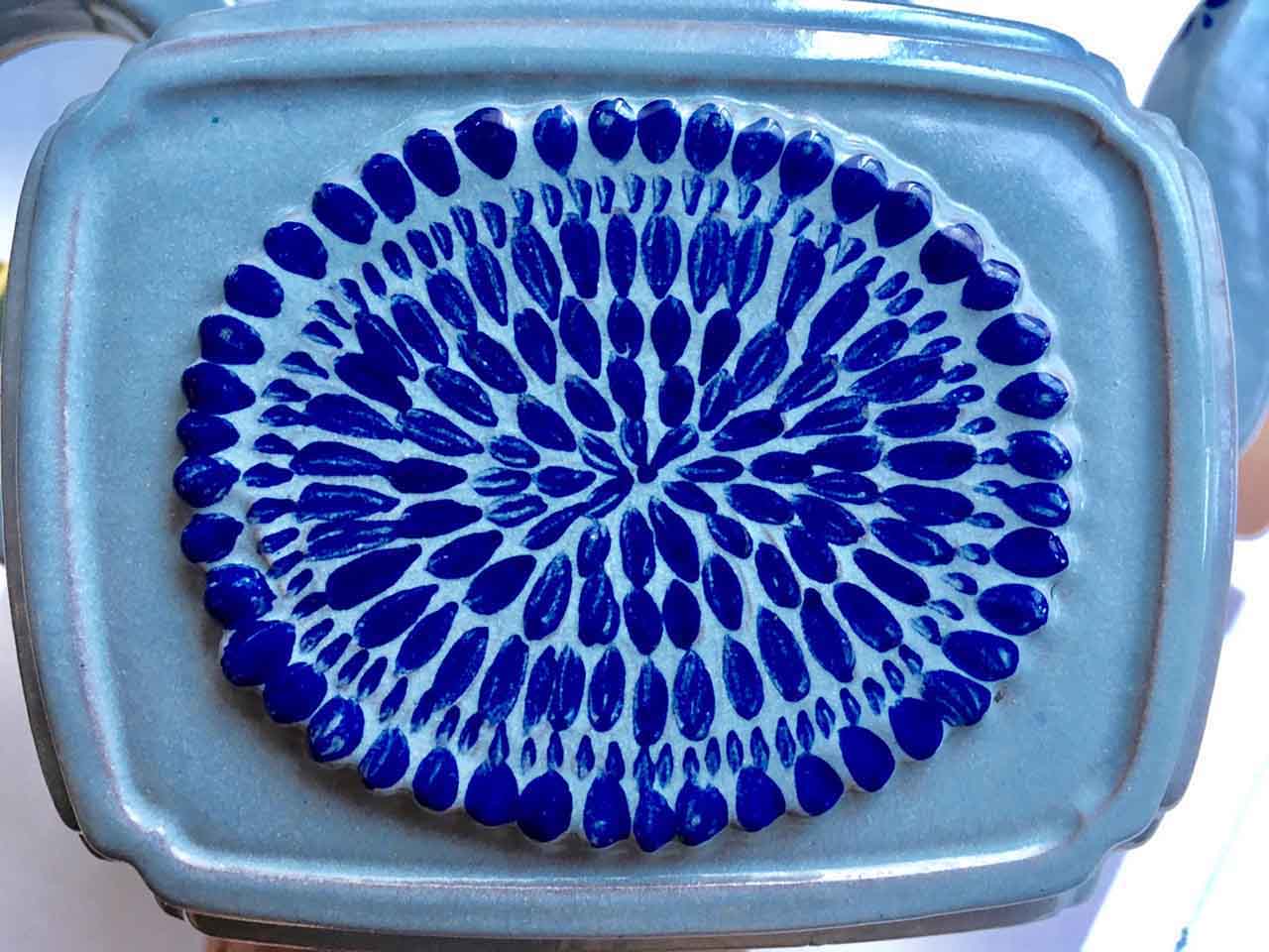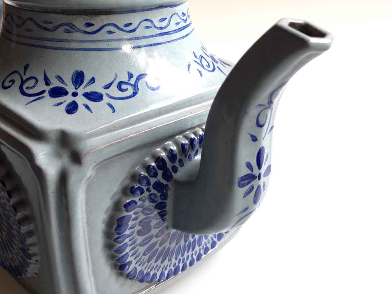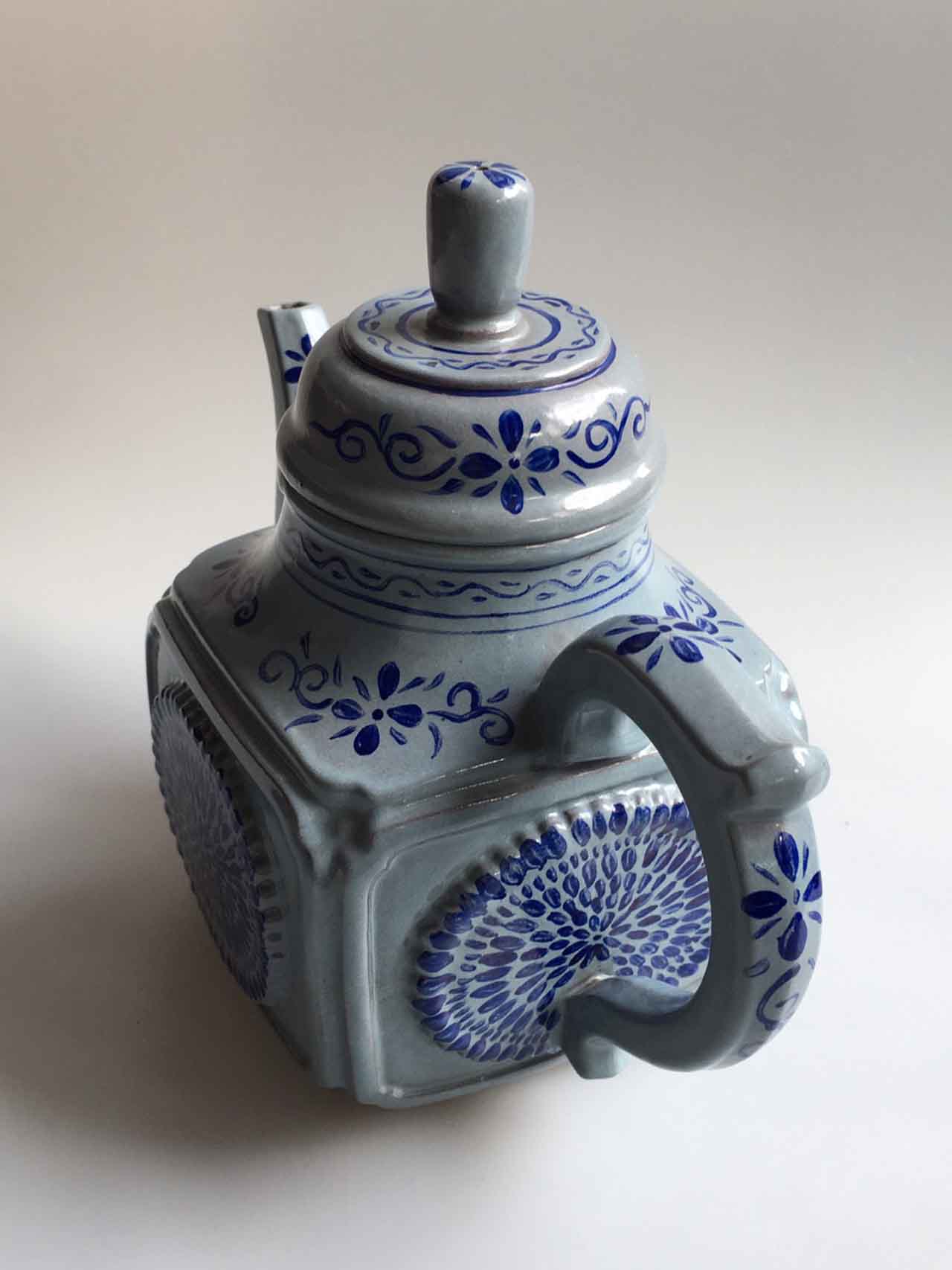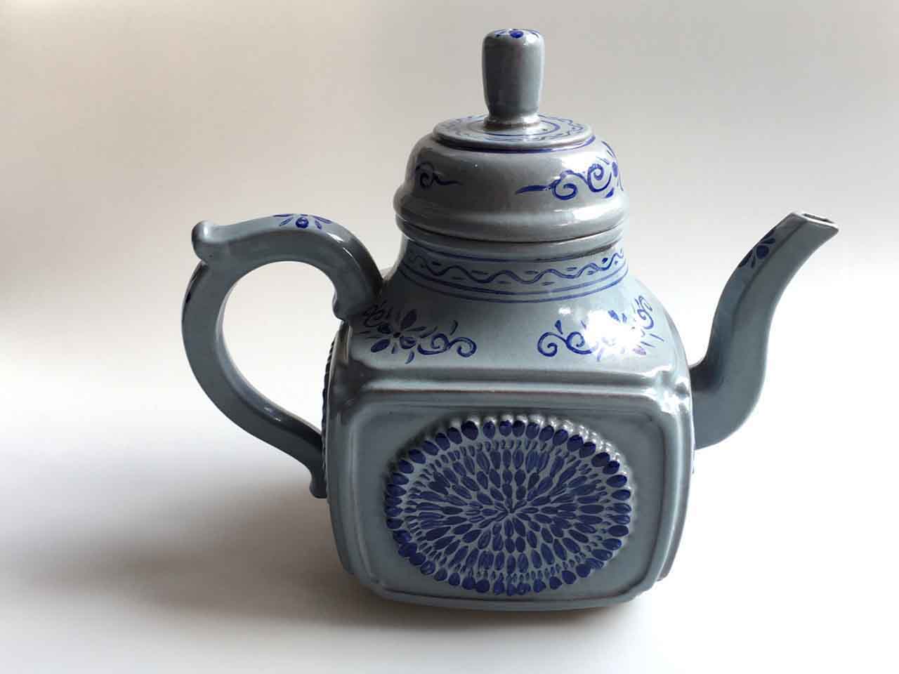此壺十多年前從跑兩岸的壺商手上收到,當時只是驚嘆這壺的作工繁複,老紫砂、飛扣把、六角流、盔蓋、高柱鈕、四方折角、開光、滿爐鈞釉、點菊瓣藍彩,這樣的工藝不是傳統的個人工作室所能完成的,一定要是群組以上的工作坊才能完成,雖然一定是清代的產物,但是斷代到何時還需要考證。