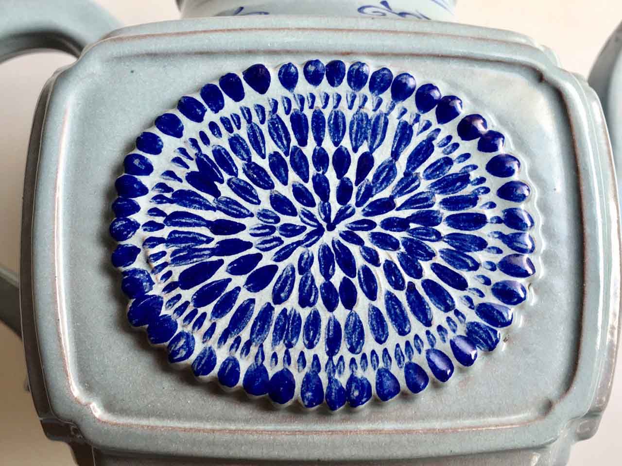 之後,在台北故宮博物院收藏的「康熙畫琺瑯菊花方壺」上(高9.6公分、口徑6公分),以及北京故宮博物院舊藏的「雍正款鈞釉菊瓣壺」(高8.2公分,口徑7公分,足徑7公分)都看到同樣菊花紋的畫法。