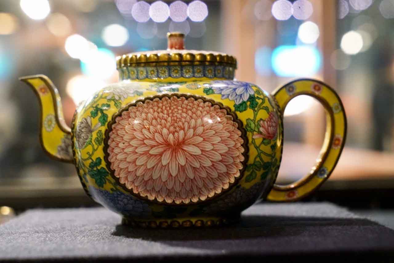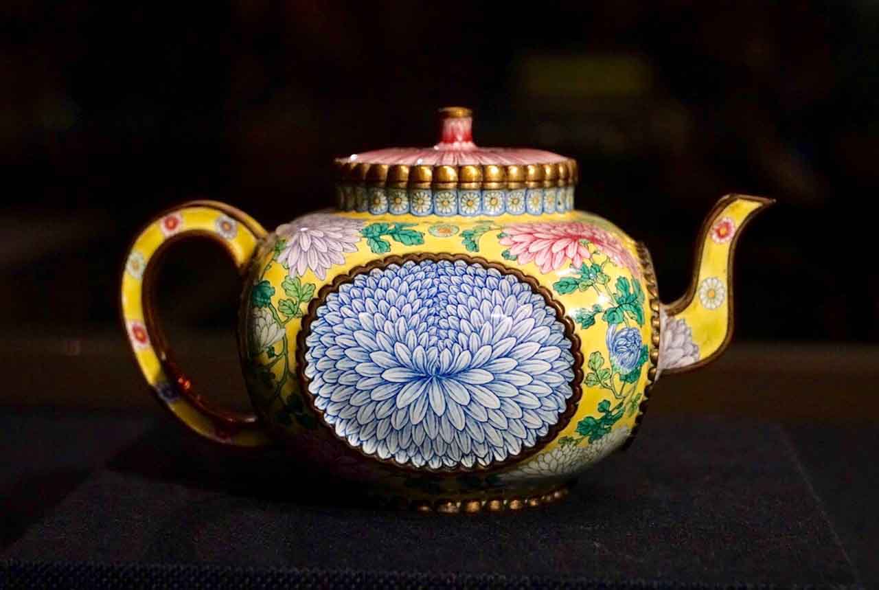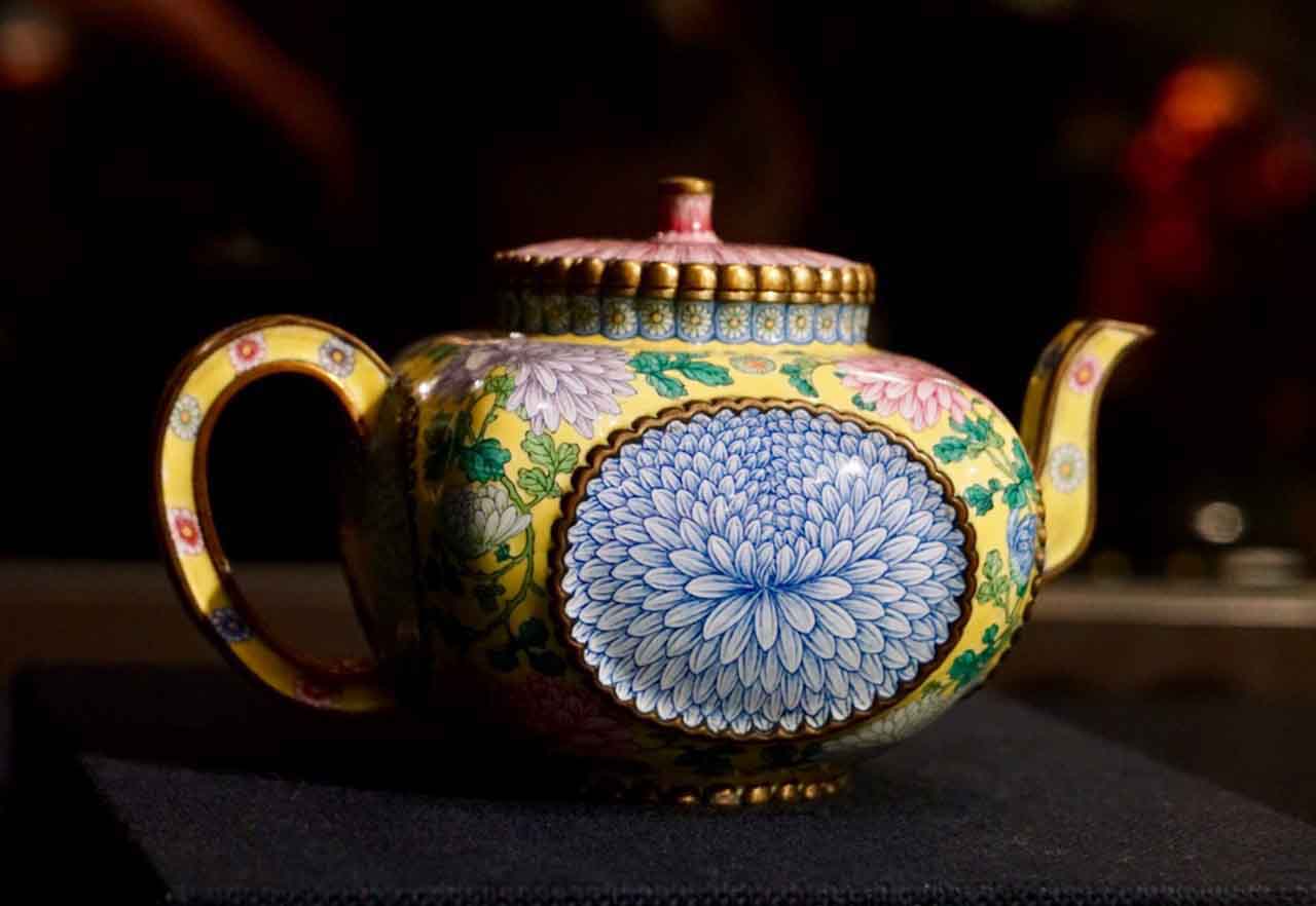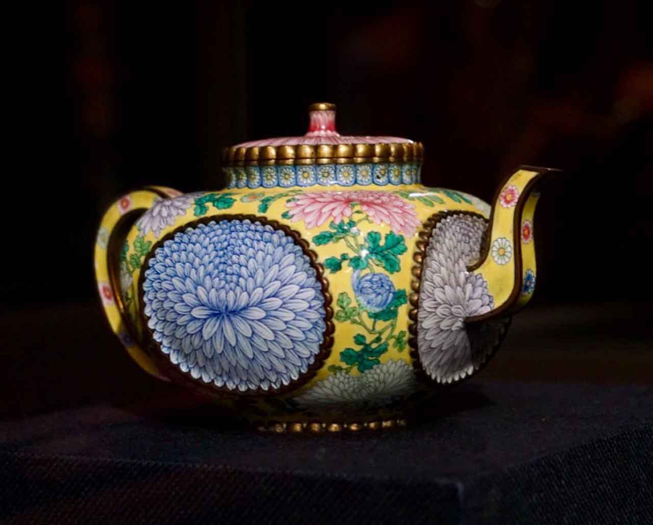尤其因為康熙皇帝對琺瑯彩的情有獨鍾,使得本在銅胎上的琺瑯彩被移植到紫砂壺上。據《乾清宮琺瑯、玻璃、宜興瓷胎陳設檔》記載其基本工藝流程是:光素紫砂壺由宜興藝人做好燒成,然後送進宮內造辦處在素壺上進行加釉彩飾,二次燒造而成。琺瑯彩紫砂壺常有牡丹、錦葵、萱草、野菊等花卉紋裝飾,色彩金黃,富麗堂皇,底款常為“康熙御製”四字。