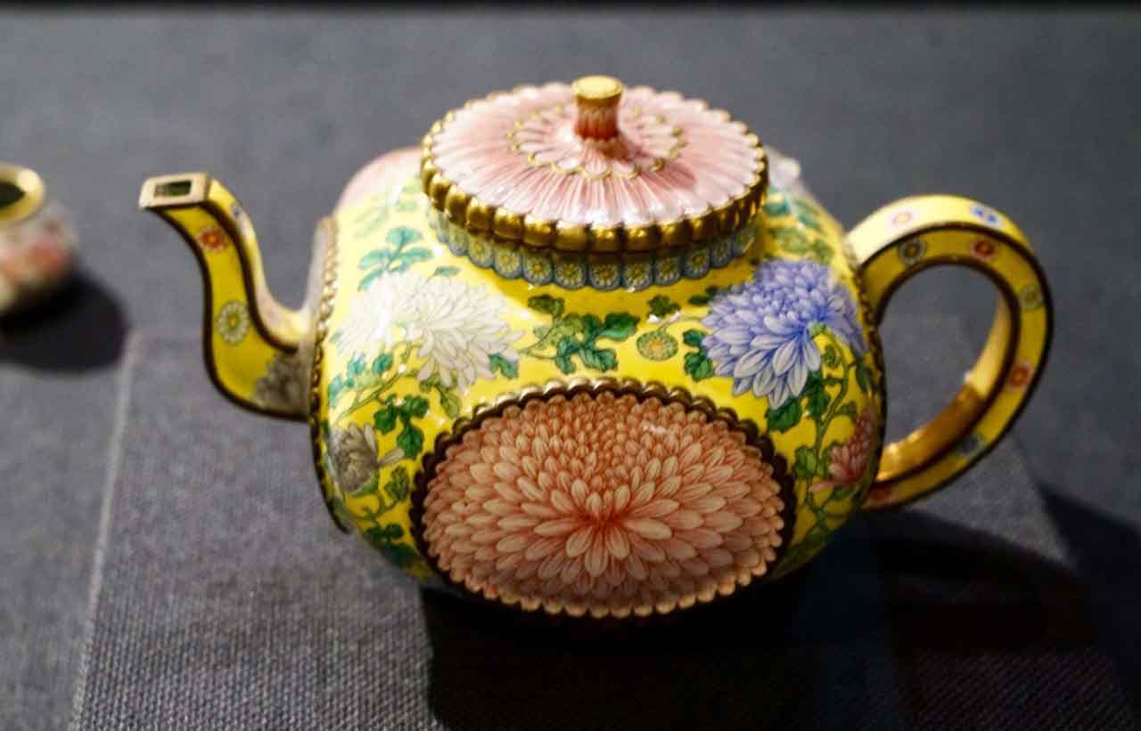 《清宮內務府造辦處活計檔》記載:「雍正七年八月初七日據圓明園來帖內稱,閏七月三十日郎中海望持出菊花瓣式宜興壺一件,奉旨:作木樣交年希堯,照此款式作鈞窯,將霽紅、霽青釉色燒造。」北京故宮博物院舊藏的「雍正款鈞釉菊瓣壺」就是當時根據宜興菊瓣壺照製的典型作品,此外,還製作了掐絲琺瑯菊石紋小圓盒,雍正十一年燒製的十二色菊瓣盤等各種以菊花為題材的宮廷器物。