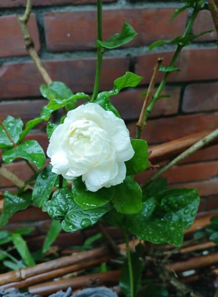 好一朵美麗的茉莉花不怕下雨, 還綻放。