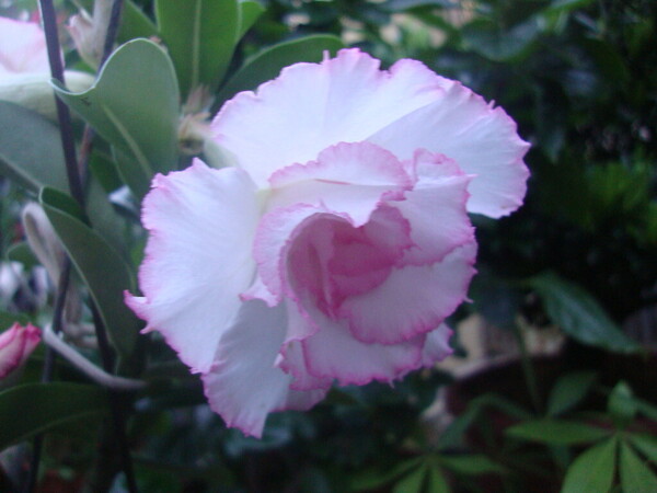 沙漠玫瑰屬於小喬木,在原產地可長至2米高。沙漠玫瑰基部肥大,肉質的莖部短而粗,針形的葉互生在莖部分枝頂端,葉片正面深綠色,背面淡綠色而且比較粗糙。花期在春末至秋季,花粉紅至紅色,成傘形花序,2~10朵呈五星漏斗狀集在枝頭。