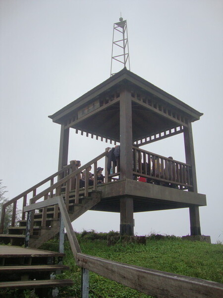 緩步拄杖邁向山巔亭台