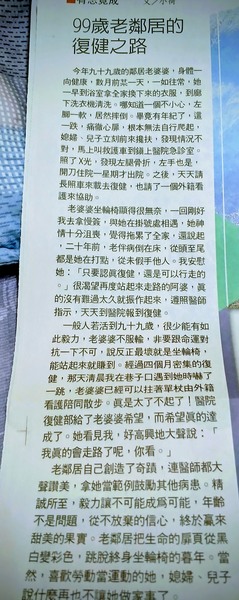 一般人若活到九十九歲,很少能有如此毅力,老婆婆不服輸,非要跟命運對抗一下不可。說反正最壞就是坐輪椅,能站起來就賺到。想都沒想過,經過四個月密集的復健,那天清晨我在巷子口相遇時嚇了一跳,老婆婆已經可以拄著單杖由外傭陪同散步。真是太不可思議太了不起了。醫院復健部給了希望,而希望真的達成了。她看見我,好高興好大聲說「我真的會走路了呢,你看。」