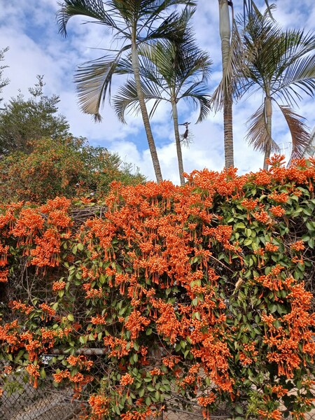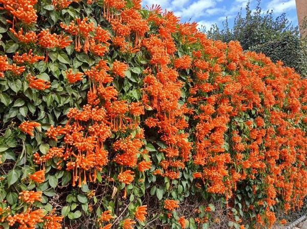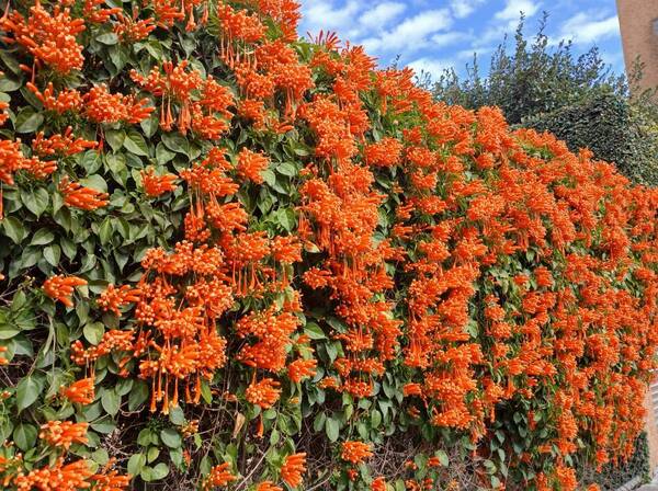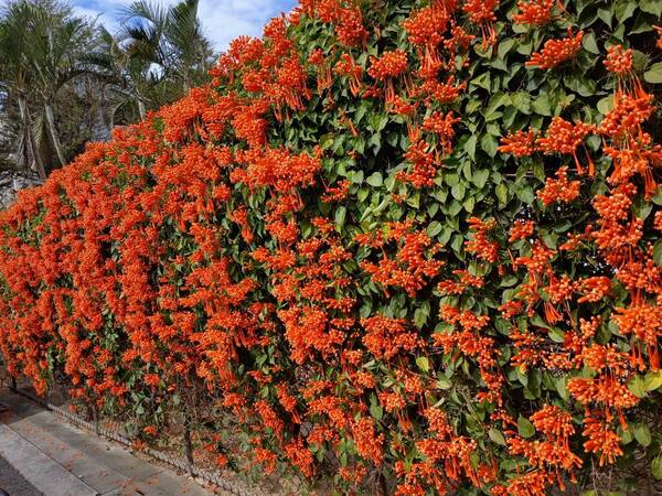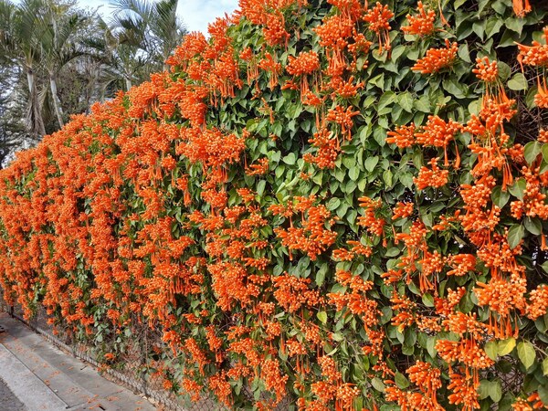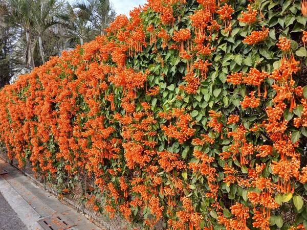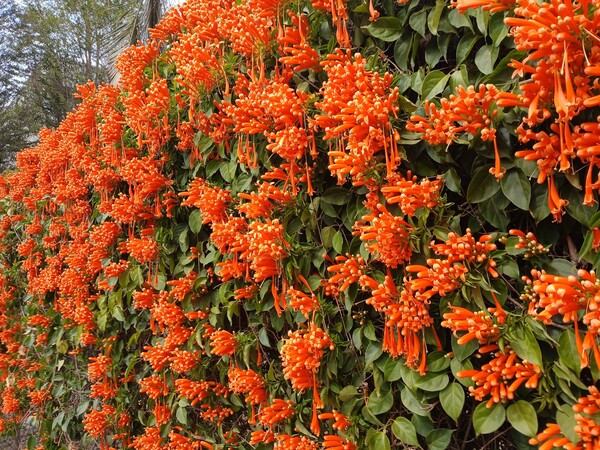 炮仗花屬於攀緣性灌木,捲鬚三裂,為綠廊、棚架之最佳材料,也可牽引作籬笆牆垣,甚至屋頂、牆壁及地面的遮覆物用,生長勢強,覆蓋速度快。炮仗花的花,纍纍成串,並呈現討喜的大橘紅色,花苞為筒狀,就像"炮筒"也像小喇叭一樣蓄勢待發,而花開後花瓣略為反捲,露出黃色的花藥,充滿朝氣,每次花期也都在過年前,就像成串的鞭炮,因而得名。