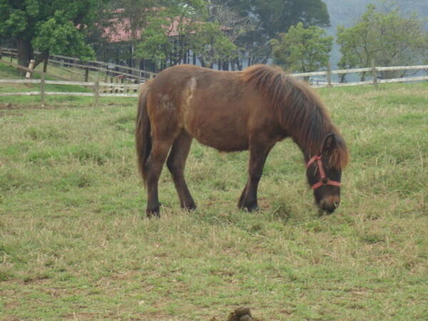 馬兒低頭吃草。你瞧,牠也許懷孕囉?