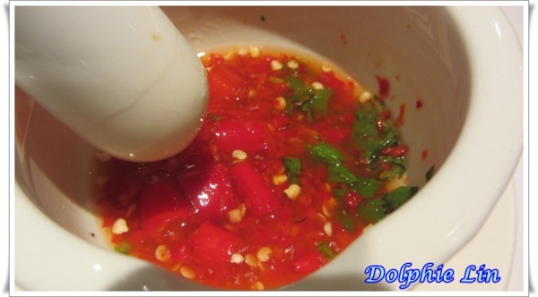 以上的菜餚都不太辣,如果嗜辣的朋友覺得不夠辣,這裡還貼心準備泰式辣椒水,還可以自己槌來玩,如果一起吃飯的人,不小心惹到你,還可以槌這個出氣,還挺有趣的。