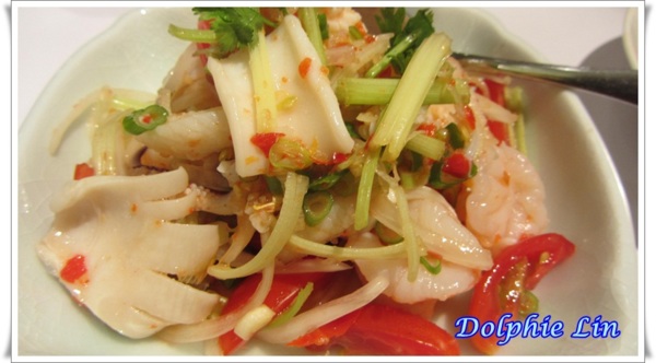 花枝沙律330元,這個是涼拌菜,芹菜和番茄這兩個蔬菜是豆豆很喜歡的,拌在裡頭的酸甜和芹菜的特殊香氣,讓整道菜再往上加分,這是豆豆第一次吃這樣的泰國菜,以下呈現的料理都是豆豆很少吃過,挑戰不一樣的勇氣。