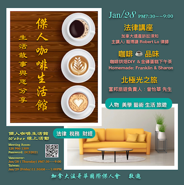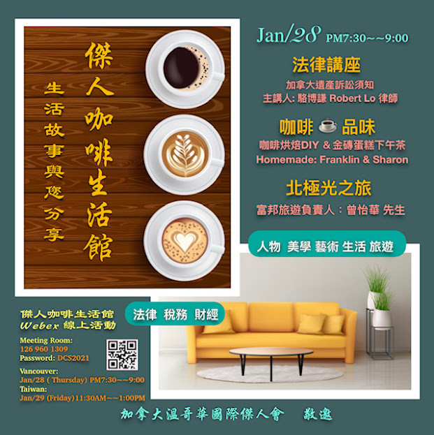 由「加拿大溫哥華國際傑人會」企劃的 【傑人~咖啡~生活館】系列線上Webex 節目 將於Jan/28 /2021(星期四)上線,節目內容精彩豐富,還有精美的抽獎活動。