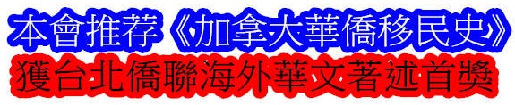 [溫哥華2015/10/13訊]台北華僑救國聯合總會104年海外華文著述獎揭曉,由加拿大華文作家協會推荐的黎全恩、丁果、賈葆蘅等三人共同著作《加拿大華僑移民史》獲得學術論著社會人文科學類首獎。並定於12月12日晚上在列治文粵海山莊海鮮酒家的台灣各大學加西校友聯會的聖誕餐舞會上,由駐溫哥華台北文化經濟辦事處處長莊恆盛代表僑聯會頒獎。