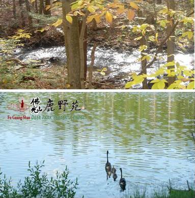 鹿野苑與大自然共生的景象,不止於此。大清早,湖面煙波氤氳,大雁嗄榎叫嚷著划過湖面,撩撥水花隱沒在晨曦之中。成群水瀨在岸邊忙活兒,時不時地給來此間出坡的義工們找些麻煩事。頗有挑釁的意味。午休之後,向山林小瀑布走去,享受叢林芬多精,讓身心靈都浸沐在大自然的懷抱之中。(轉載自「北美華文作家協會2012年代表大會手冊」)