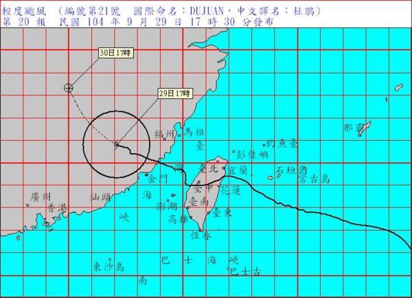 (二)第201521號颱風於9月27日8時30分發佈海上颱風警報,同日17時30分發佈陸上颱風警報,並增強為強烈颱風;28日10時左右臺灣陸地開始進入暴風圈, 17時40分中心由宜蘭南澳鄉登陸,中心登陸後受地形影響開始減弱,並沿東部沿岸往南行進後,於花蓮附近穿越中央山脈往西南西,23時過山後到達彰化陸地,已減弱為中度颱風;29日1時左右於彰化縣芳苑鄉出海 ,10時左右中心由金門北方進入福建,11時30分解除臺灣本島陸上颱風警報,1 7時30分解除颱風警報
